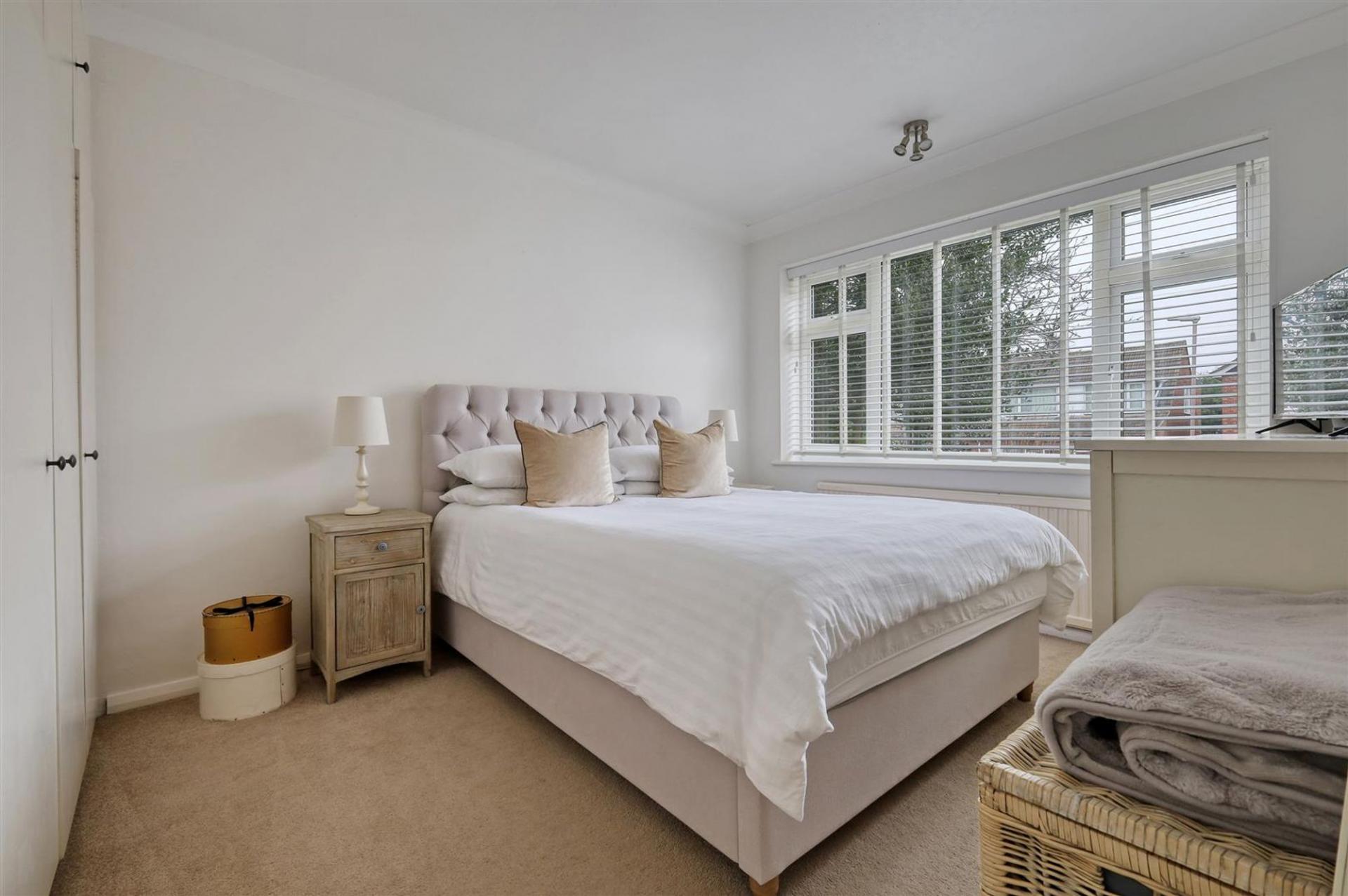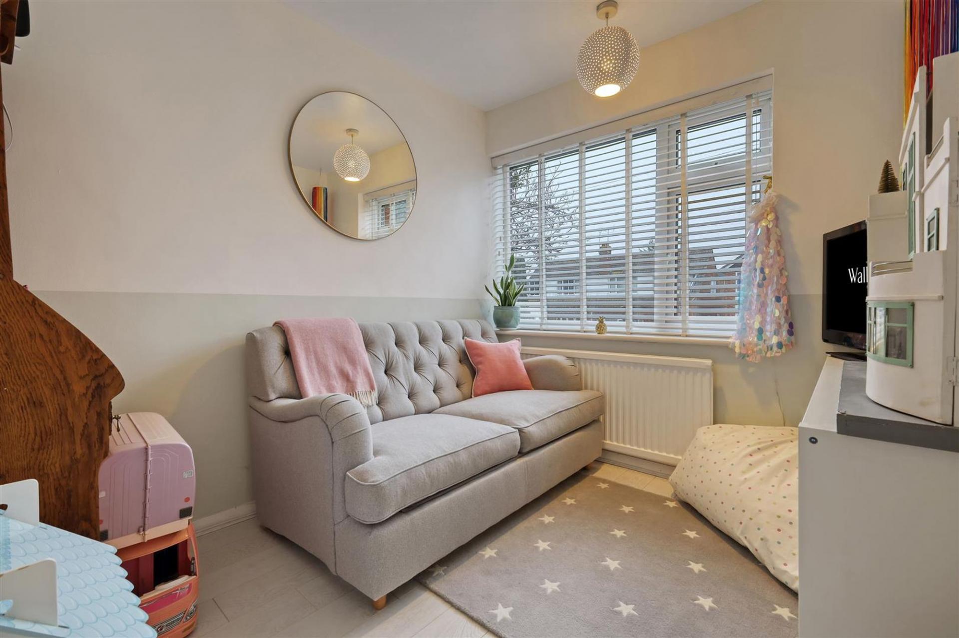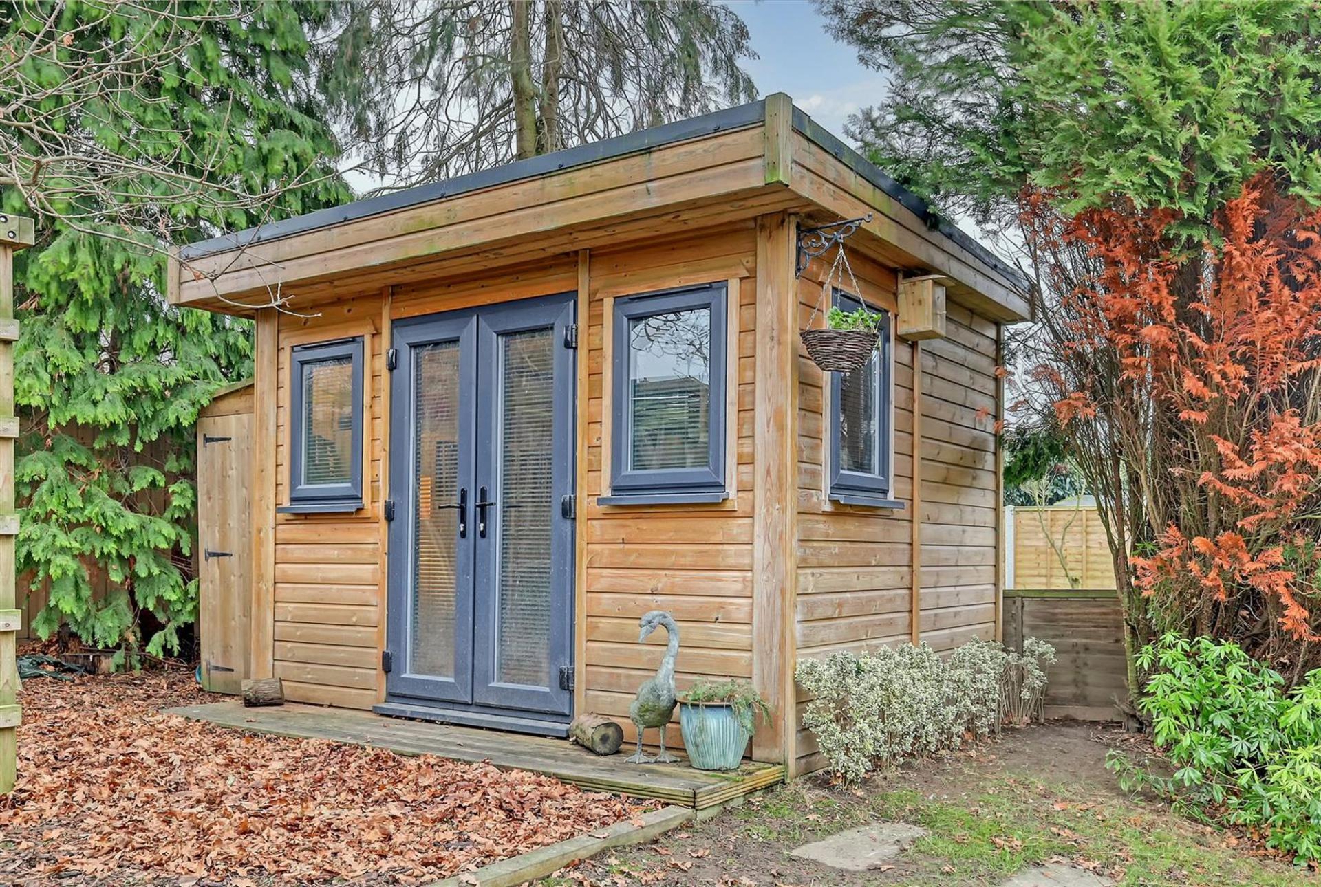 The well sized rear garden is mainly laid to lawn, complemented by a patio area, shrubs, and flower beds, offering a peaceful outdoor space.