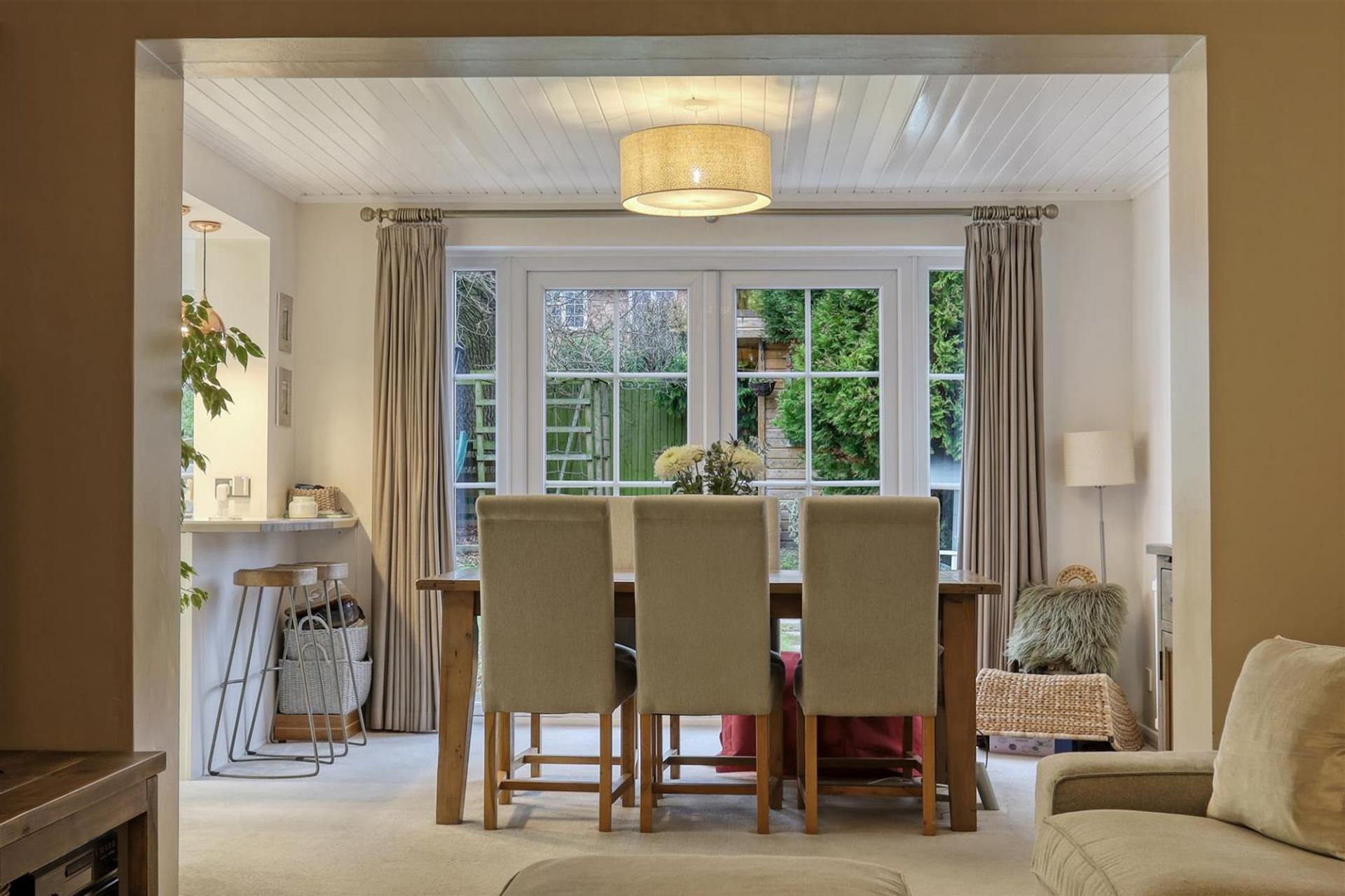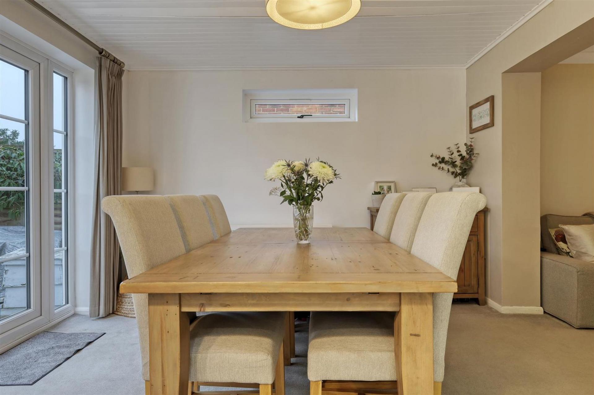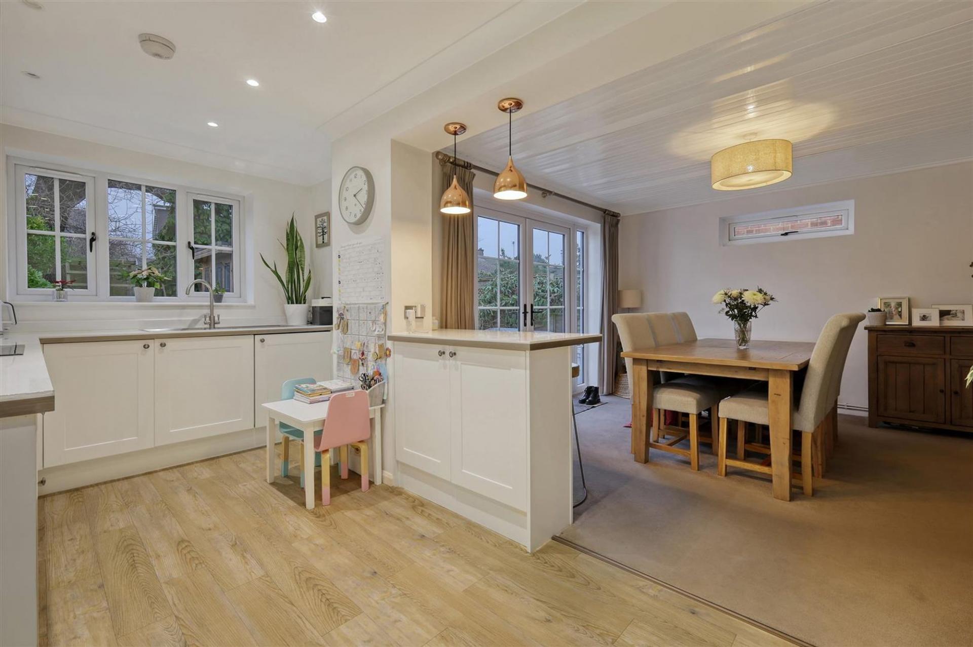 The side entrance leads to a porch and entrance hall, giving access to three bedrooms, including the principal bedroom with fitted wardrobes, and a newly fitted bathroom. The living space has been extended to create a spacious, open-plan lounge, dining, and kitchen area. The recently fitted kitchen includes integrated appliances, shaker-style units, breakfast bar. The dining area complete with French doors opening onto the rear garden.