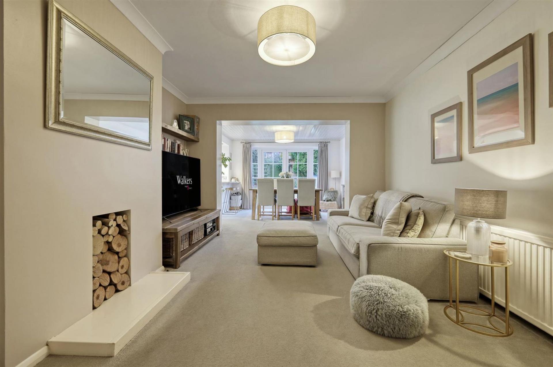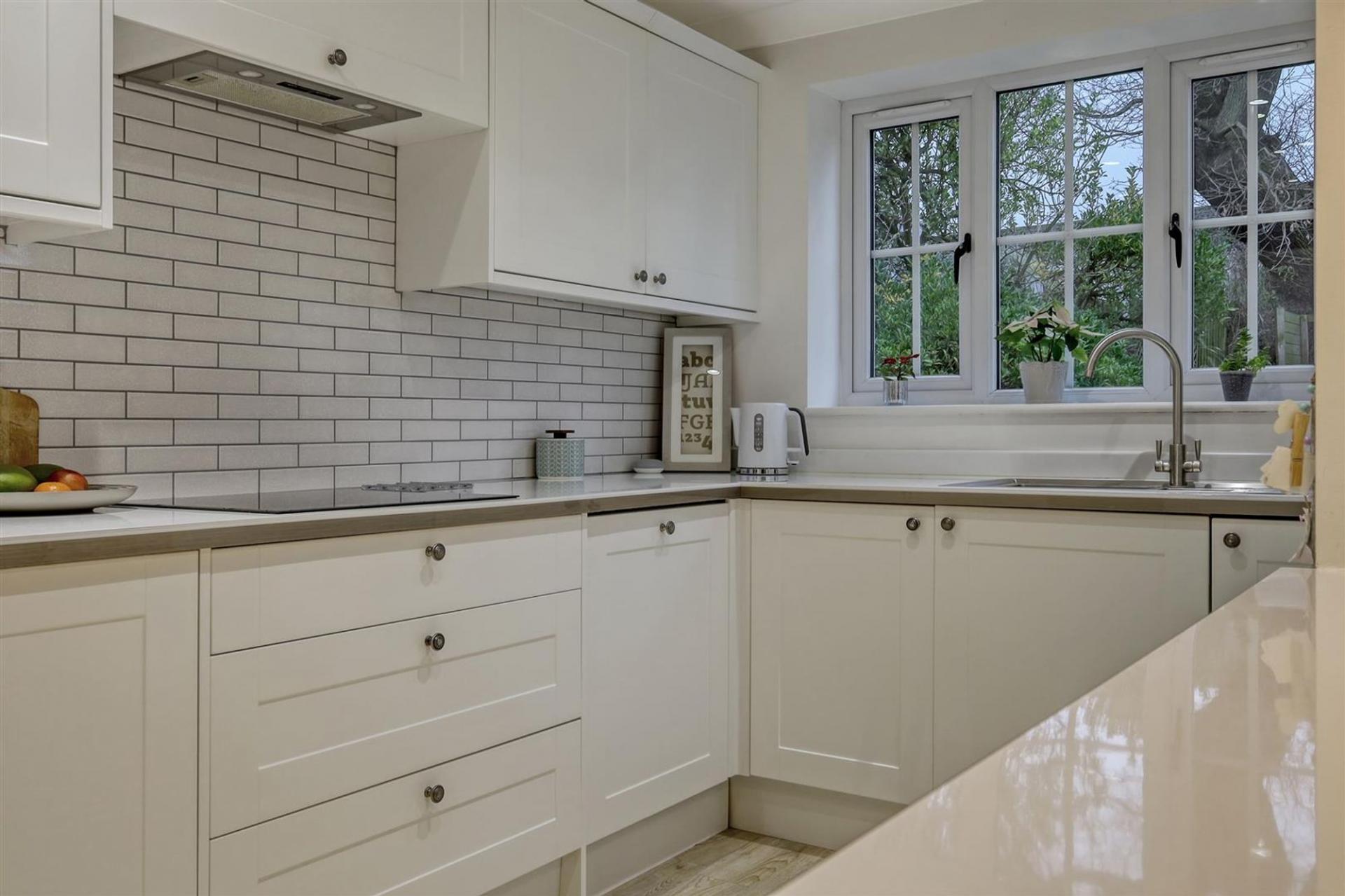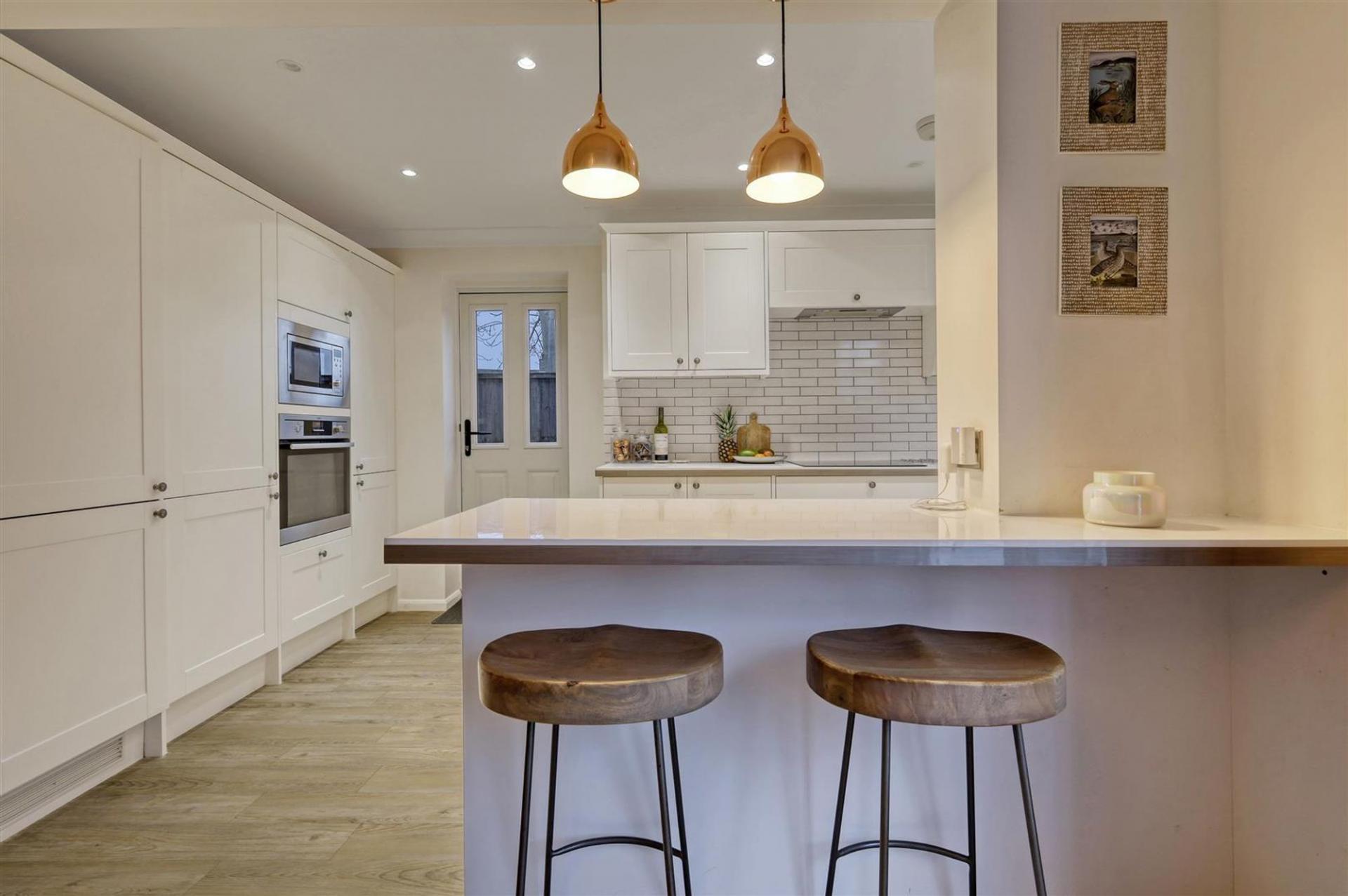 The side entrance leads to a porch and entrance hall, giving access to three bedrooms, including the principal bedroom with fitted wardrobes, and a newly fitted bathroom. The living space has been extended to create a spacious, open-plan lounge, dining, and kitchen area. The recently fitted kitchen includes integrated appliances, shaker-style units, breakfast bar. The dining area complete with French doors opening onto the rear garden.