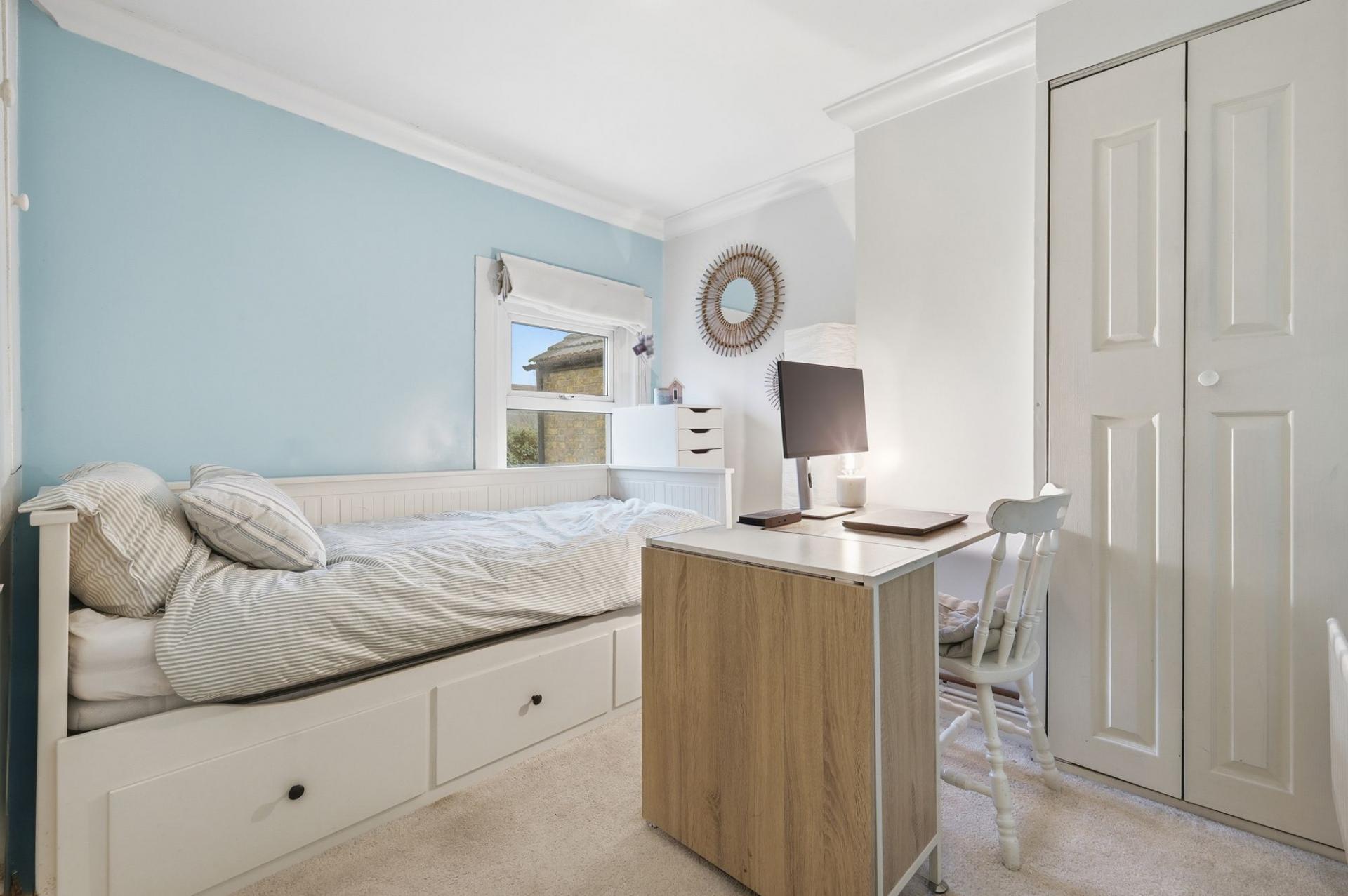 Upstairs, the property features two generously sized bedrooms, each thoughtfully shaped to offer flexibility for sleeping, working, or additional storage needs. Large windows provide a pleasant influx of natural light, enhancing the calm and restful ambiance throughout the first floor.