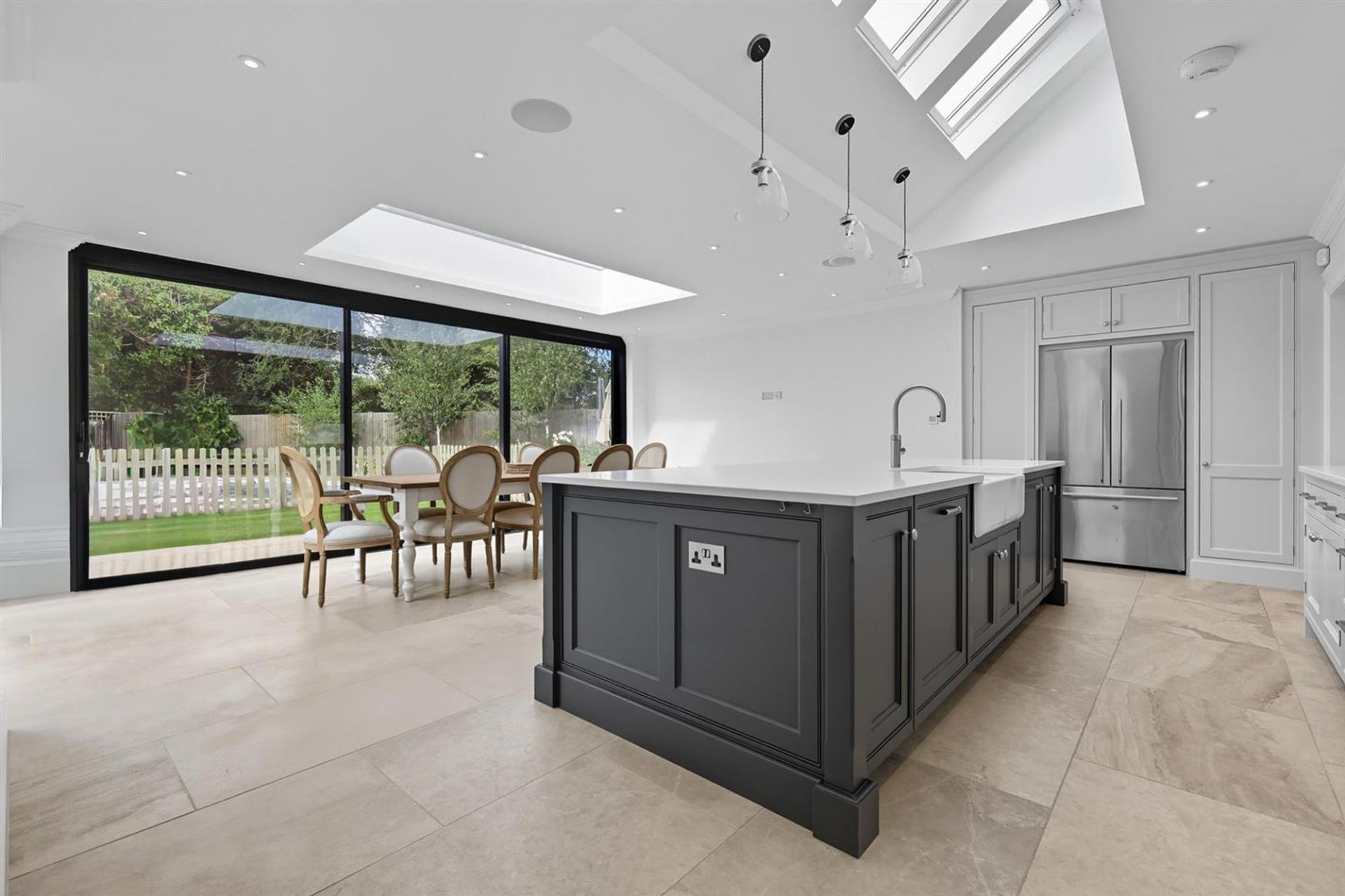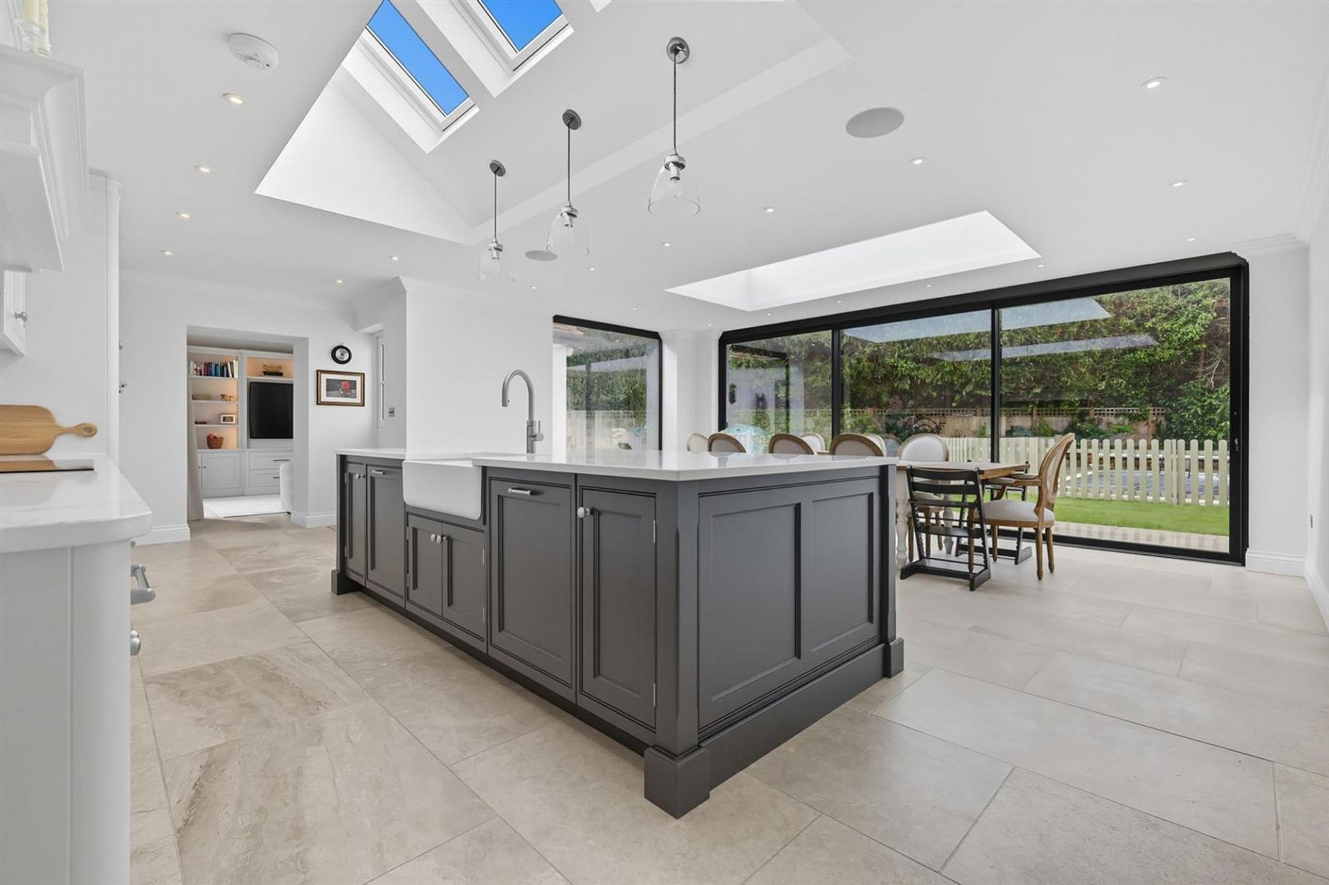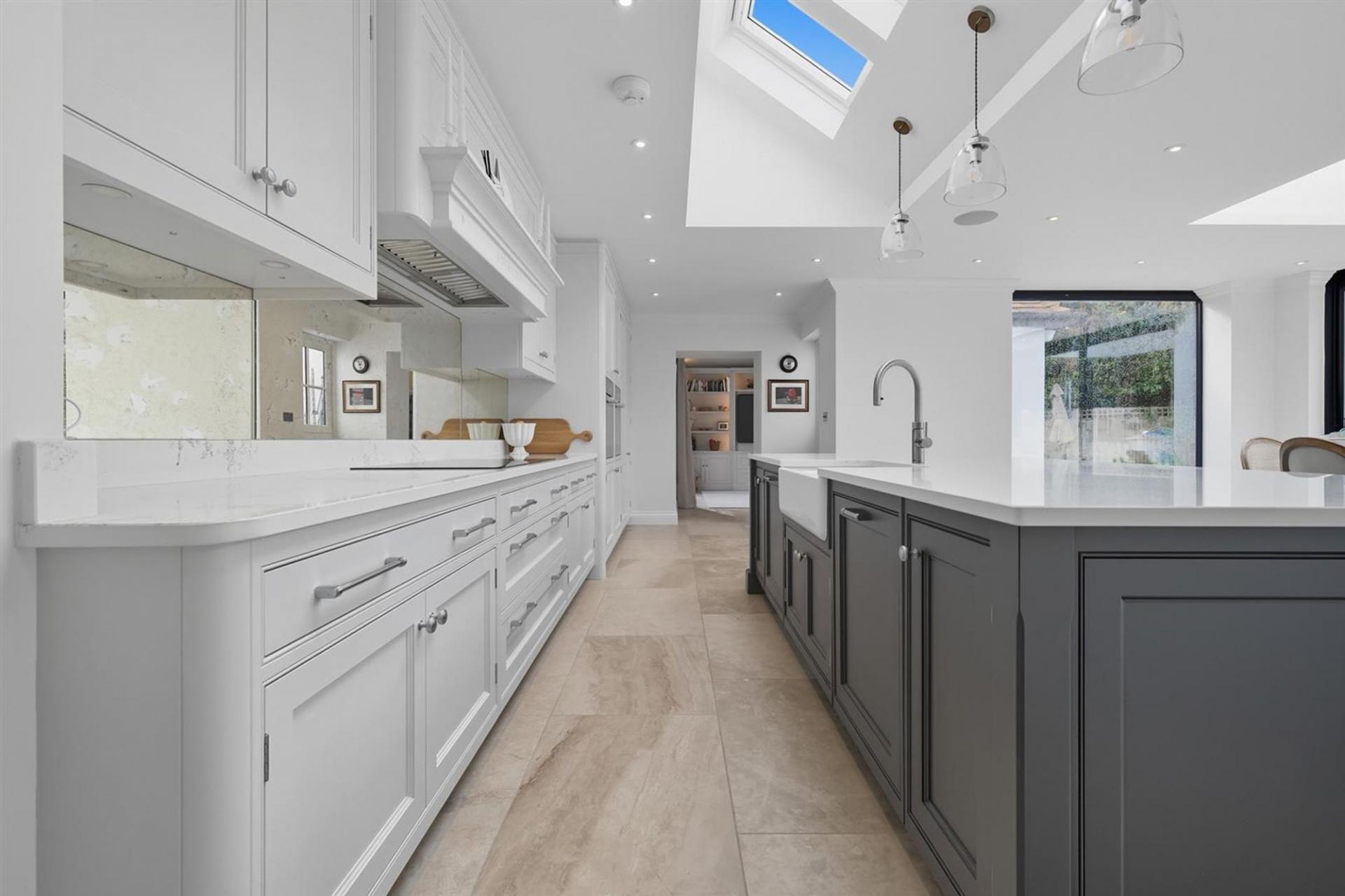 Moments from Ingatestone village, yet surrounded by picturesque countryside and footpaths leading to local favourites such as The Cricketers and The Viper, the location perfectly balances village life with privacy and convenience. Inside, natural light floods the space through an abundance of glass and solar-powered Velux windows, complemented by vaulted ceilings in the entrance hall, snug, and principal bedroom suite. A striking architectural kitchen extension contrasts elegantly with the home’s traditional exterior, whilst features include bespoke cabinetry by Davenport, floor to ceiling aluminium sliding doors, and Lusso Stone fittings throughout the bathrooms, including stone baths and sinks.