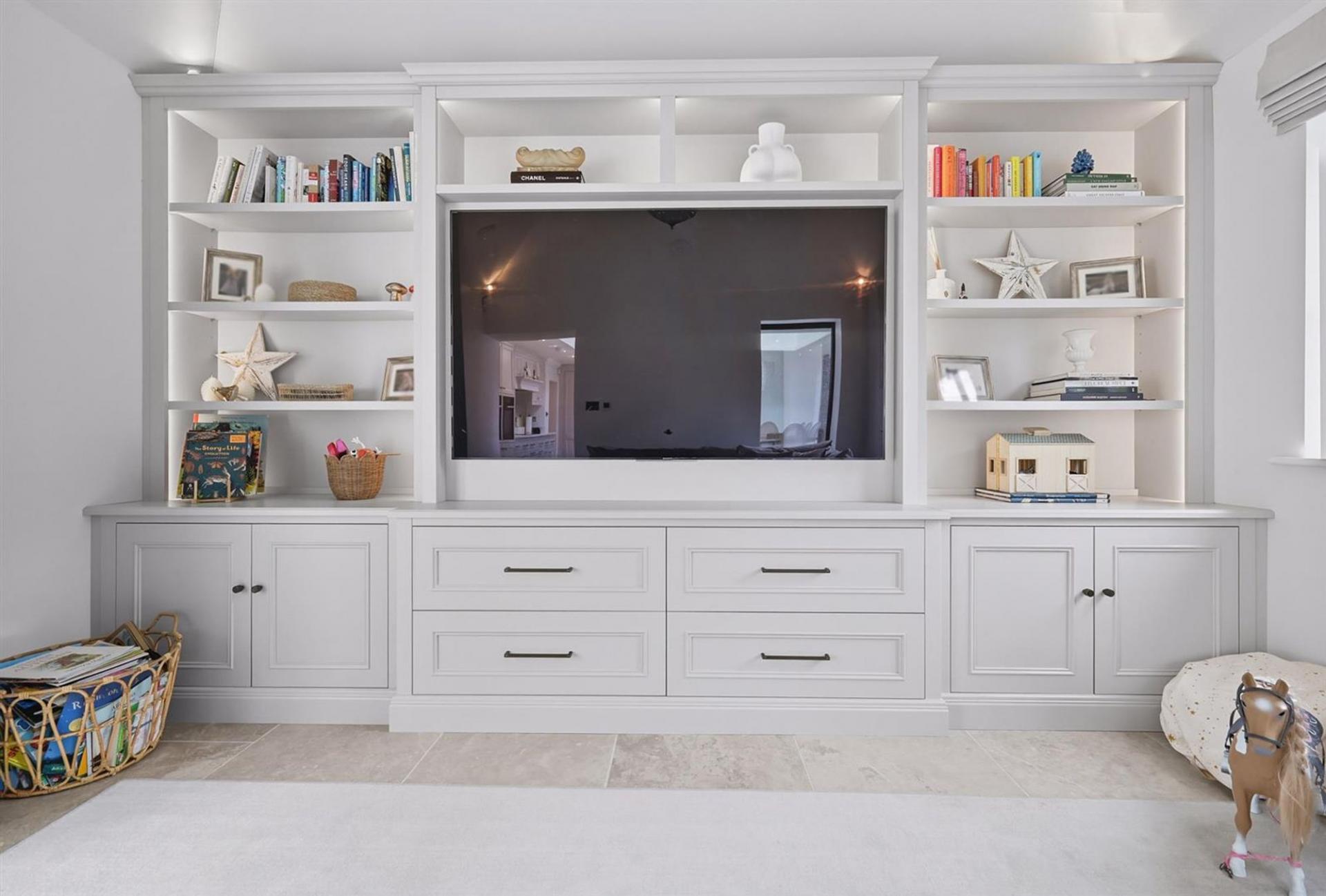 Attention to detail is exceptional, from the handmade clay roof tiles and bespoke timber windows by Trustwood, to custom joinery by Michael Bysouth across the utility, snug, and storage areas. The house also benefits from underfloor heating, Italian designer radiators, Bose ceiling speakers, and full smart security with cameras and alarm system. The master suite is a particular highlight, with vaulted ceilings, a secret door to its en-suite, bespoke wardrobes, and a plumbed air-conditioning system ready for installation.