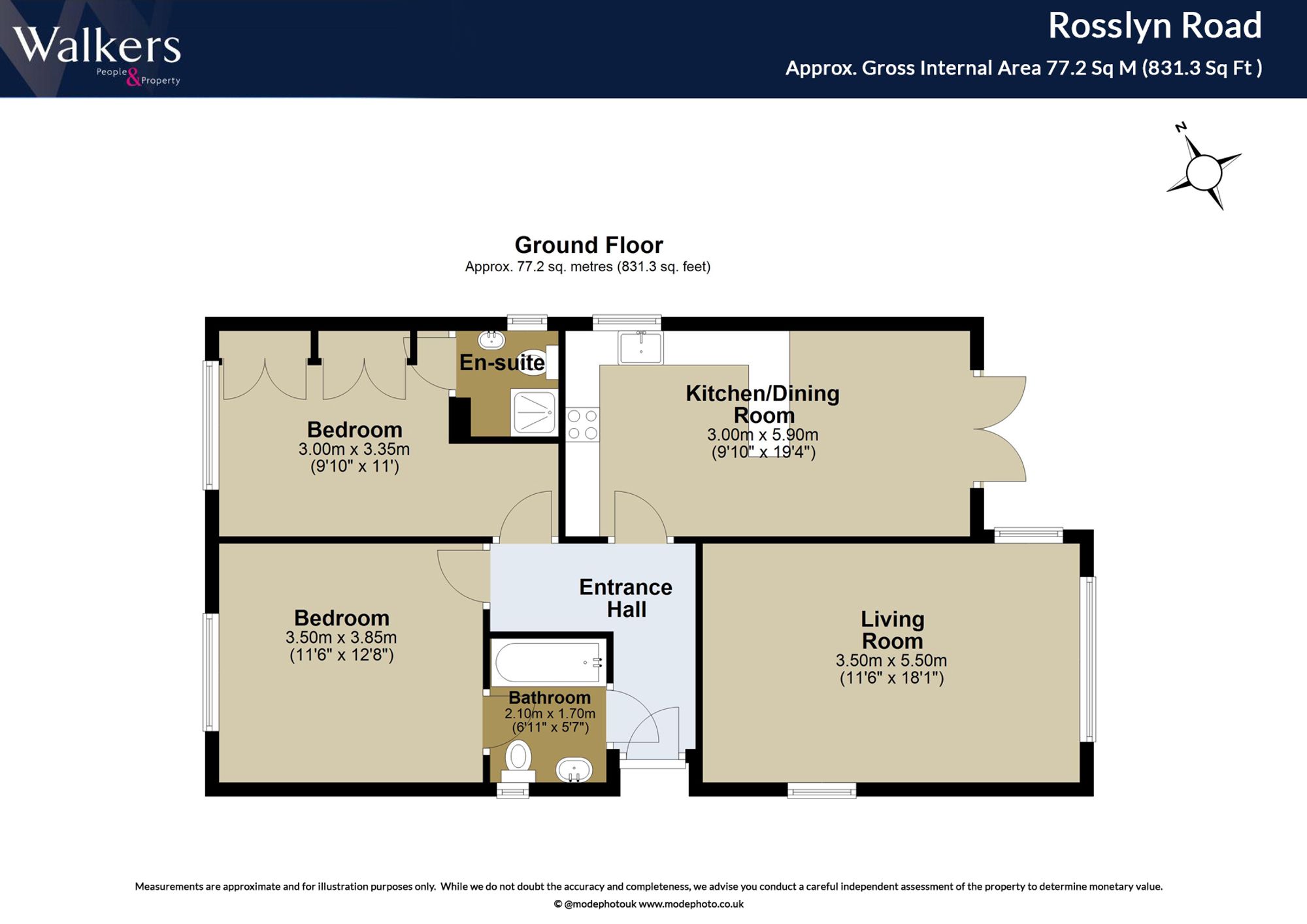 Internally, the bungalow is thoughtfully laid out, offering bright and well-proportioned accommodation throughout. The welcoming entrance hall leads you into a generously sized living room, perfect for relaxation or entertaining, while the adjoining kitchen/dining room provides a functional and inviting hub for everyday living. Two spacious bedrooms offer comfortable retreats, with the principal bedroom benefitting from its own en-suite, and a separate family bathroom serving the rest of the home.