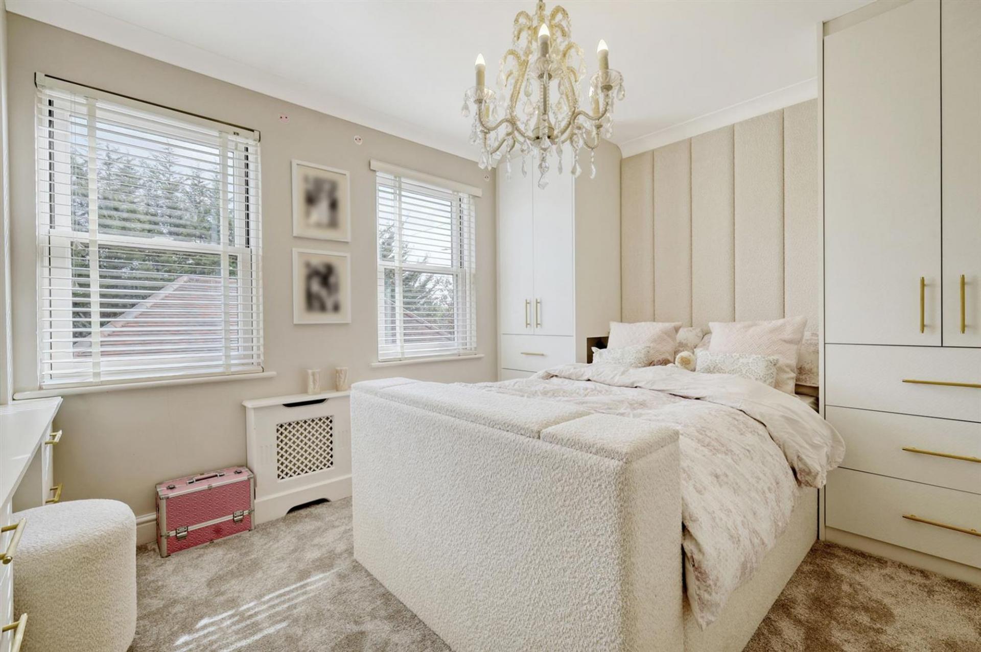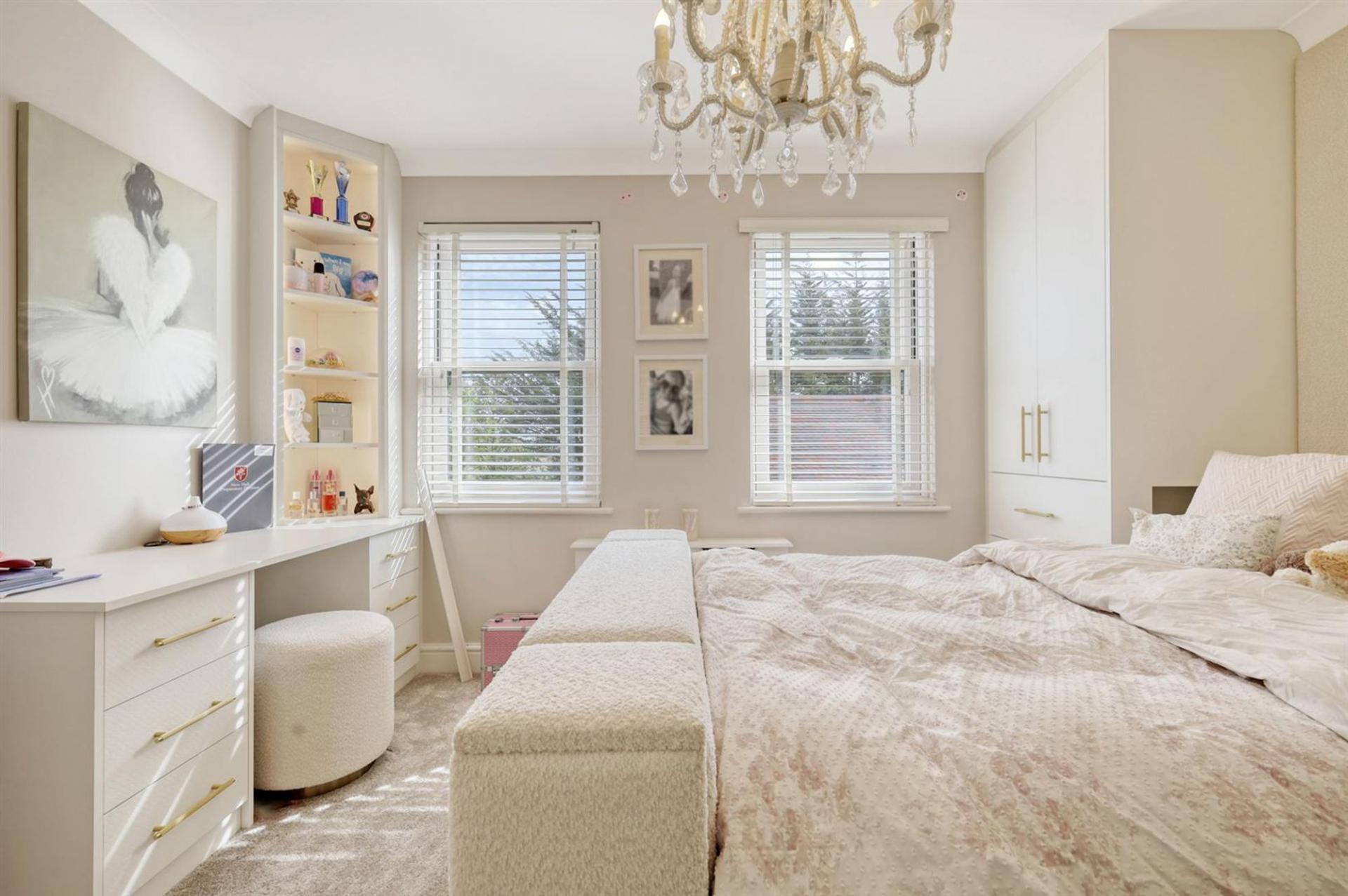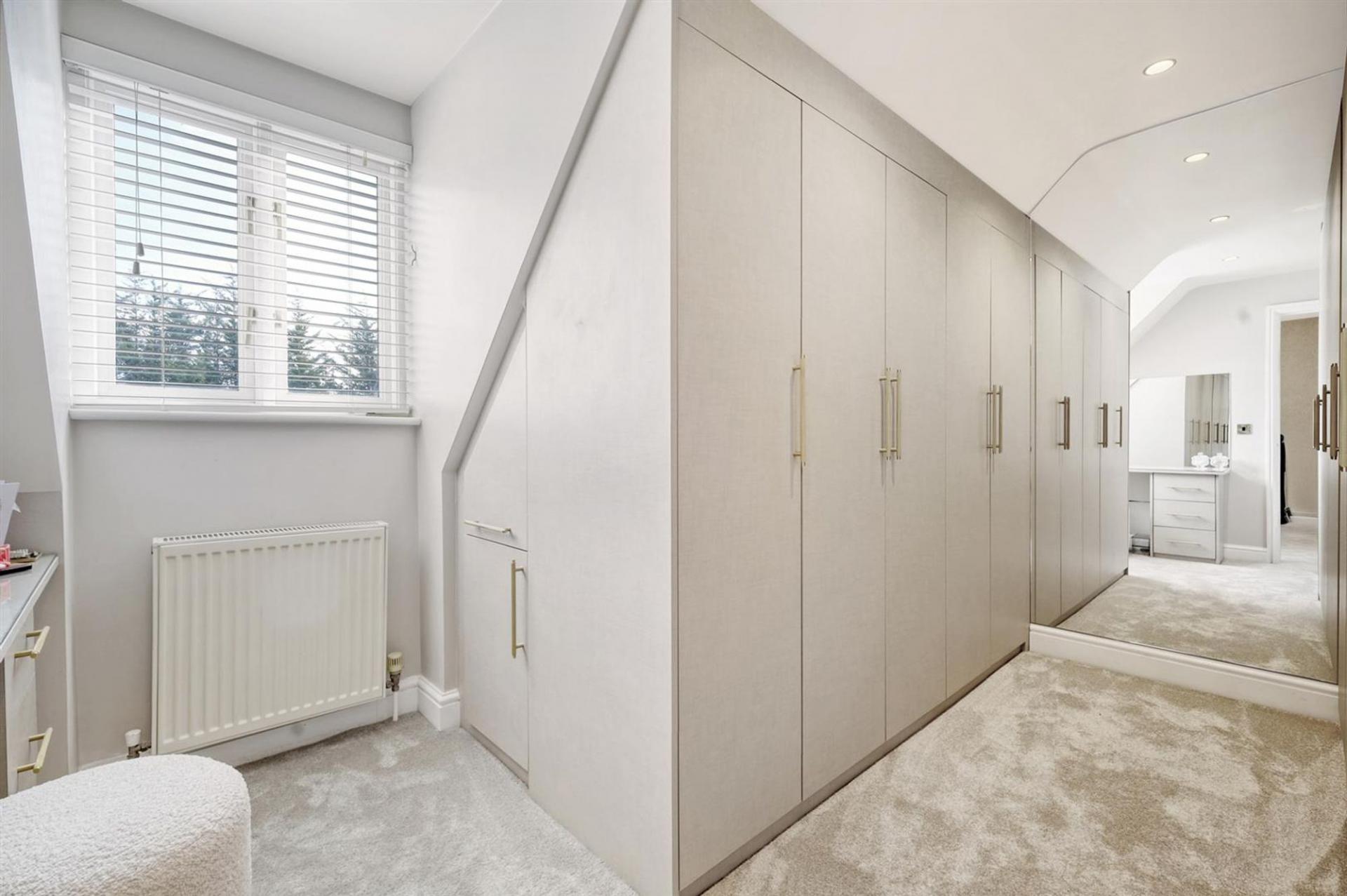 The entire top floor is dedicated to the principal suite, offering a sense of privacy and luxury. This superb space includes a large bedroom, a bespoke dressing area with fitted wardrobes, and a beautifully appointed bathroom with both bath and separate shower.