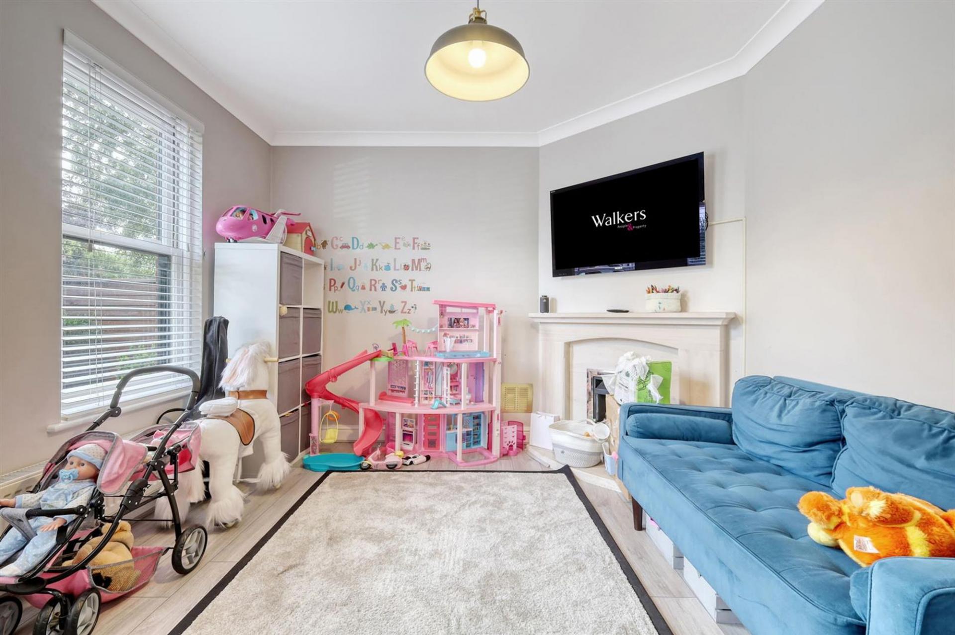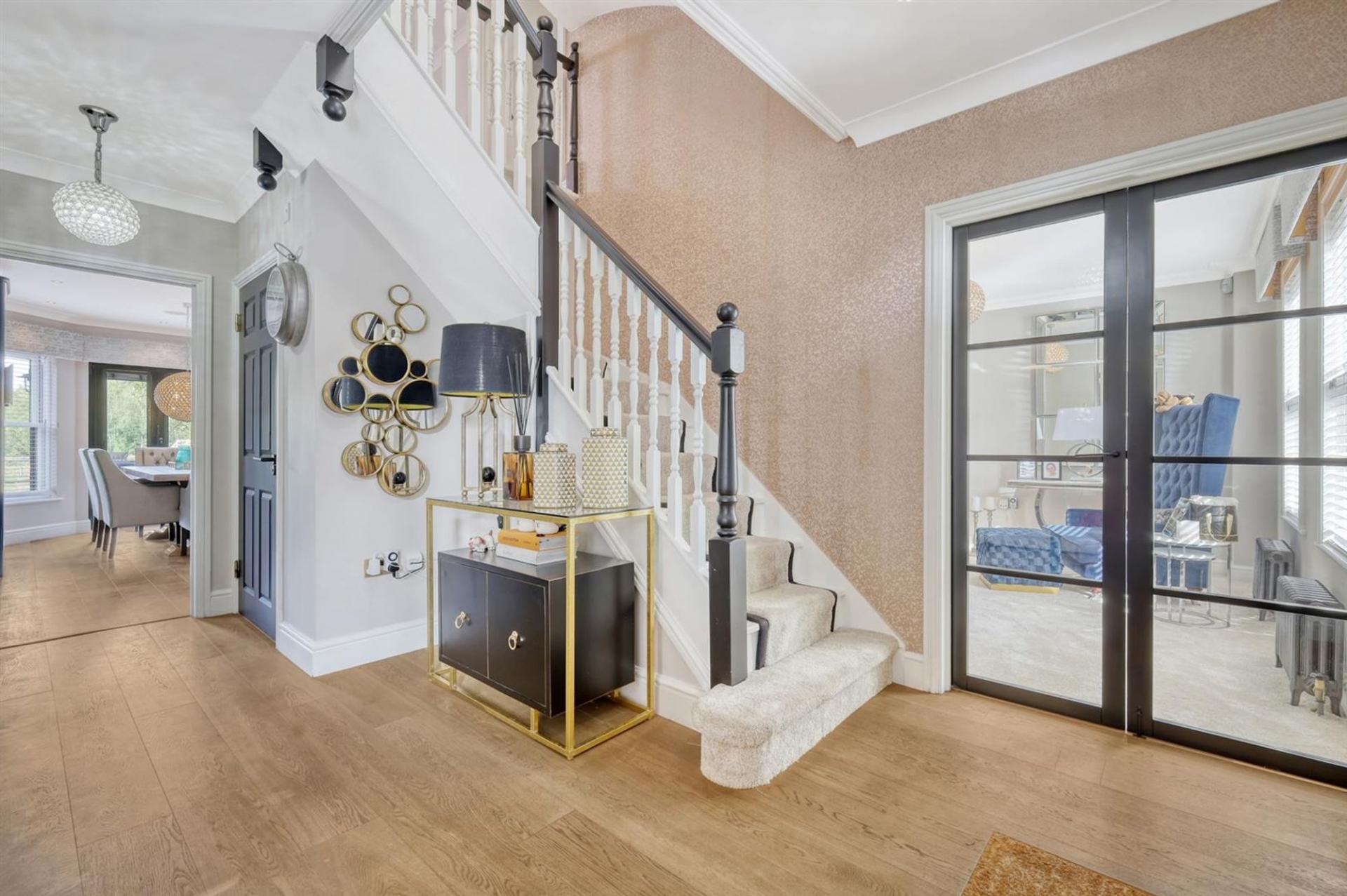 The inviting entrance hall creates an immediate sense of space and leads into three versatile reception rooms. The dual-aspect living room is a wonderful centrepiece, filled with natural light from its wide windows and French doors opening onto the garden, and centred around a stylish fireplace. A separate formal dining room provides the perfect setting for entertaining, while a further reception room serves equally well as a playroom or study.