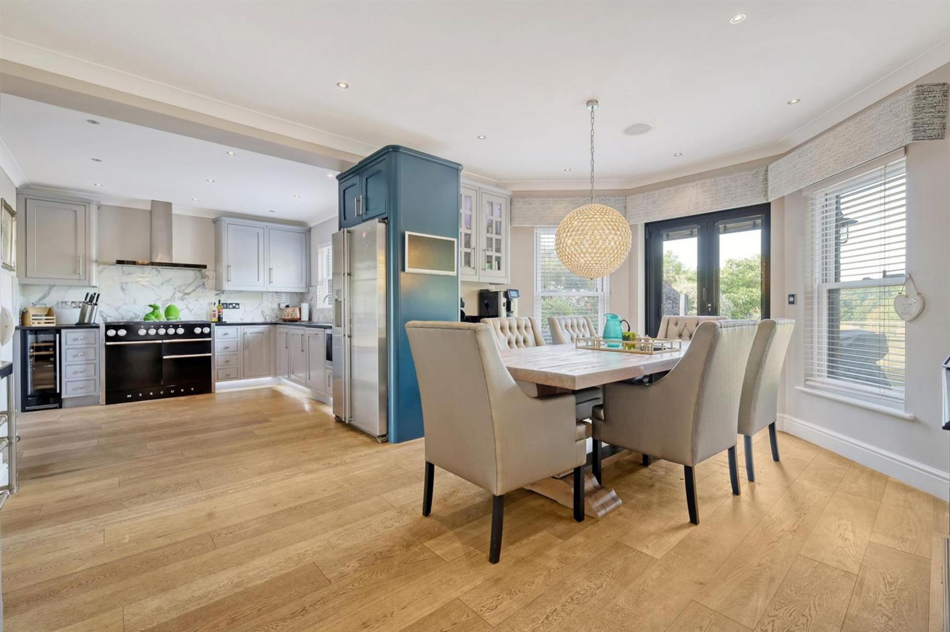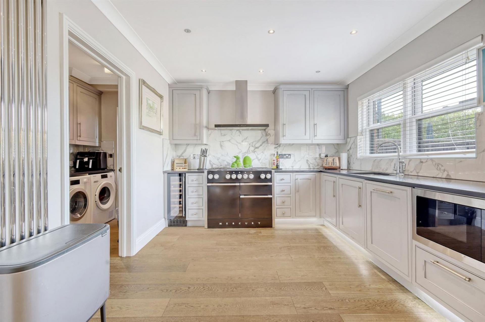 To the rear, the kitchen/breakfast room has been fitted with bespoke cabinetry and quality appliances, including a range cooker. A generous dining area makes this a sociable space for family gatherings, with doors opening directly to the terrace for effortless indoor-outdoor living. Completing the ground floor is a utility room with practical storage and appliance space, a guest cloakroom, and a large cupboard.