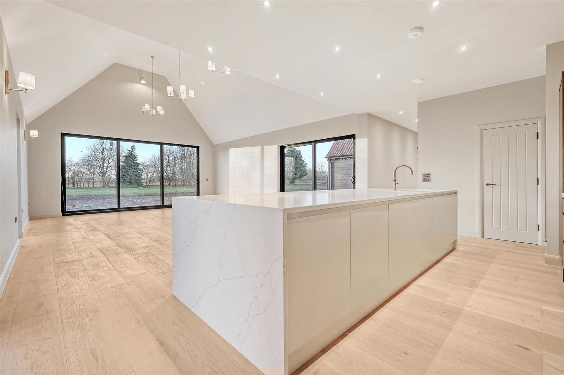 Upon entering, you are greeted by a spacious hallway that leads to a large, open-plan kitchen featuring expansive glazing and breathtaking countryside views. Adjacent to the kitchen is a dining room and lounge, perfect for both everyday living and entertaining. The ground floor also includes a utility and boot room, a convenient downstairs WC, and a dedicated home office with views of the garden. A separate snug lounge provides a cozy retreat, while a large double bedroom with an en-suite bathroom completes this level. Upstairs, a generous landing opens to five well-appointed bedrooms, including one with an en-suite bathroom. There are also three additional bedrooms and two further family bathrooms, ensuring ample space and comfort for all. This exceptional barn offers a harmonious blend of contemporary design, practical spaces, and a picturesque setting, making it the perfect family home.