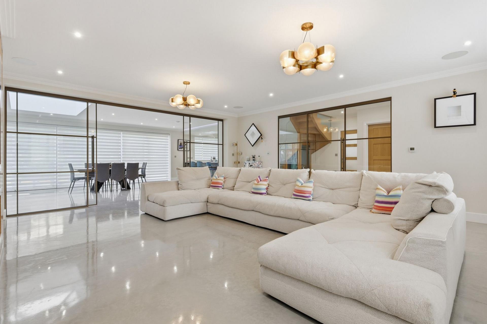 Step inside and discover a light-filled interior where space and style take center stage. The expansive open-plan kitchen and dining area forms the social heart of the home, a place to gather, cook, and entertain. With its high-specification finishes, generous proportions, and direct access to the garden, it’s a space that effortlessly adapts from everyday family life to sophisticated evening hosting. The adjoining living room offers a calm and inviting retreat, while the dedicated playroom and private study add flexibility for modern living.