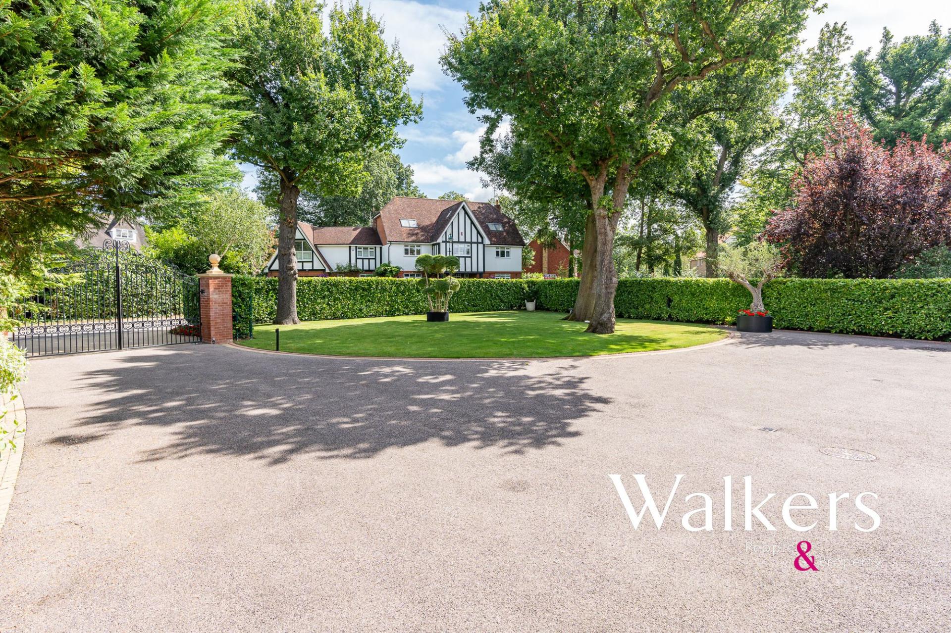 The property is approached via electric wrought-iron gates which open onto a generous driveway with access to the integral garage. The handsome frontage, with its symmetrical design, stone detailing and portico entrance, creates an immediate sense of quality and arrival.