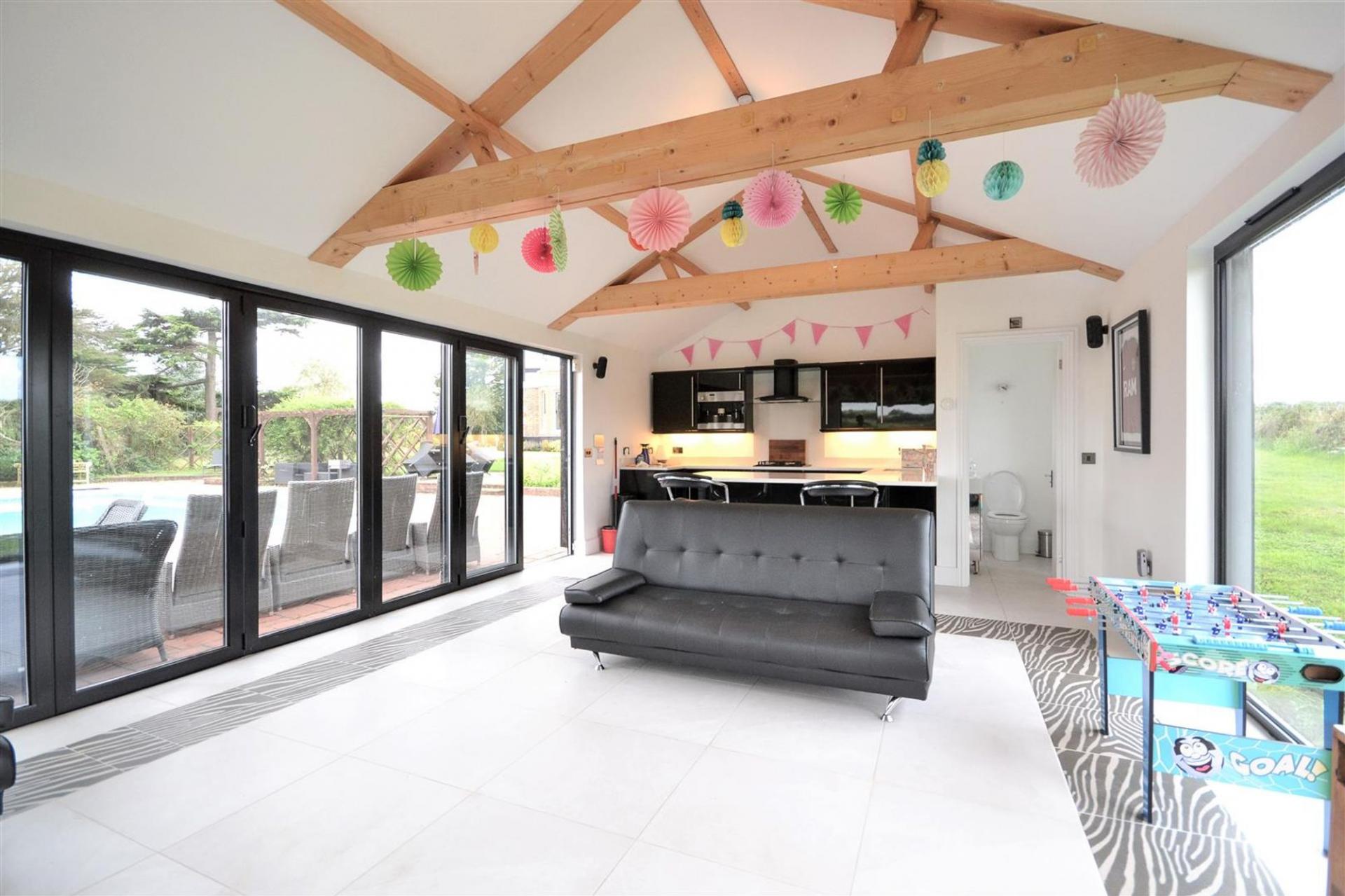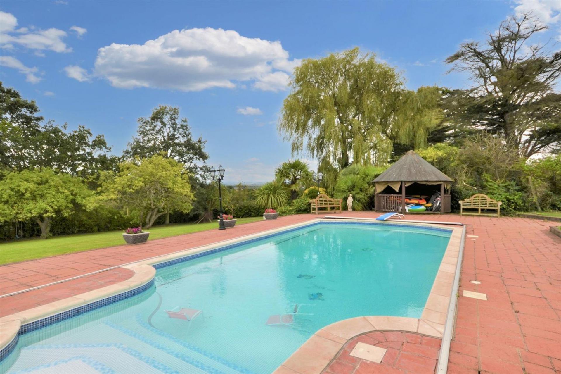 Externally, the property is an oasis of relaxation and entertainment. The outdoor heated pool is adjacent to a superb games complex that includes a separate kitchen, bathrooms, and changing rooms—ideal for hosting gatherings or simply enjoying leisure time. The electronically operated gates open to a sweeping driveway, leading to a pair of double garages, providing ample parking space.