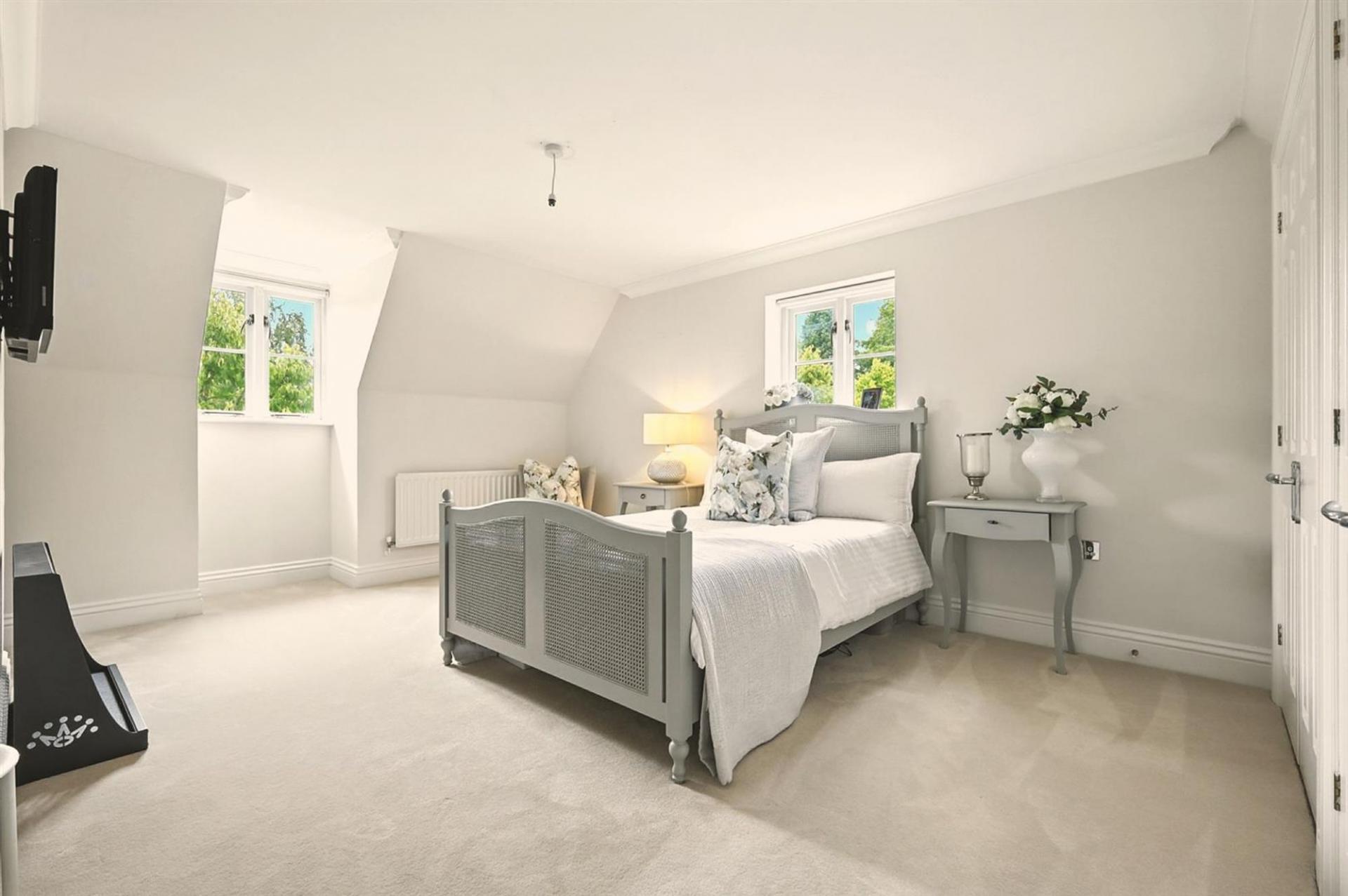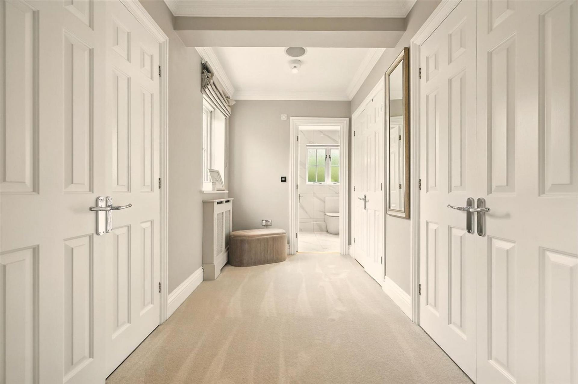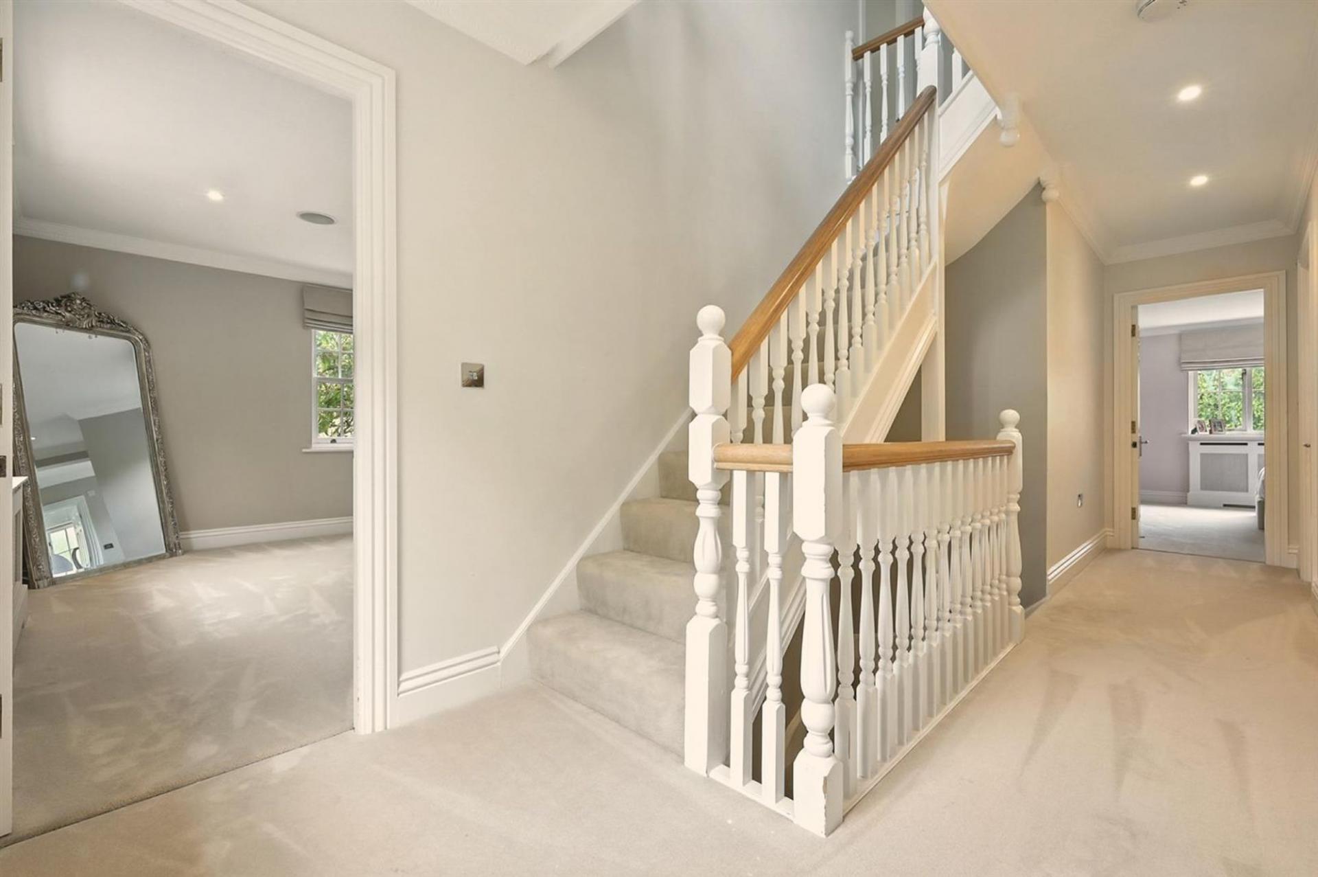 The first floor offers a luxurious principal suite with its own dressing area and en-suite bathroom, complemented by two further double bedrooms, each with an en-suite of their own. The top floor provides excellent additional family space, with two further bedrooms served by a shower room.