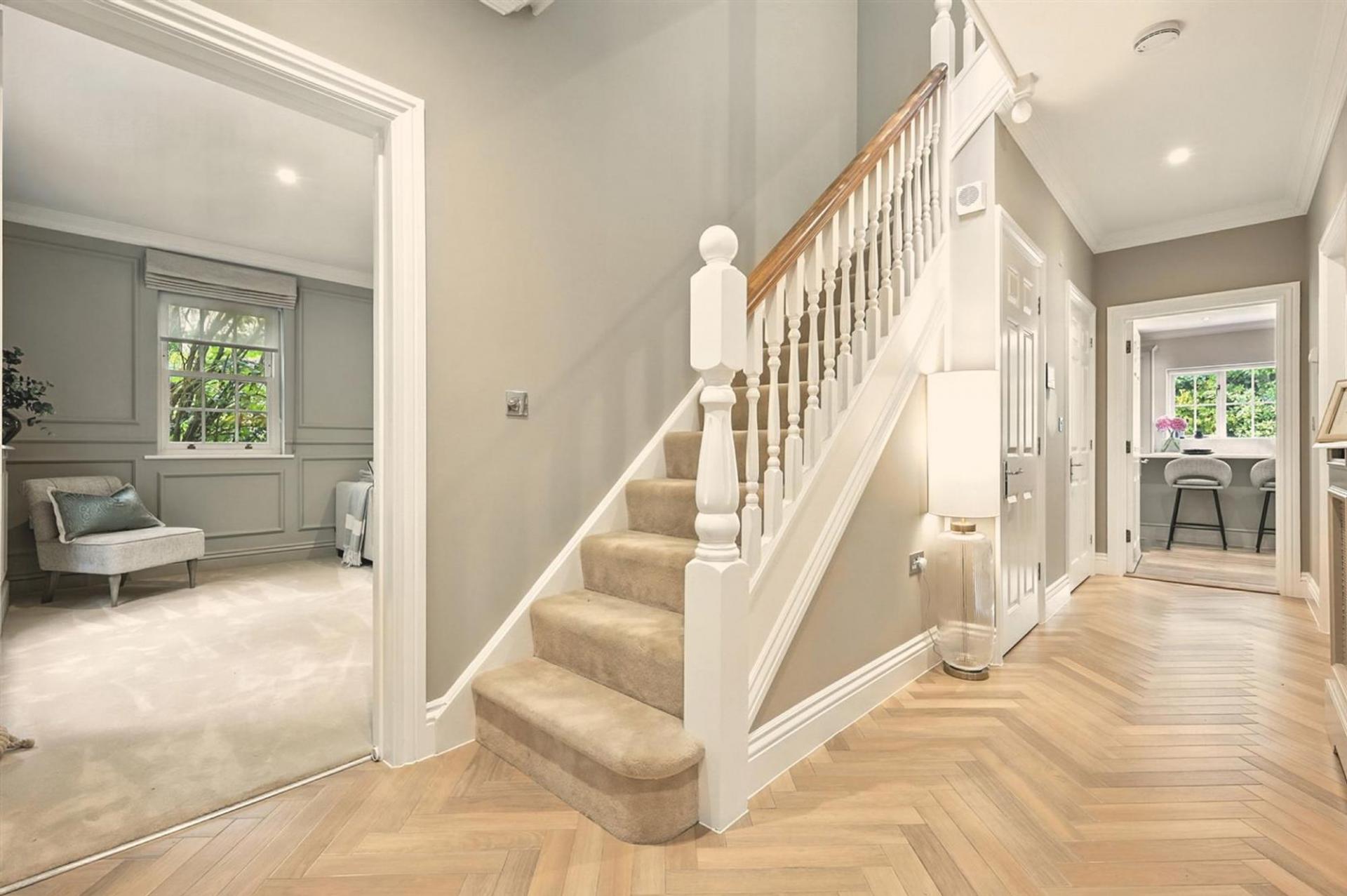The house is approached via a generous driveway to the side, with a grand entrance door leading to a central hallway which sets the tone for the spacious interior. Two large reception rooms provide versatile living and entertaining space, while the rear of the house is arranged around a superb open-plan kitchen/dining room, complete with utility room and ground floor cloakroom.