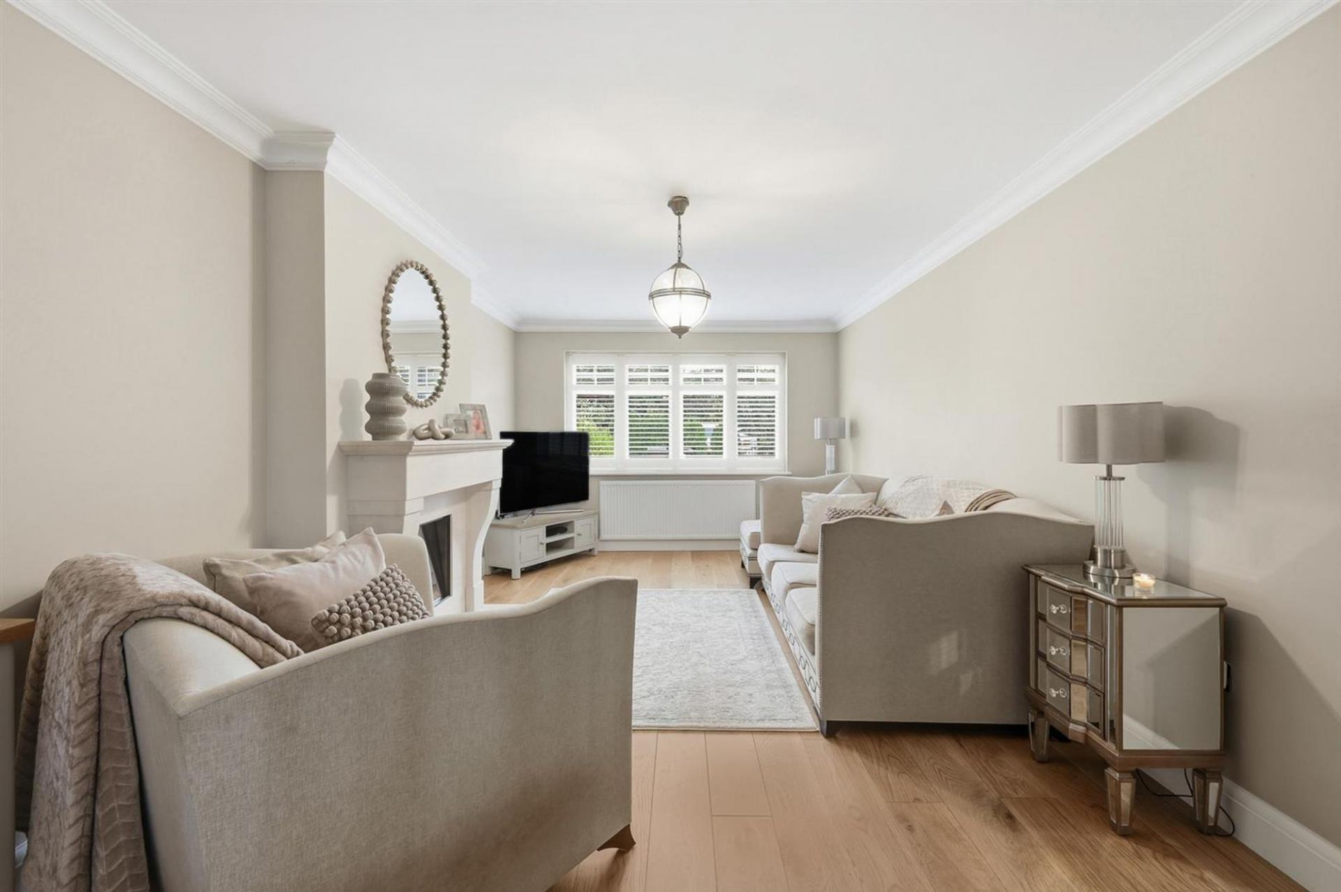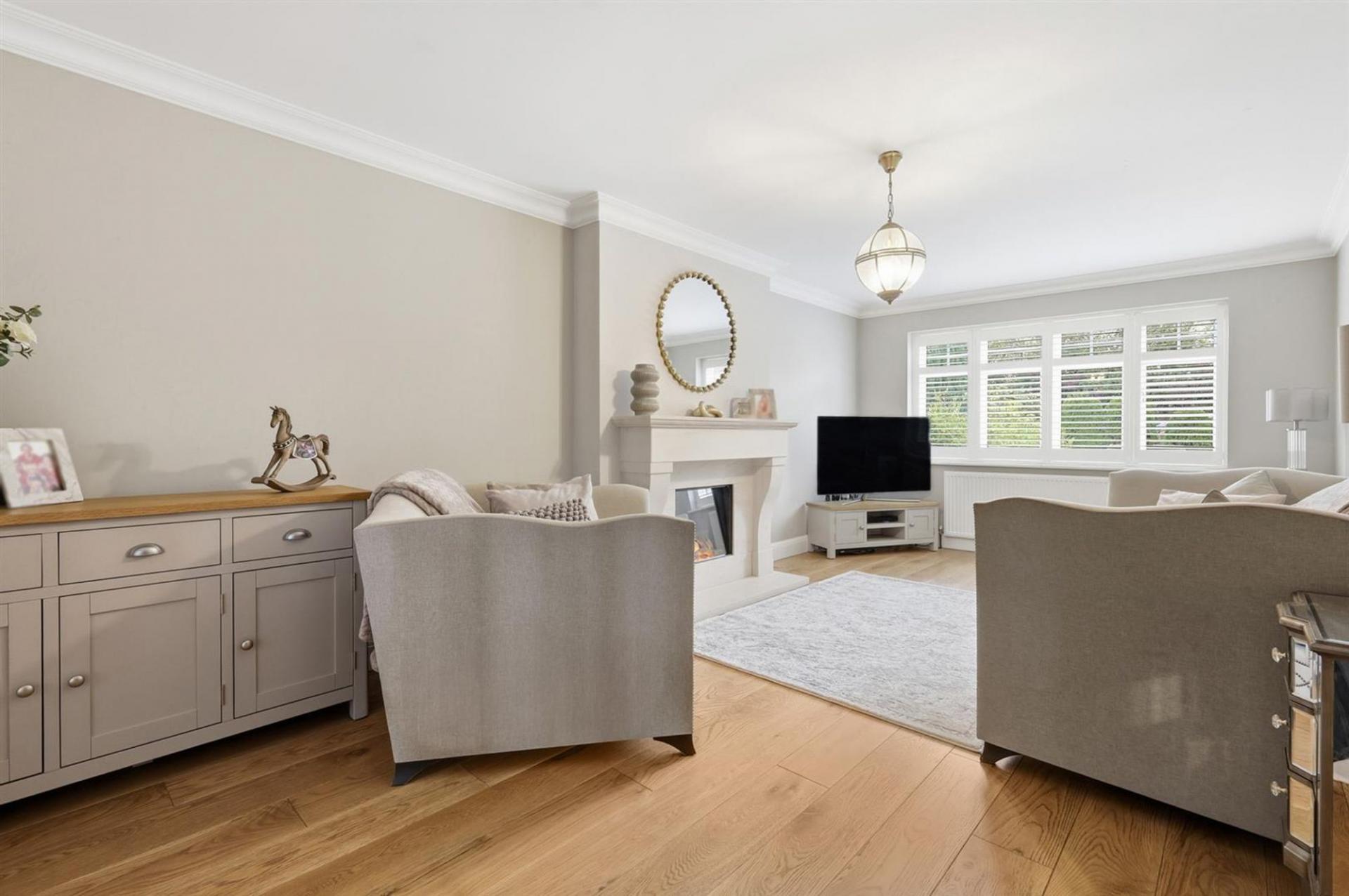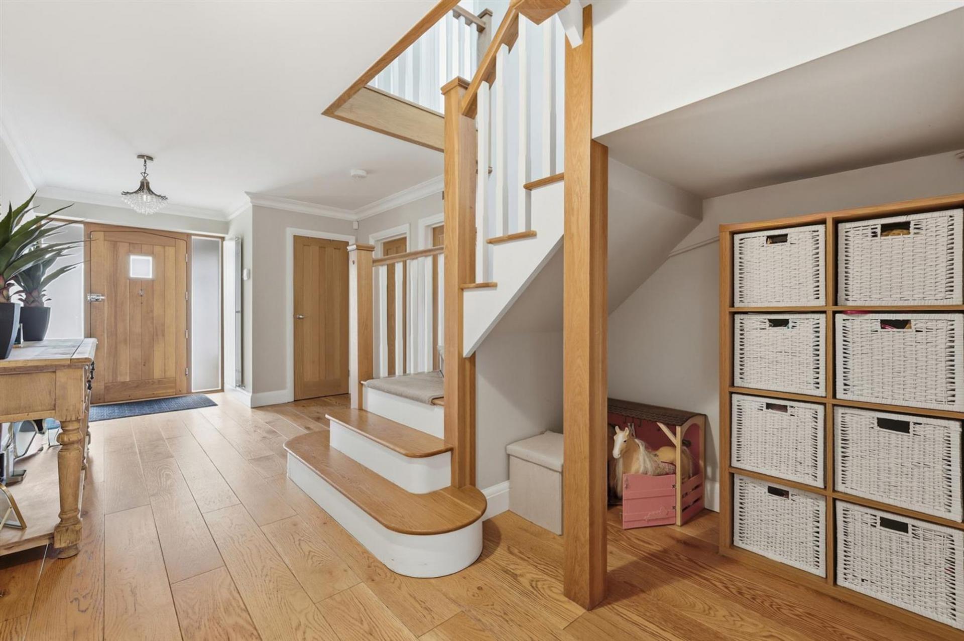 Inside, the bright entrance hall with oak flooring and a feature staircase sets the tone for the home’s elegant finish. To the front, a comfortable living room offers a warm and inviting space with a contemporary fireplace perfect for those cosy winter evenings.