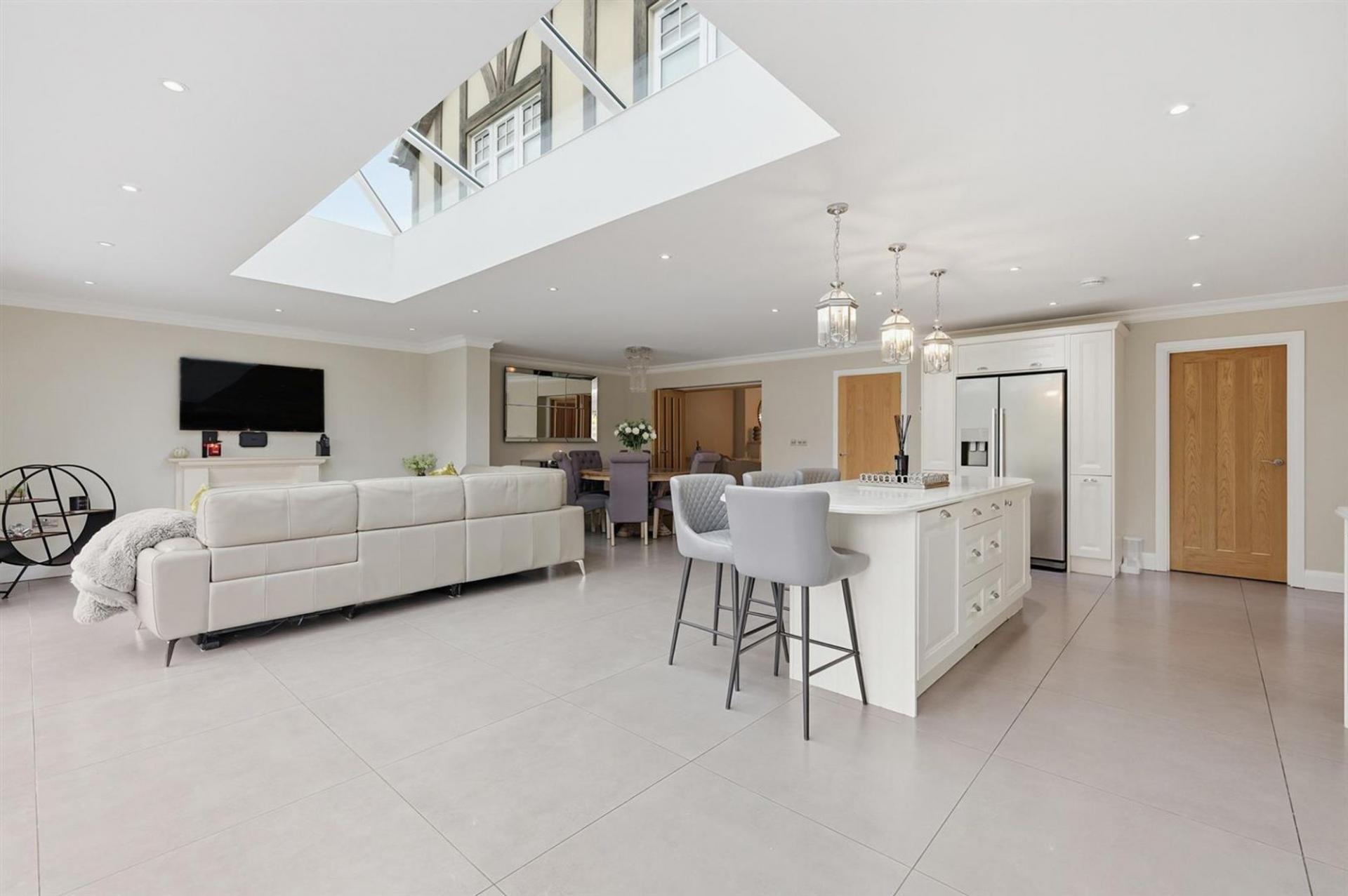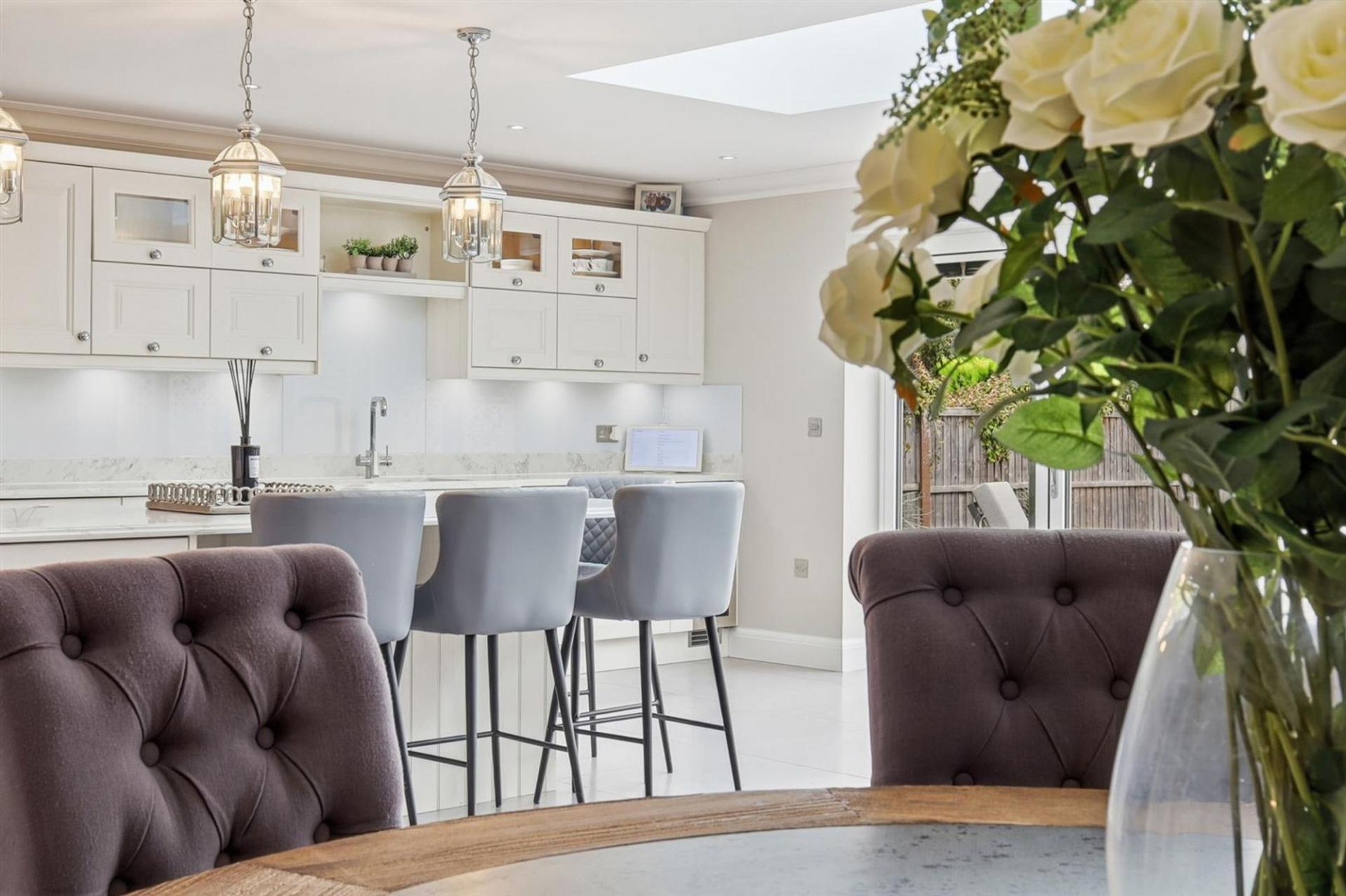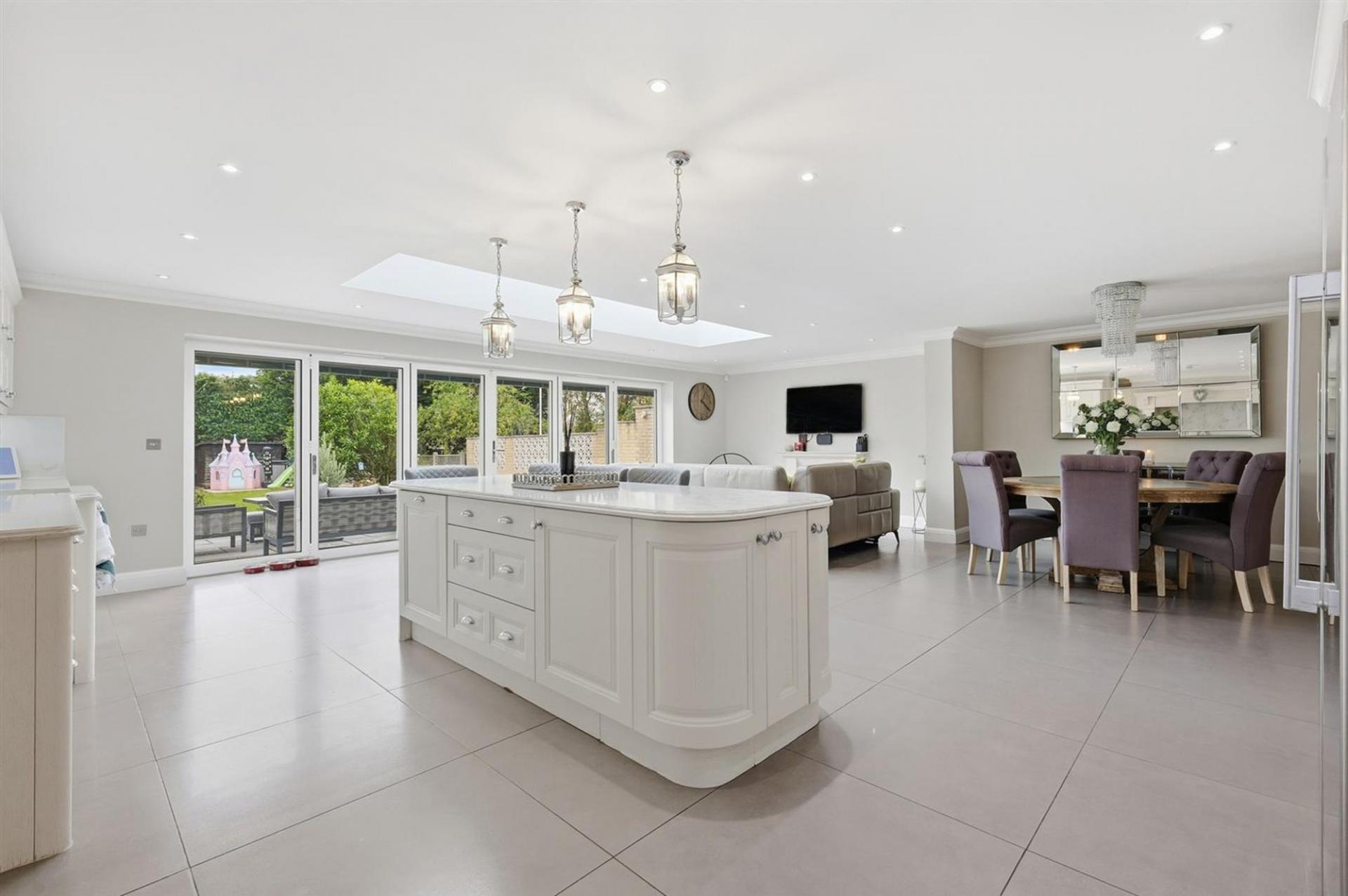 The heart of the home lies to the rear - a stunning open-plan kitchen, dining, and family room, flooded with natural light through large bi-folding doors that open directly onto the patio and garden. The kitchen itself is fitted with high-quality cabinetry and a central island, ideal for entertaining and day-to-day family life. Completing the ground floor is a utility room with external access and a convenient cloakroom/wc.
