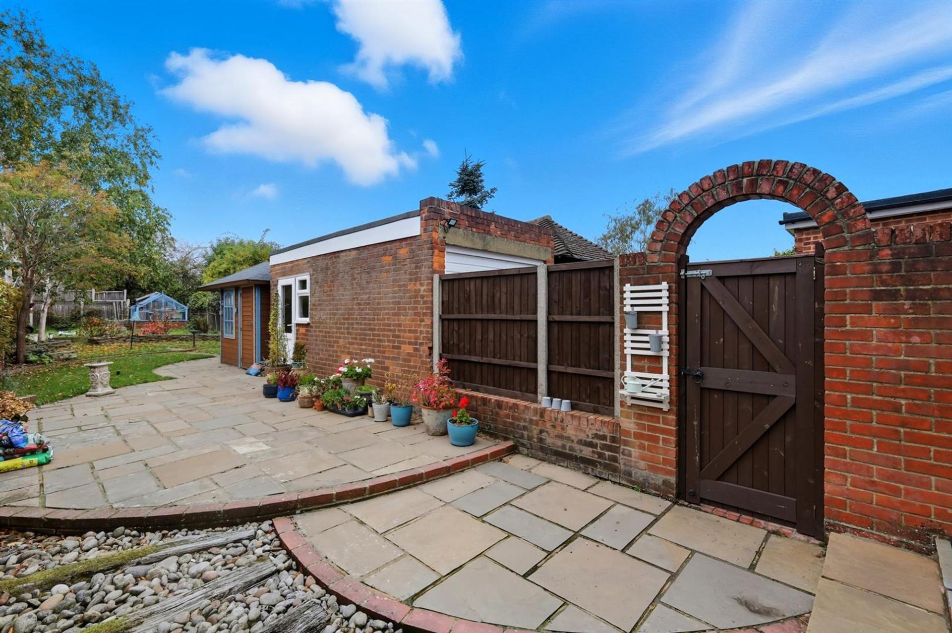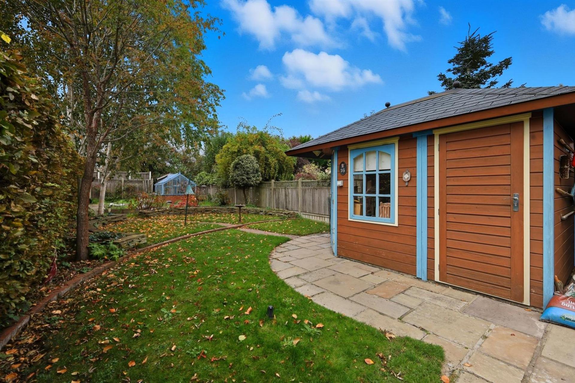 Outside, the property truly excels — the large rear garden provides ample space for outdoor entertaining, children’s play, or potential extensions (subject to planning permission). Two outbuildings, including a garage and a snug with storage area, offer excellent flexibility for hobbies, a home office, or workshop use.