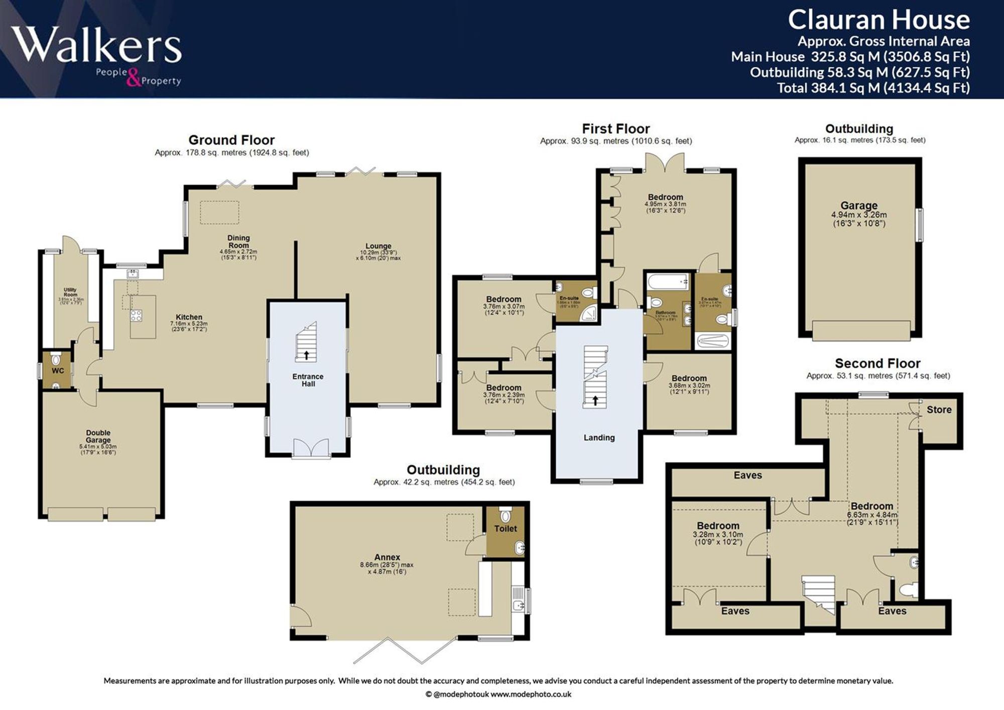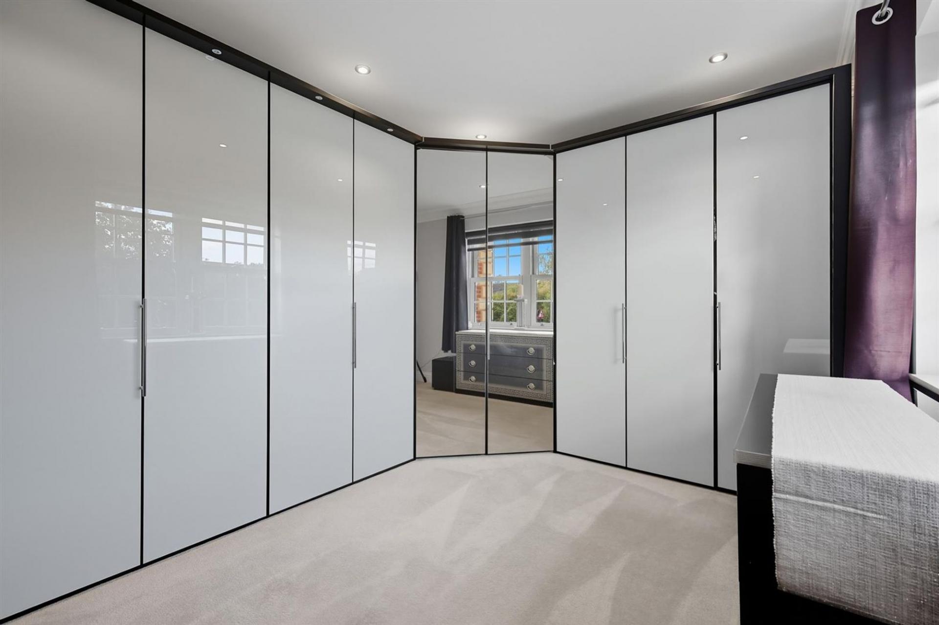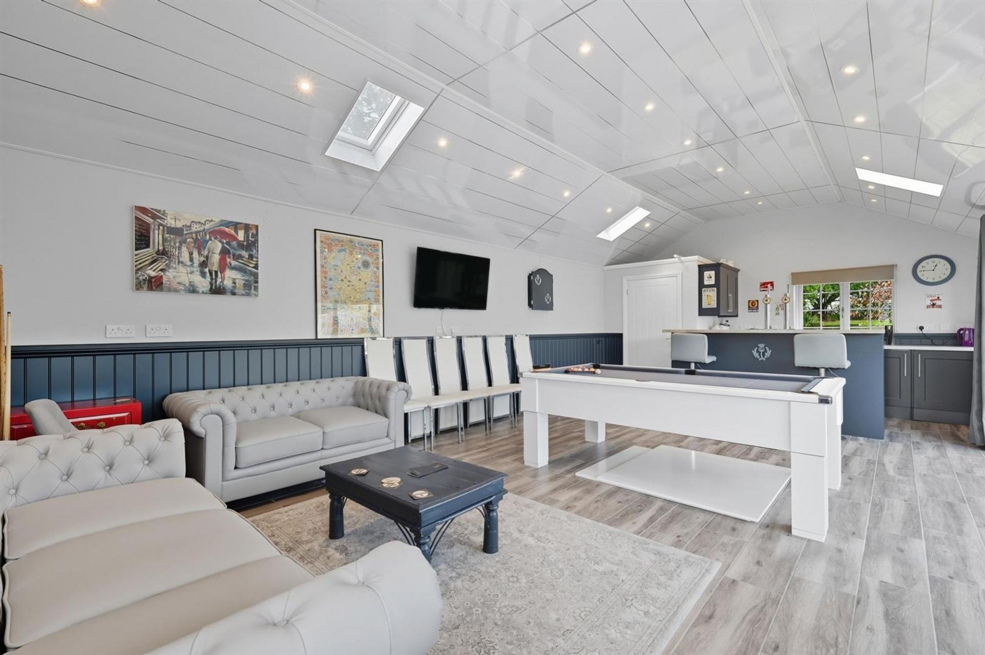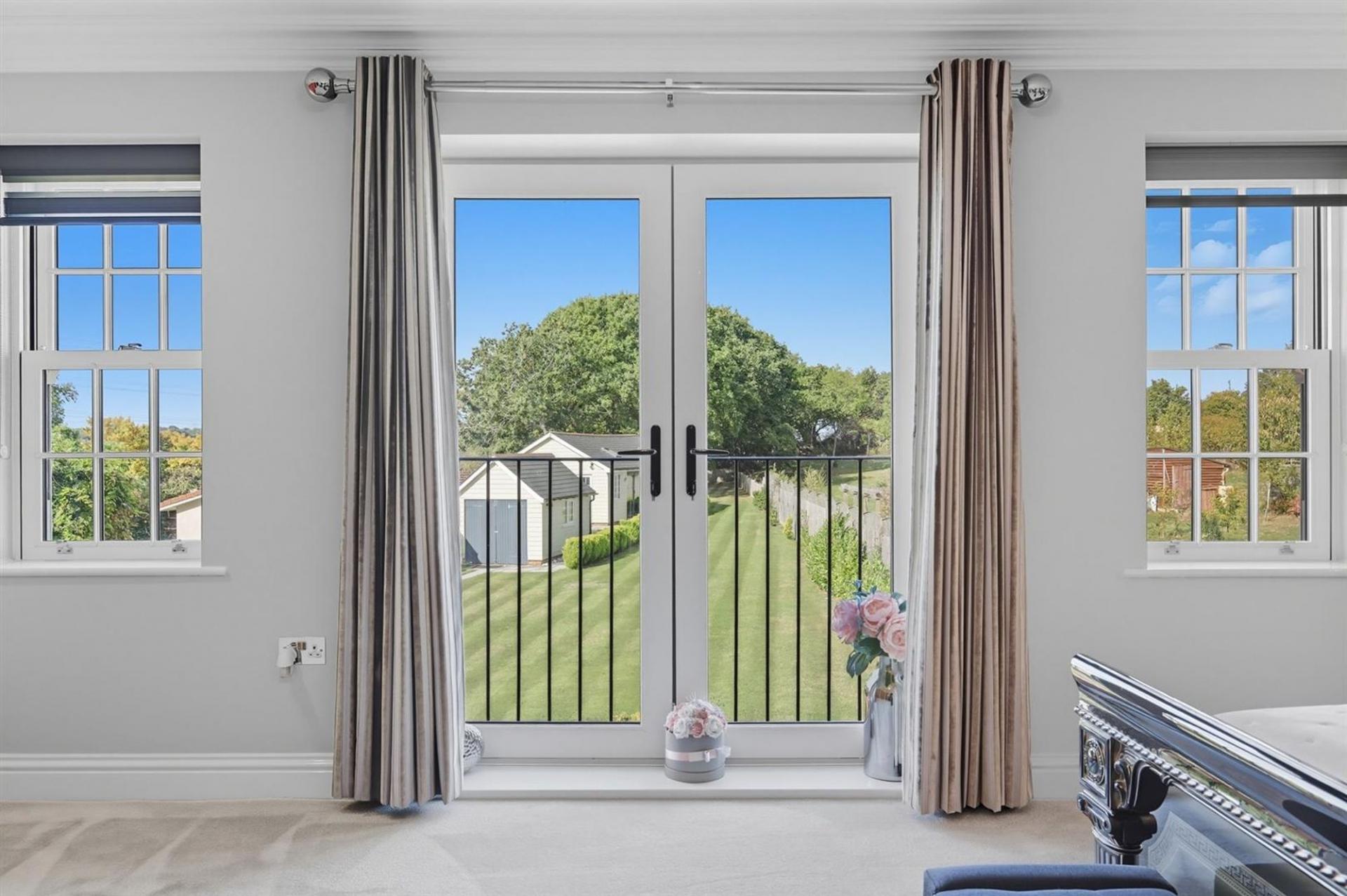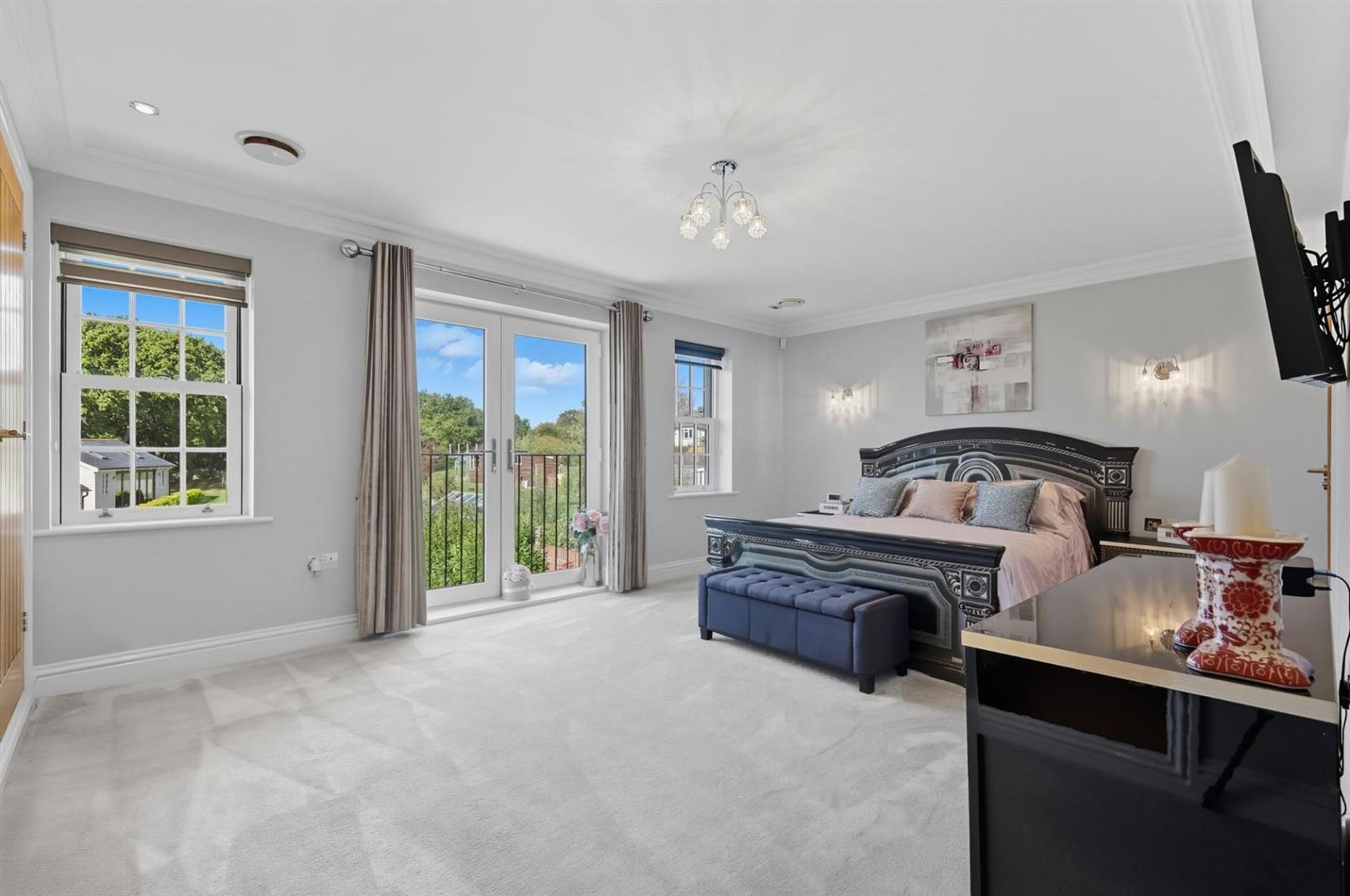 Upstairs, a galleried landing provides access to four generous bedrooms, including a principal suite with Juliet balcony, fitted wardrobes, and en-suite shower. A second double bedroom also enjoys an en-suite, with the remaining two bedrooms served by a family bathroom. The top floor offers flexible space currently used as a home office and dressing area, with potential to create a fifth bedroom and separate WC. The home sits on a 0.32-acre plot STLS with a westerly-facing garden, double garage, and driveway for six-plus vehicles. The leisure outbuilding provides 417 sq ft of versatile space with kitchen/bar and cloakroom.