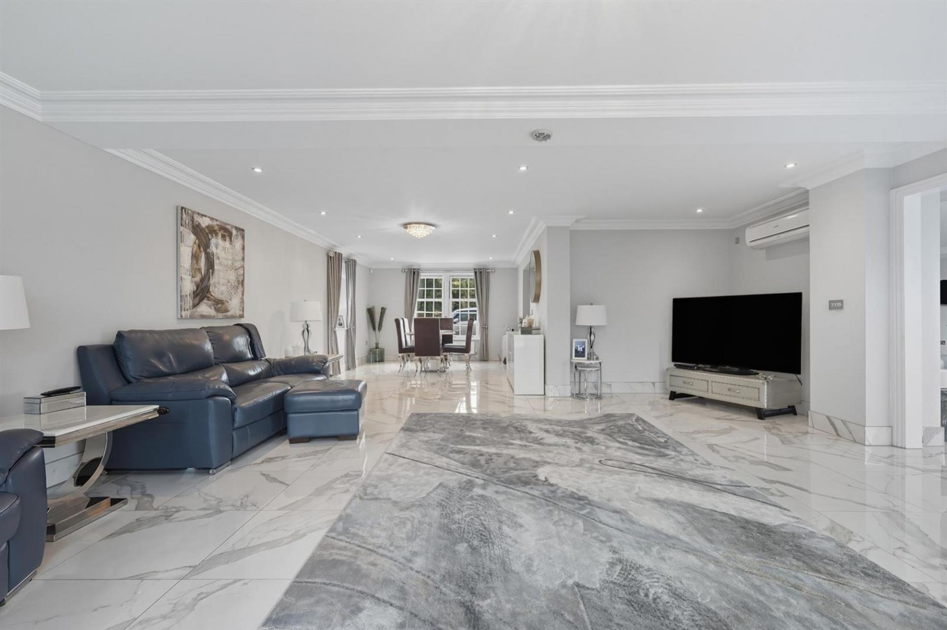 The ground floor features a welcoming reception hall with oak staircase and an expansive open-plan living space divided into two lounges, a dining area, and breakfast nook. The bespoke kitchen is equipped with premium integrated appliances and a central island, while bi-fold doors connect the interiors seamlessly with the rear garden. A large utility room and cloakroom complete the practical layout.