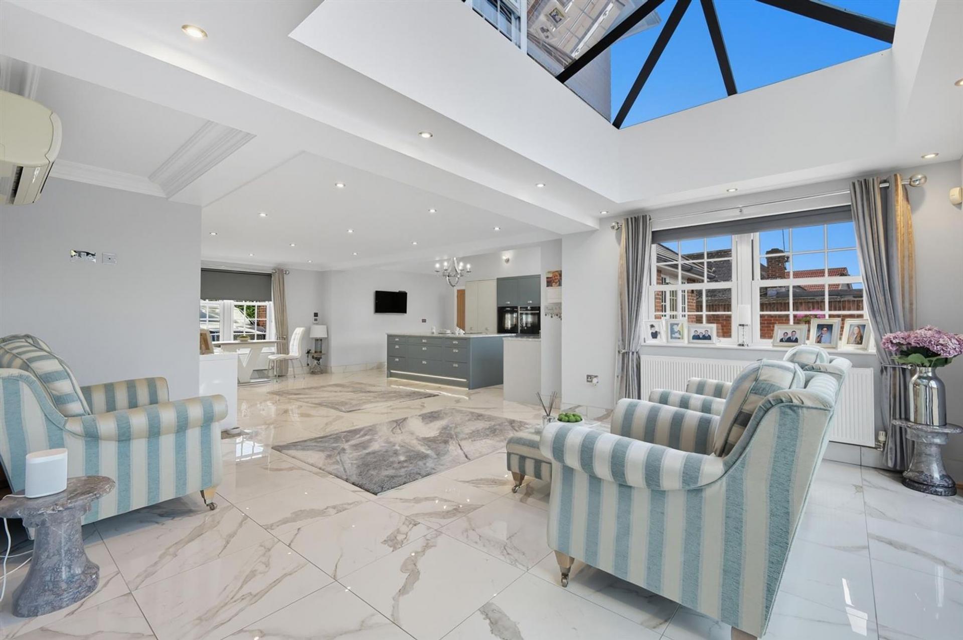 This exceptional five-bedroom family home has been meticulously designed to combine modern style with practicality. Offering over 3,300 sq ft of flexible living space, the property benefits from an NHBC warranty until 2027 and features light-filled, open-plan interiors with high-quality finishes throughout. The striking reception hall and oak staircase lead into a beautifully configured ground floor, perfect for both relaxed family living and entertaining.