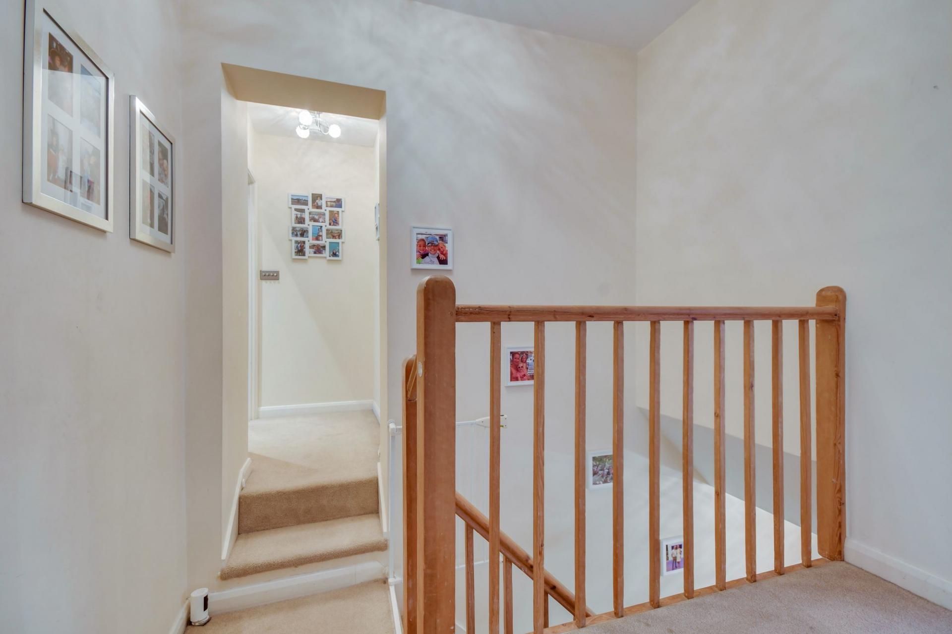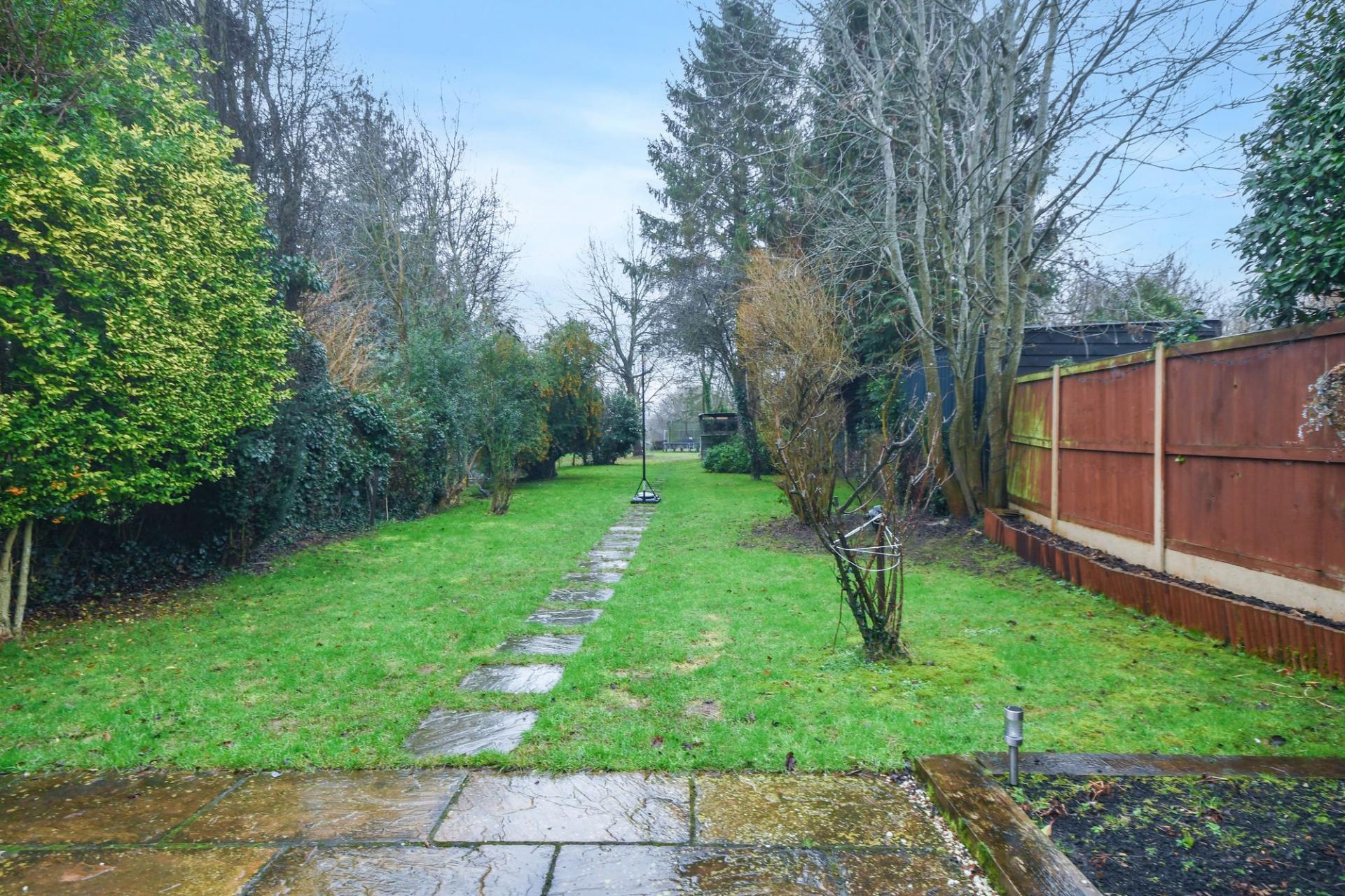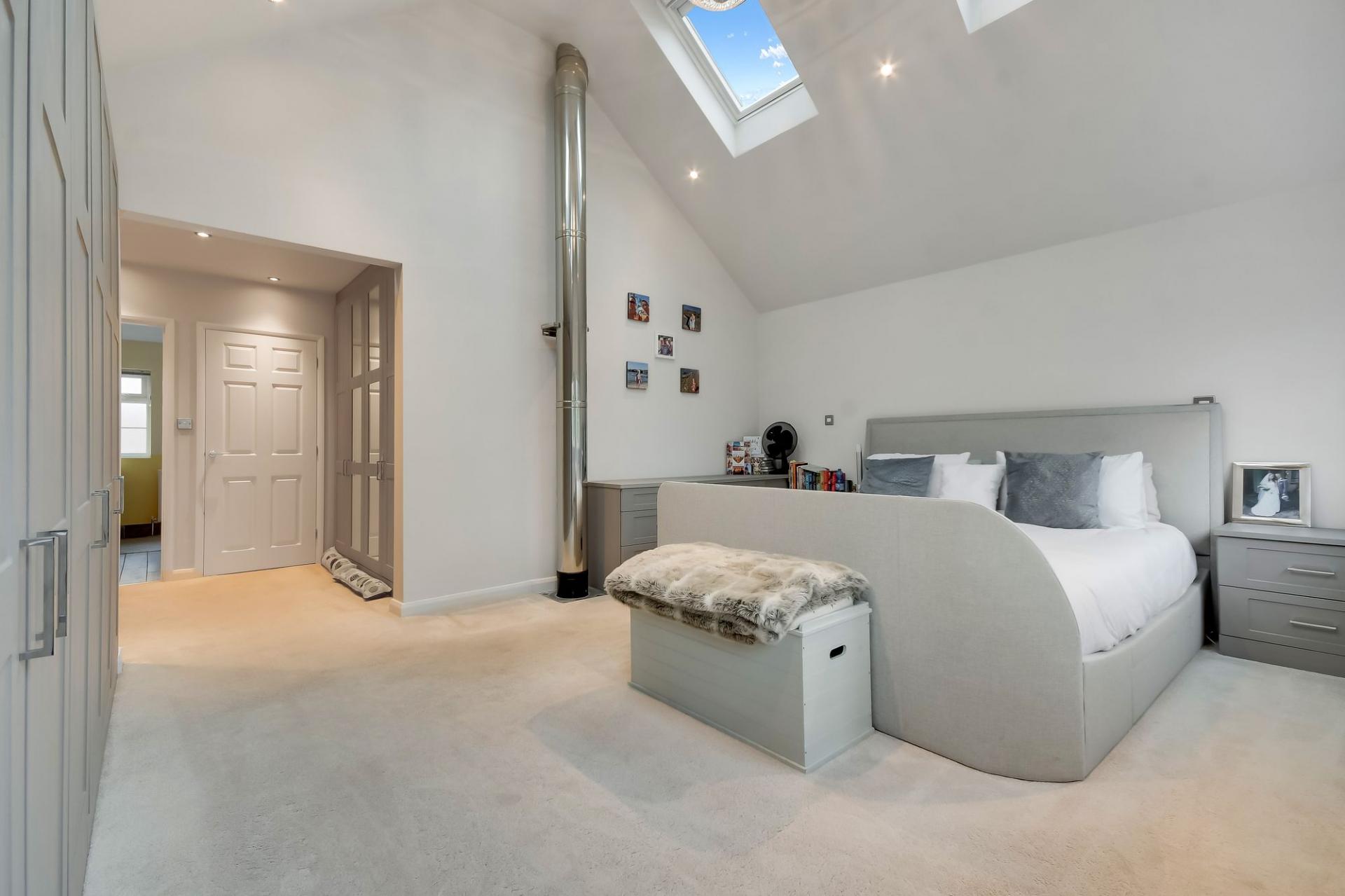 Upstairs, a split staircase creates a sense of privacy and space. To one side is the striking master suite, boasting vaulted ceilings, a dressing area, extensive fitted storage and a stylish ensuite. The remaining accommodation includes two well-proportioned double bedrooms, one with its own ensuite, a further single bedroom and a modern family bathroom serving the remaining rooms. Externally, the property benefits from a substantial south-facing rear garden, driveway parking and a garage to the front. The home also falls within the catchment area for well-regarded local schools.