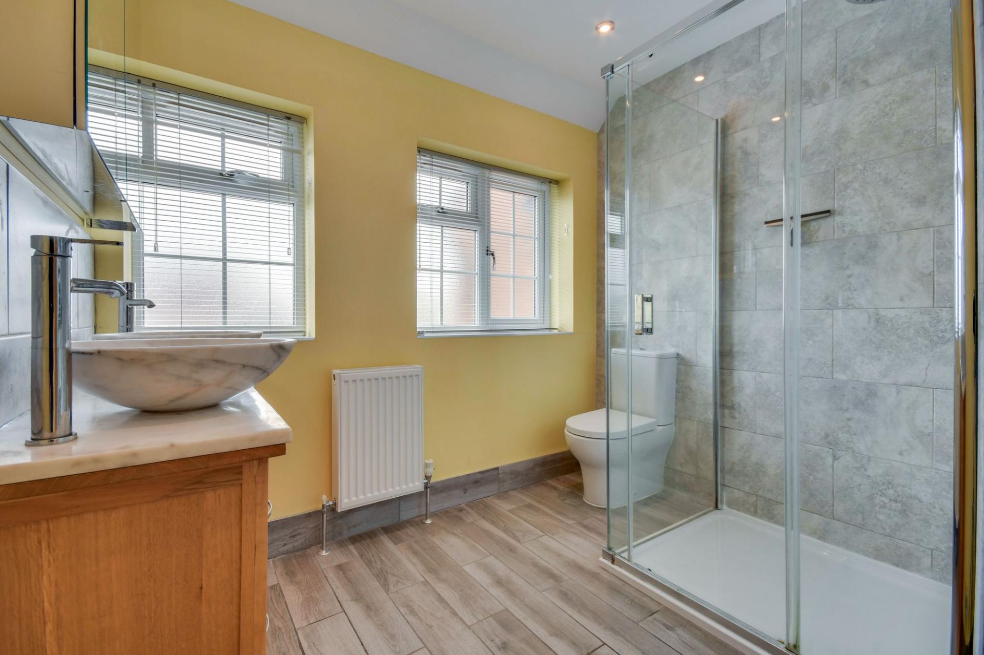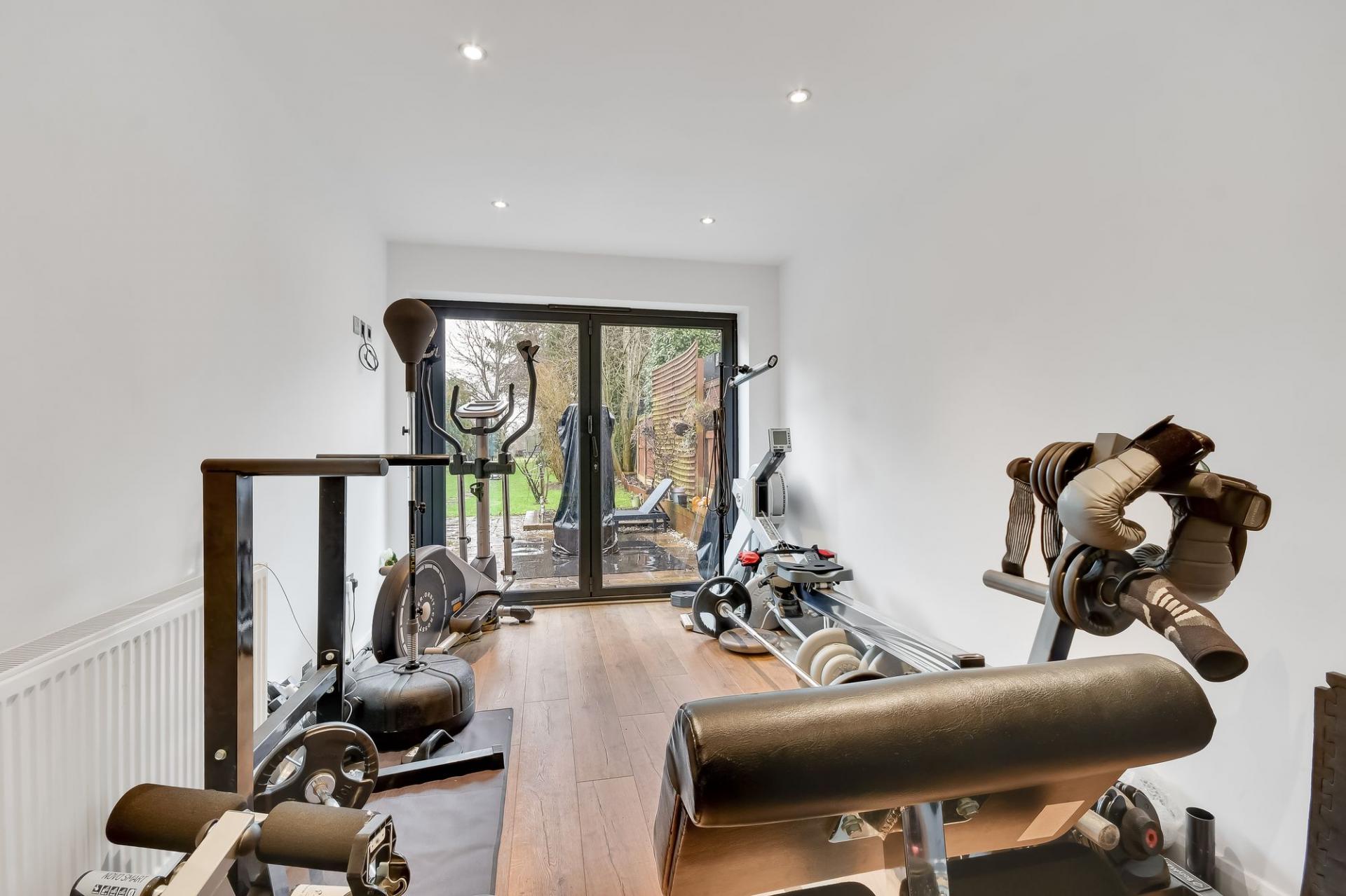 The ground floor is centred around an impressive open-plan kitchen and living area, the true heart of the home, complete with a log burner and bifold doors opening onto the rear garden, creating a seamless indoor-outdoor feel. A separate cosy lounge with feature fireplace provides a perfect retreat, while the integral garage leads through to an additional room currently used as a gym, offering excellent versatility for home working, hobbies or playroom use. A convenient downstairs cloakroom completes this level.