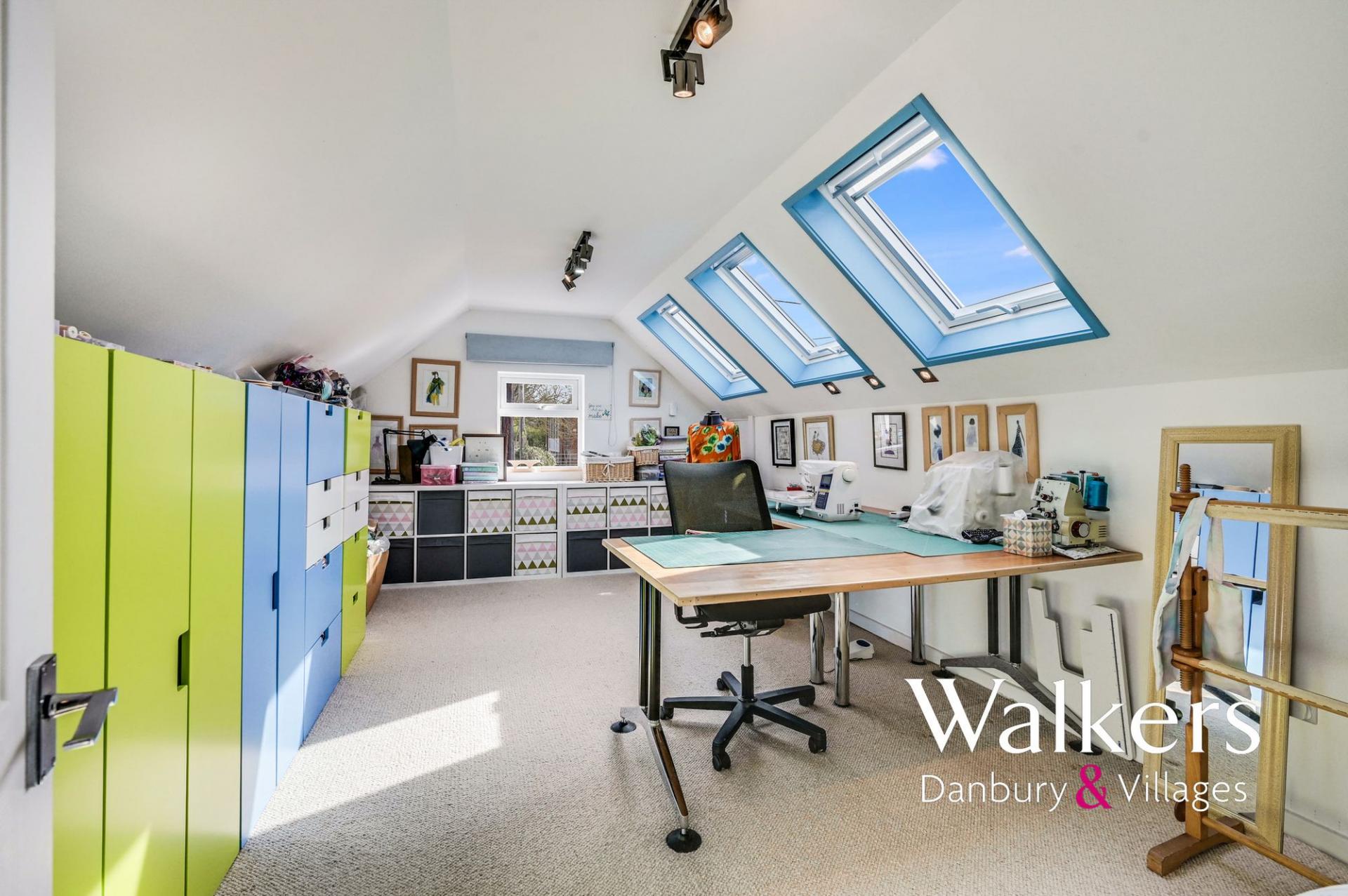 Externally, the westerly facing rear garden is a real highlight, featuring multiple patio areas, two lawned sections, a greenhouse and additional storage, perfect for both entertaining and family life. To the front, there is ample driveway parking and a detached double garage with a room above, offering excellent potential for a home office or annexe, subject to planning. The property falls within reach of highly regarded local schools, including private and public options, as well as Chelmsford Grammar Schools.