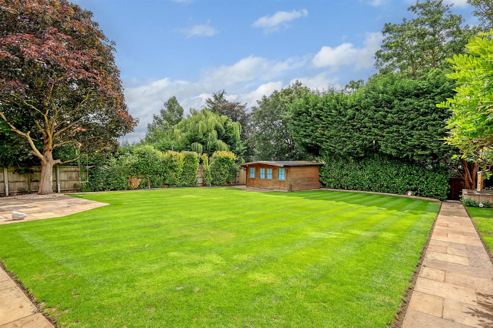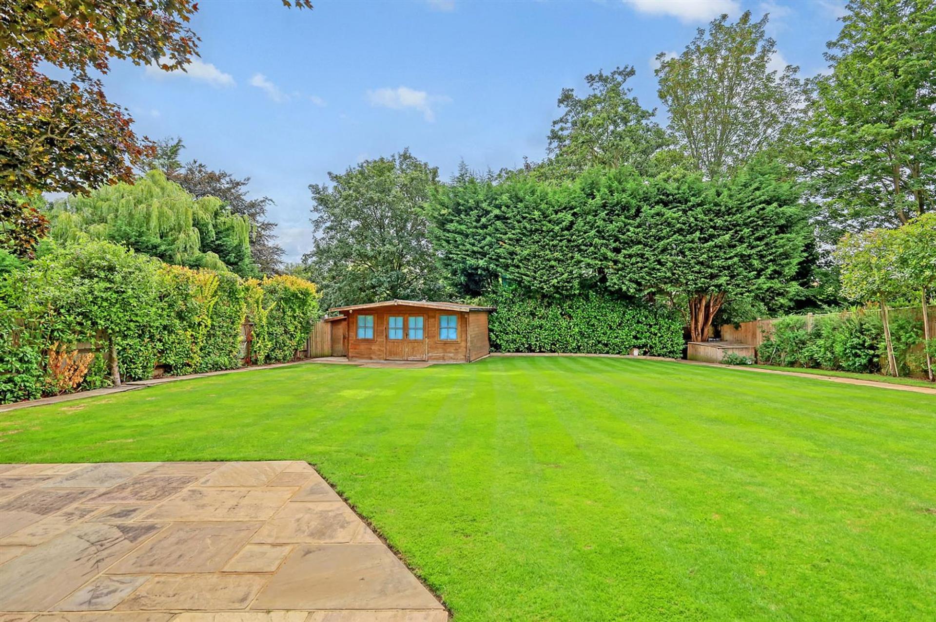 The rear garden is a particular highlight, with a large stone patio ideal for outdoor dining, leading down to a beautifully maintained lawn bordered by mature hedges and trees, providing privacy and tranquillity. At the end of the garden sits a fully detached log cabin with a separate store room - perfect for use as a home office, gym or studio.