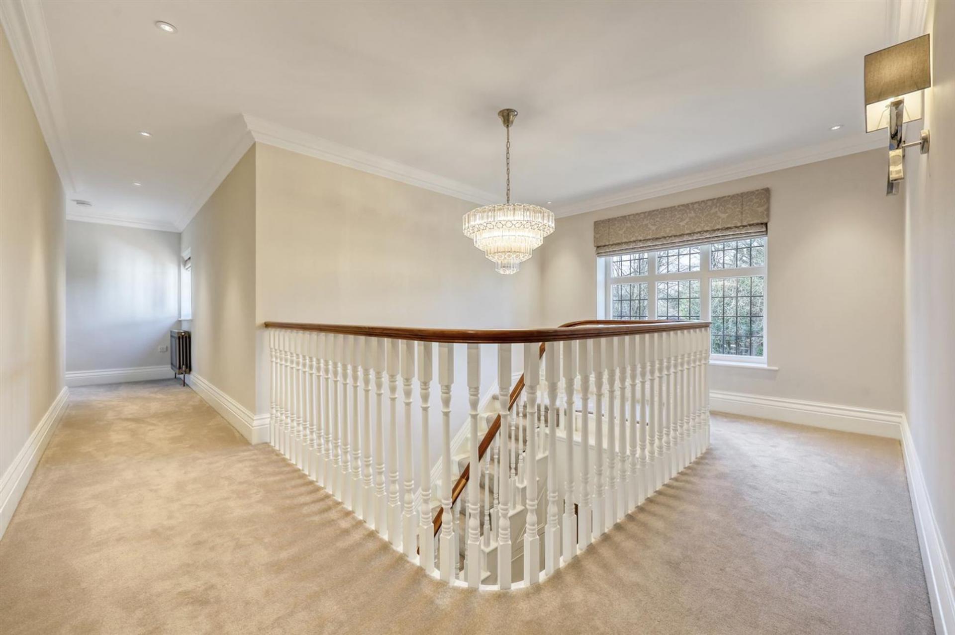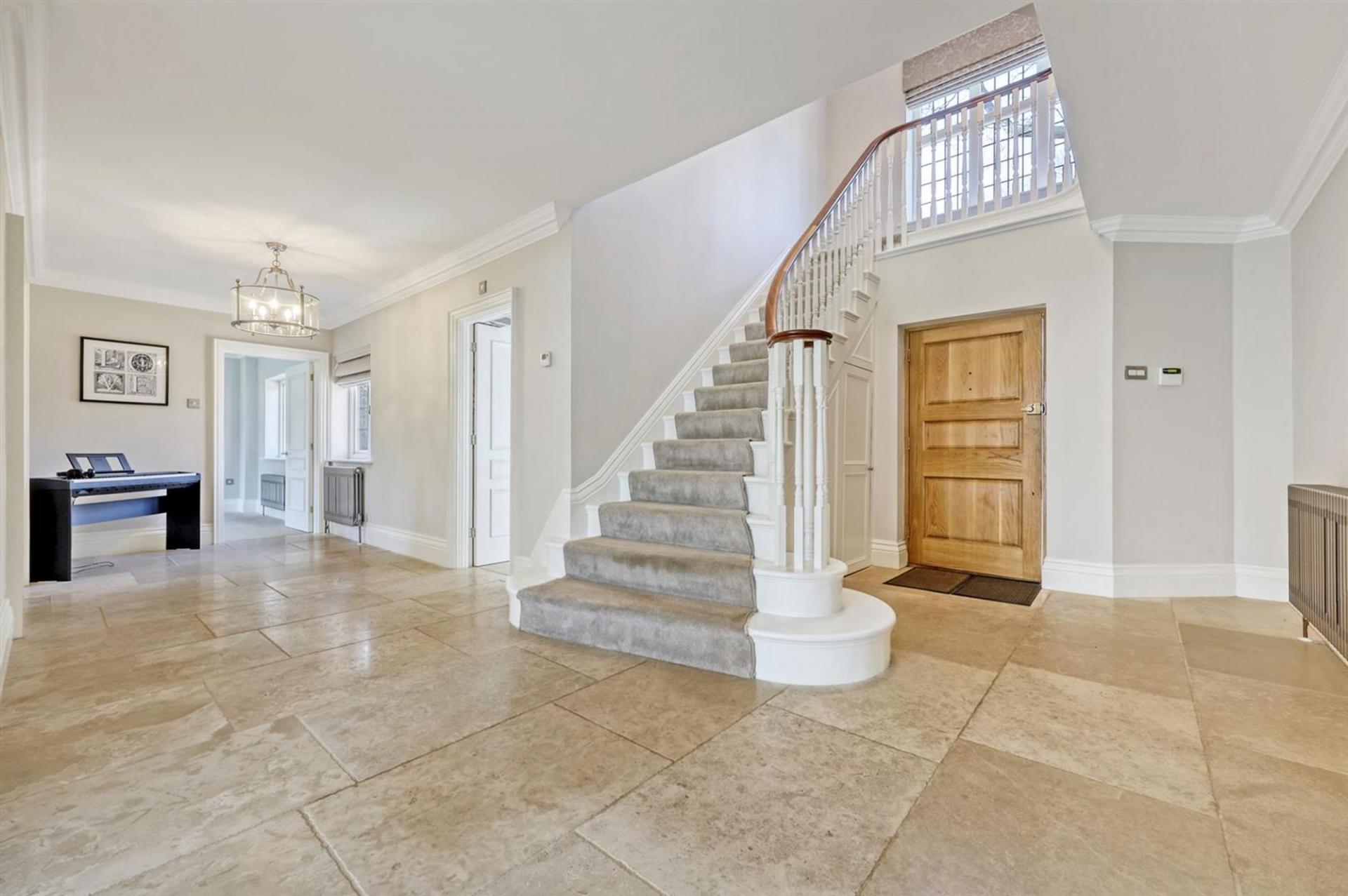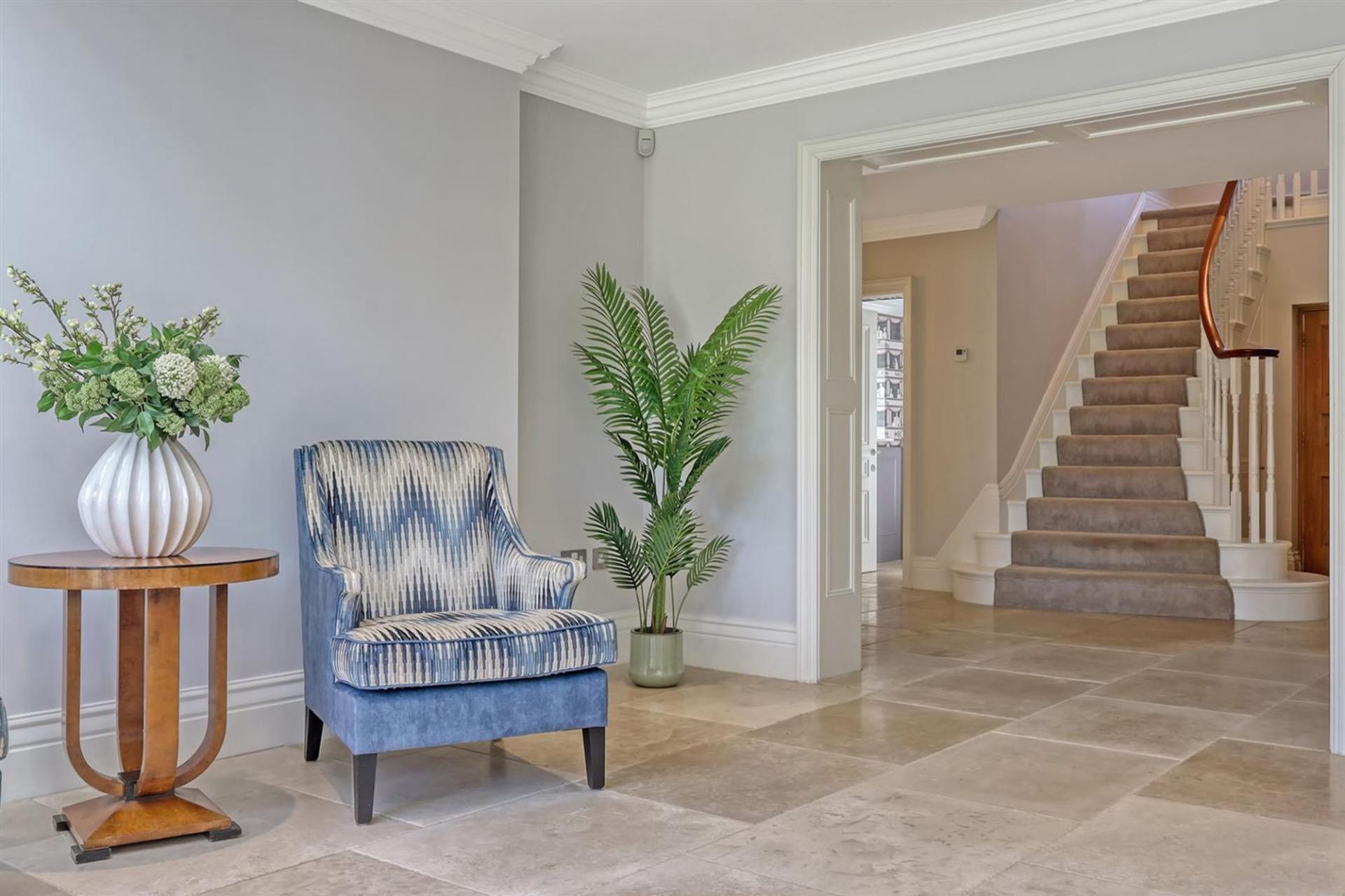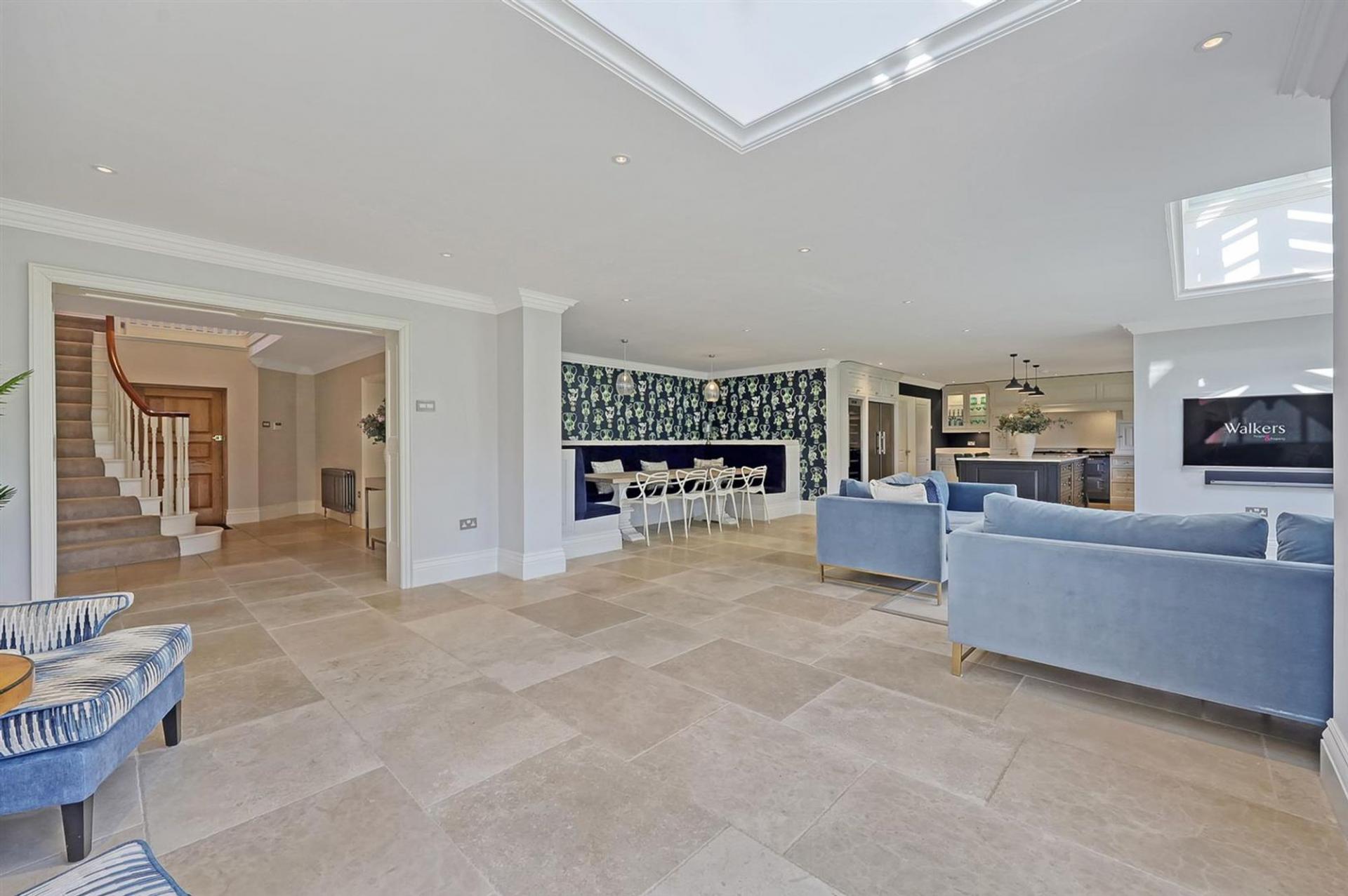 The large entrance hall sets the tone, with its generous proportions and sweeping staircase rising to a galleried landing above. Three reception rooms provide excellent versatility for day-to-day family living and entertaining alike, each space beautifully appointed with elegant finishes and Westbury windows allowing natural light to pour in.