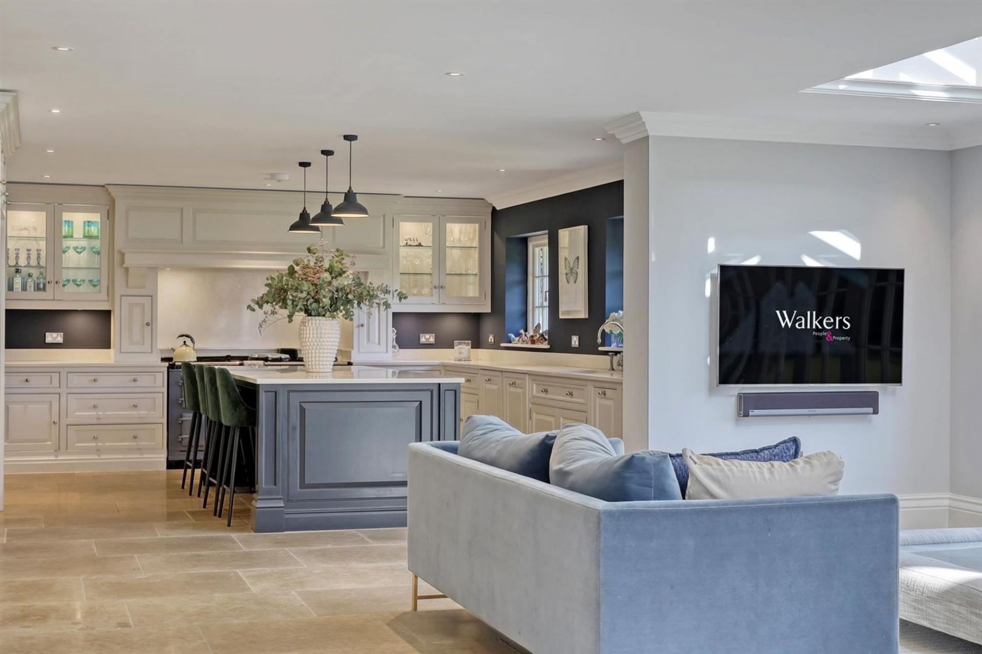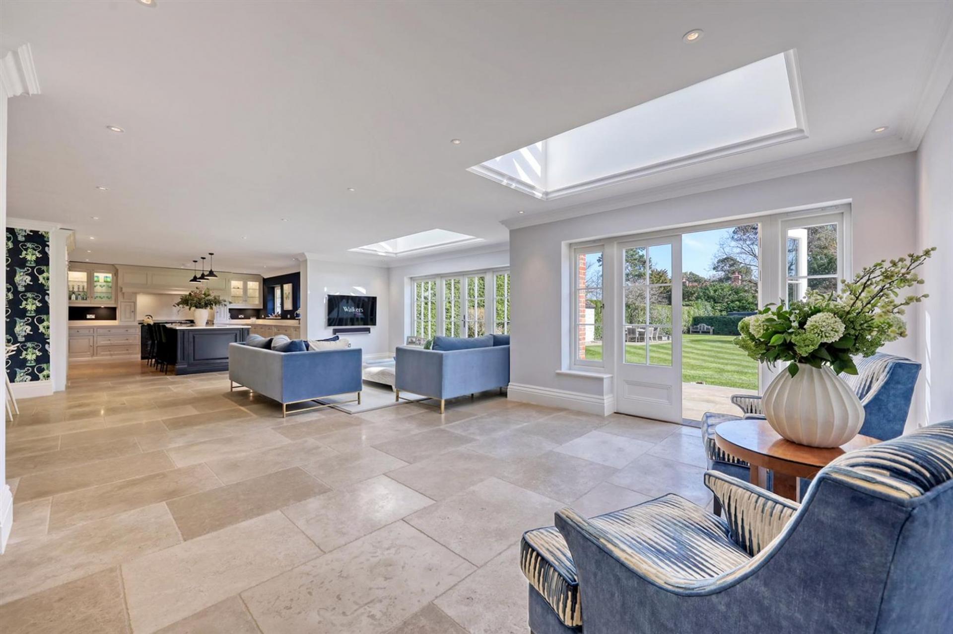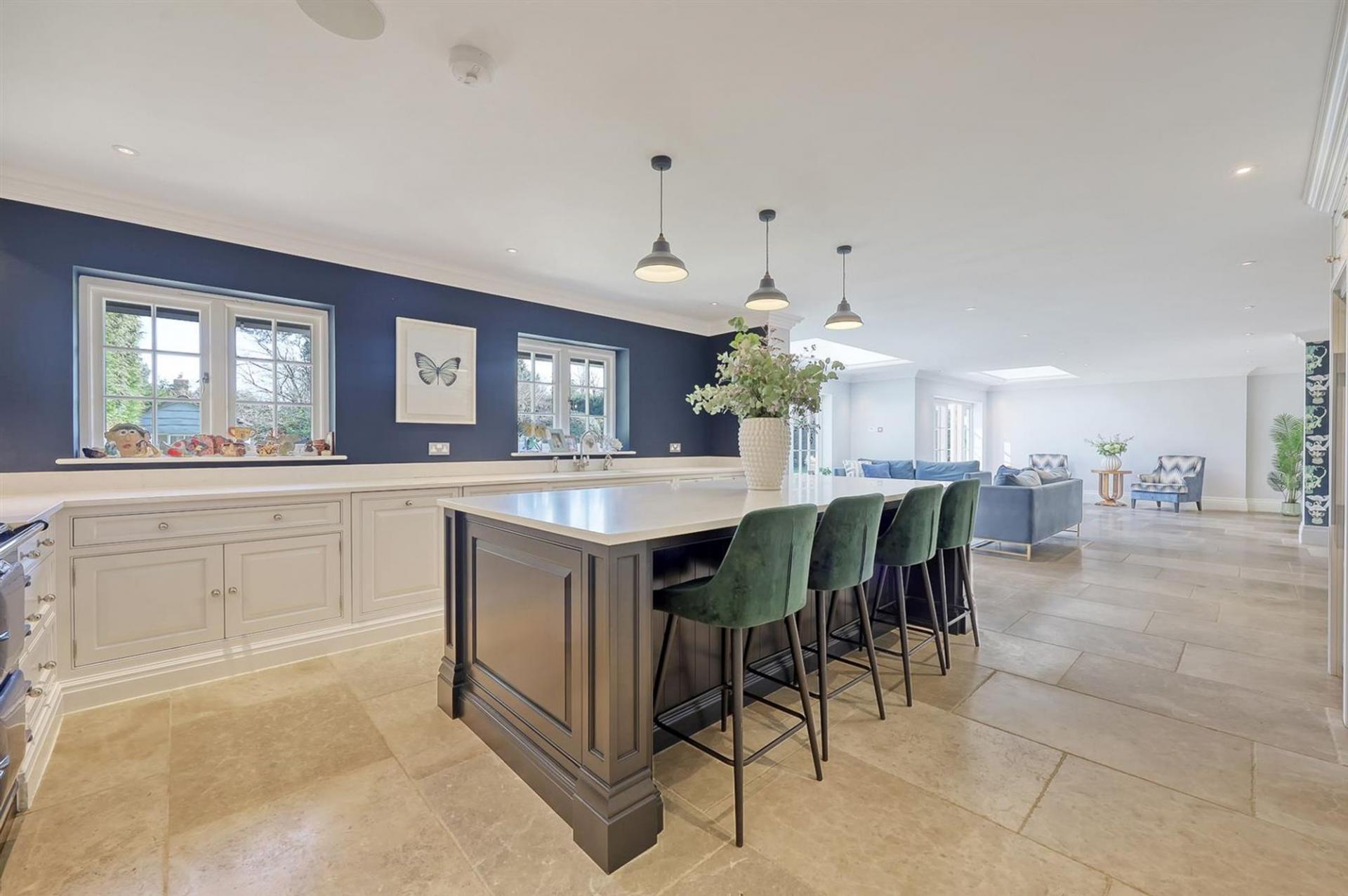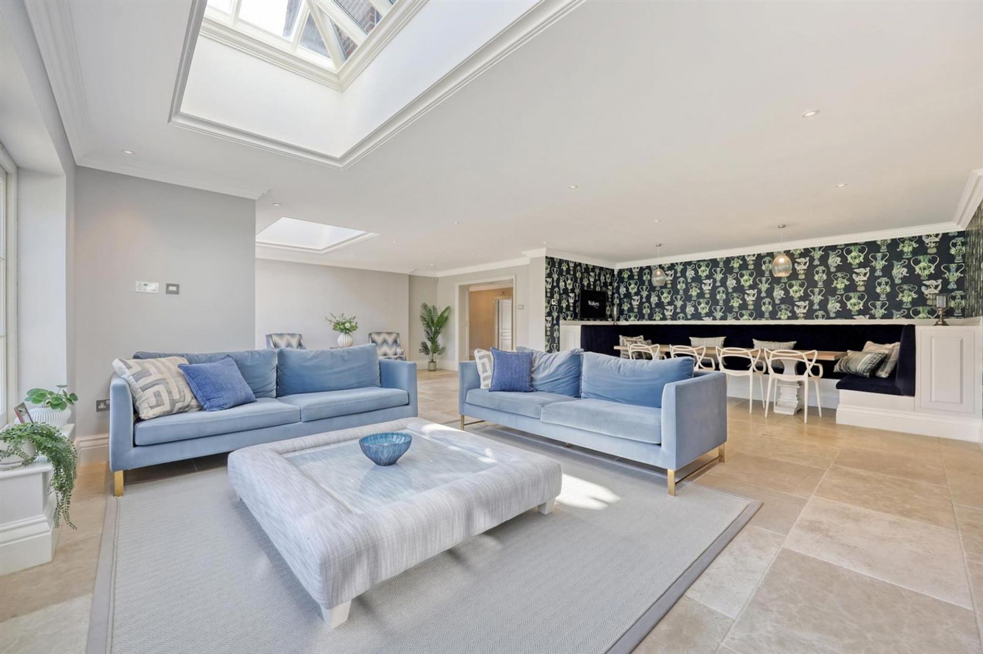 The large entrance hall sets the tone, with its generous proportions and sweeping staircase rising to a galleried landing above. Three reception rooms provide excellent versatility for day-to-day family living and entertaining alike, each space beautifully appointed with elegant finishes and Westbury windows allowing natural light to pour in.