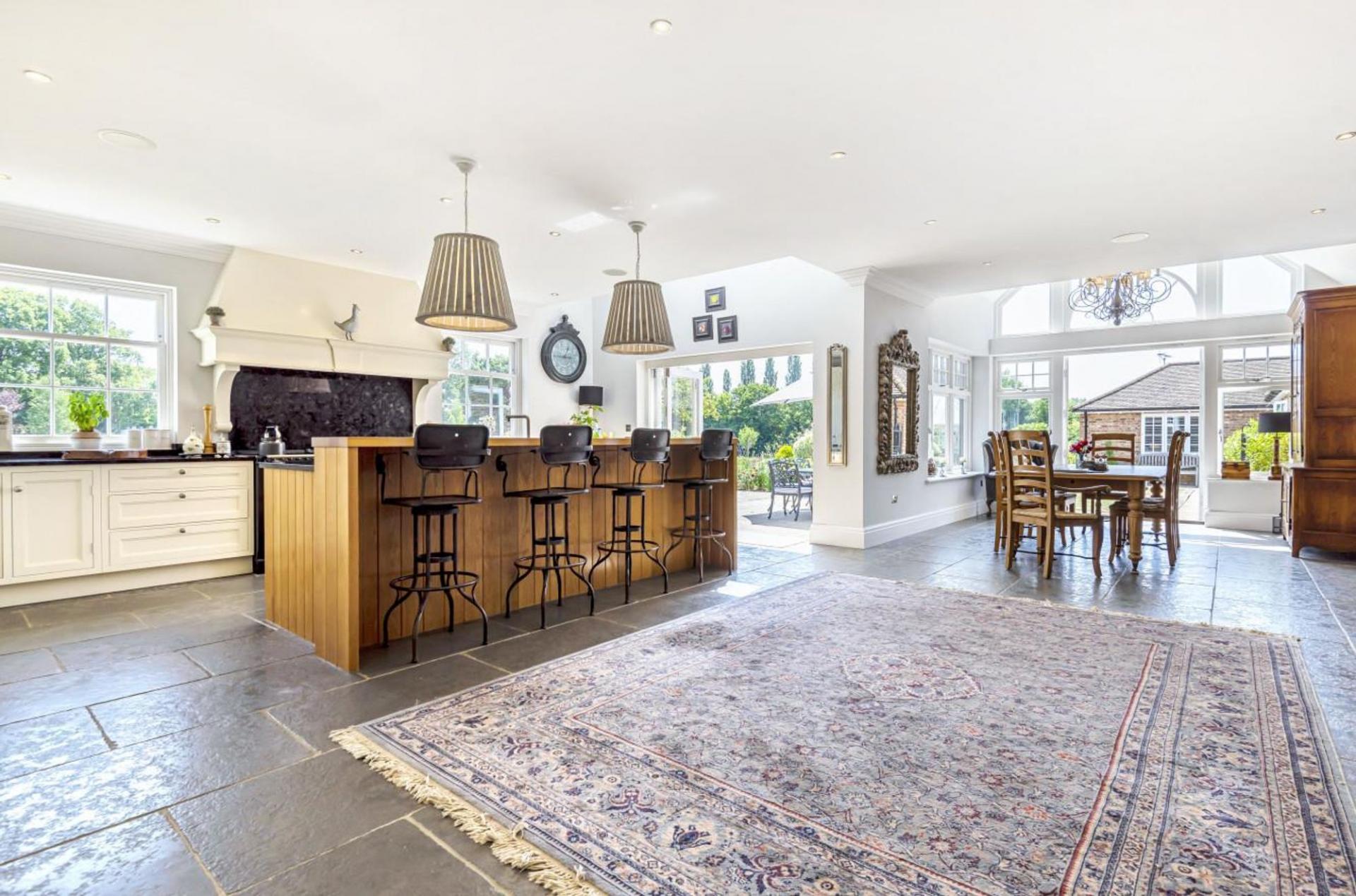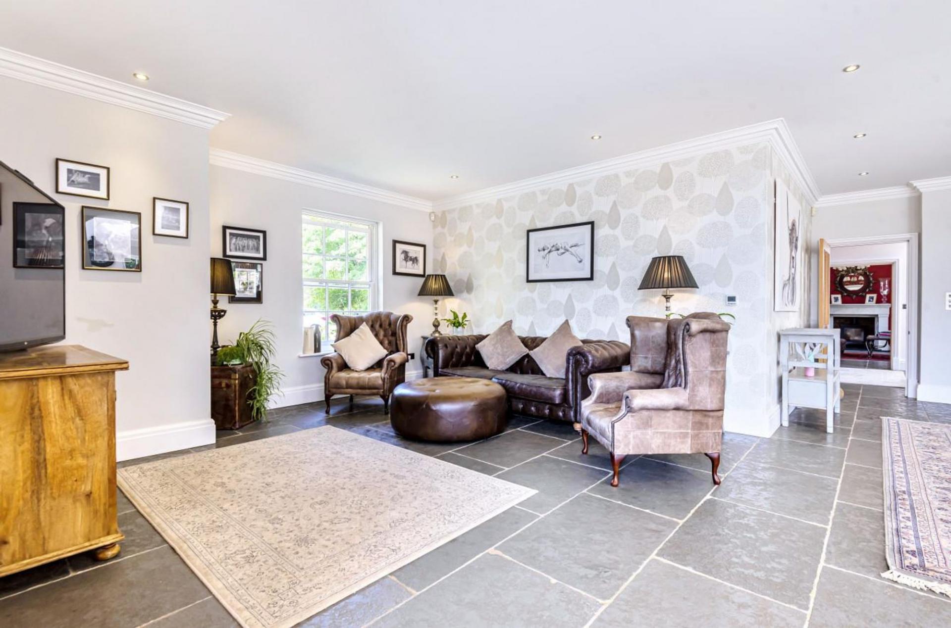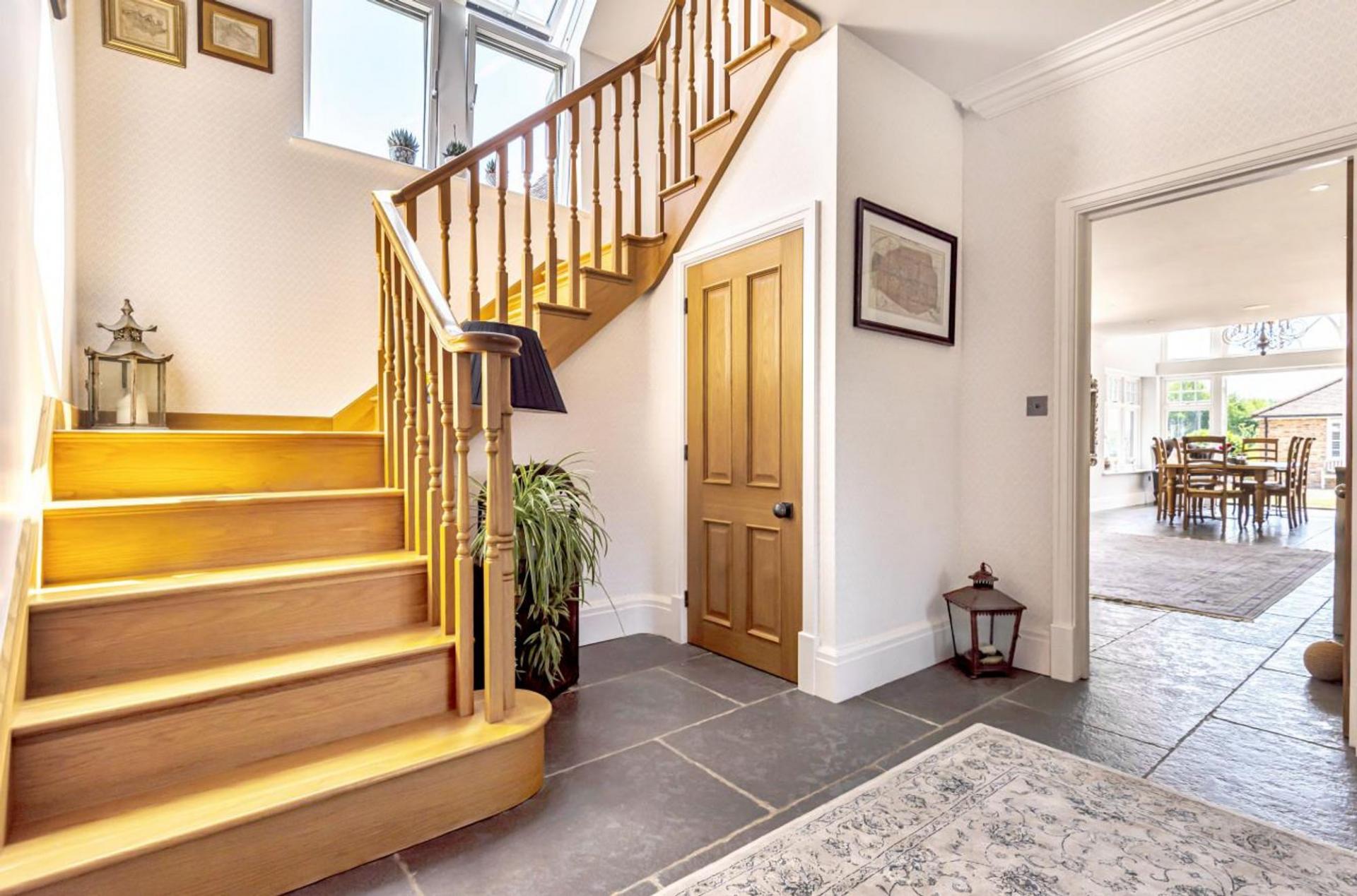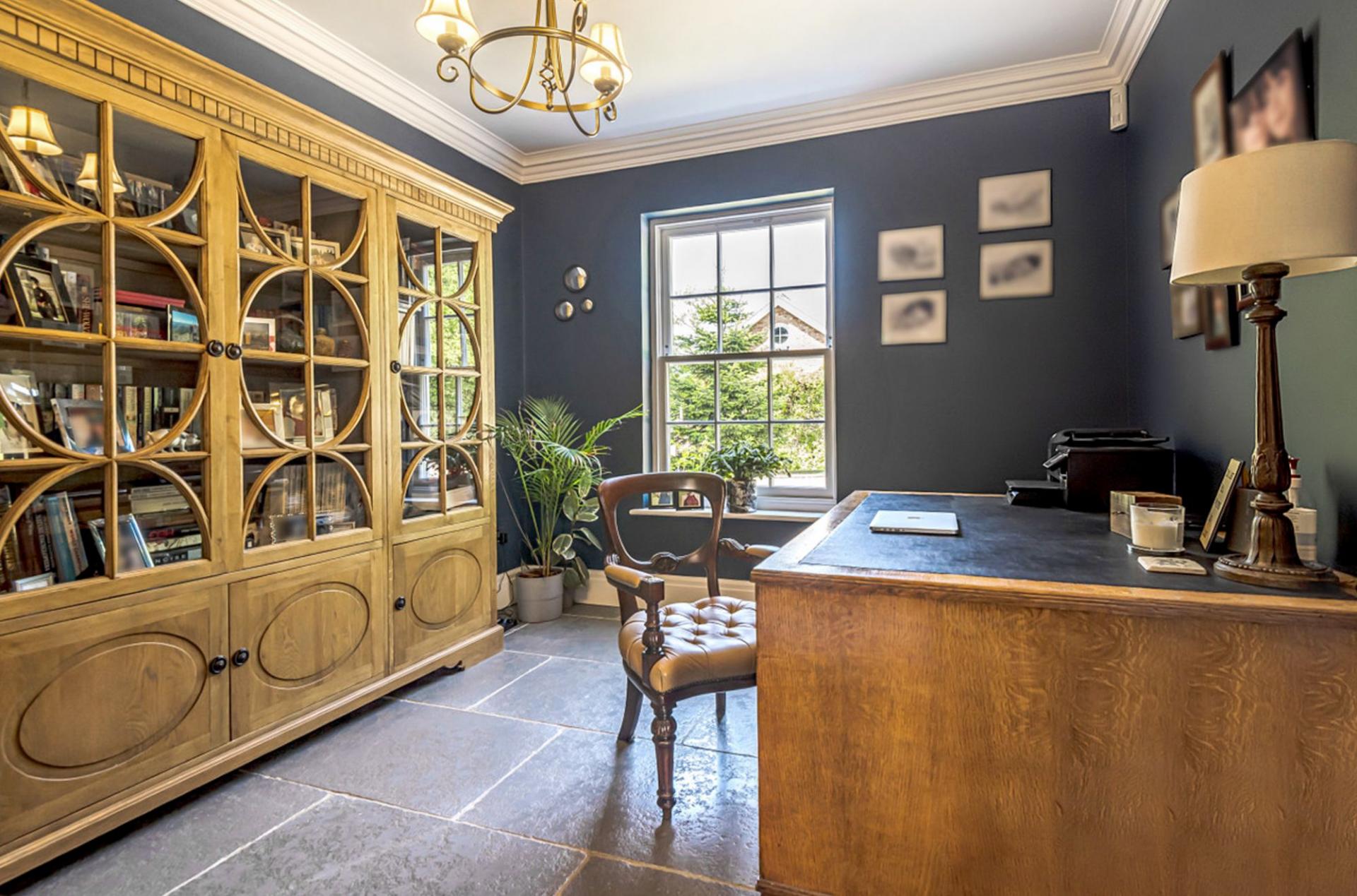 A subtle brick façade, Mumford & Wood sash windows, combined with a stone path leads you to an impressive entrance door, opening into the wonderful light filled reception hallway. Flagstone tiled floors coupled with underfloor heating extend to the entire ground floor. A turned American oak staircase leads to the first floor, detailed tooled cornice, Sonos sound system, four panelled oak doors with Jim Lawrence hardware denote the detailing of the home. The study/home office is located off the hallway enjoying views across the front gardens.