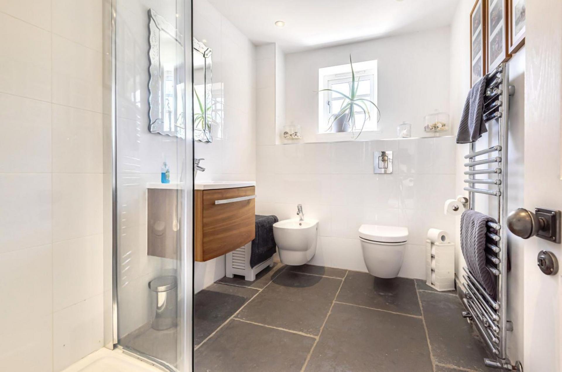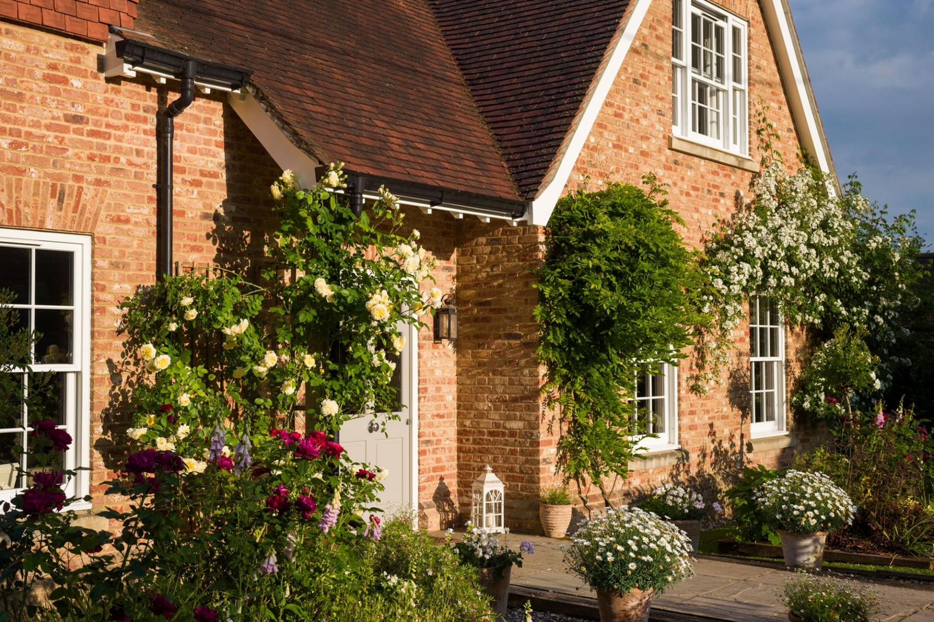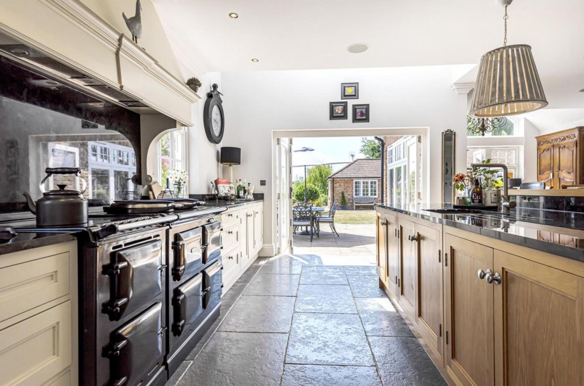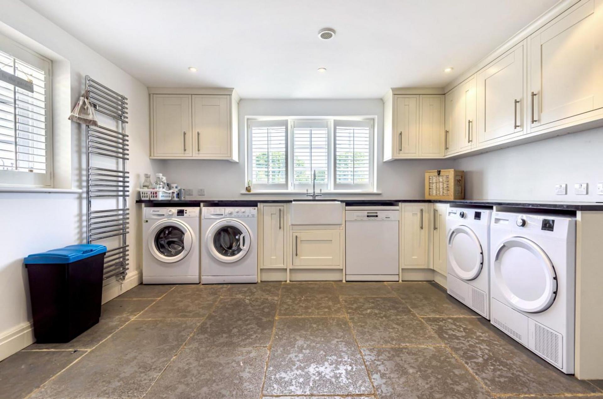 A subtle brick façade, Mumford & Wood sash windows, combined with a stone path leads you to an impressive entrance door, opening into the wonderful light filled reception hallway. Flagstone tiled floors coupled with underfloor heating extend to the entire ground floor. A turned American oak staircase leads to the first floor, detailed tooled cornice, Sonos sound system, four panelled oak doors with Jim Lawrence hardware denote the detailing of the home. The study/home office is located off the hallway enjoying views across the front gardens.