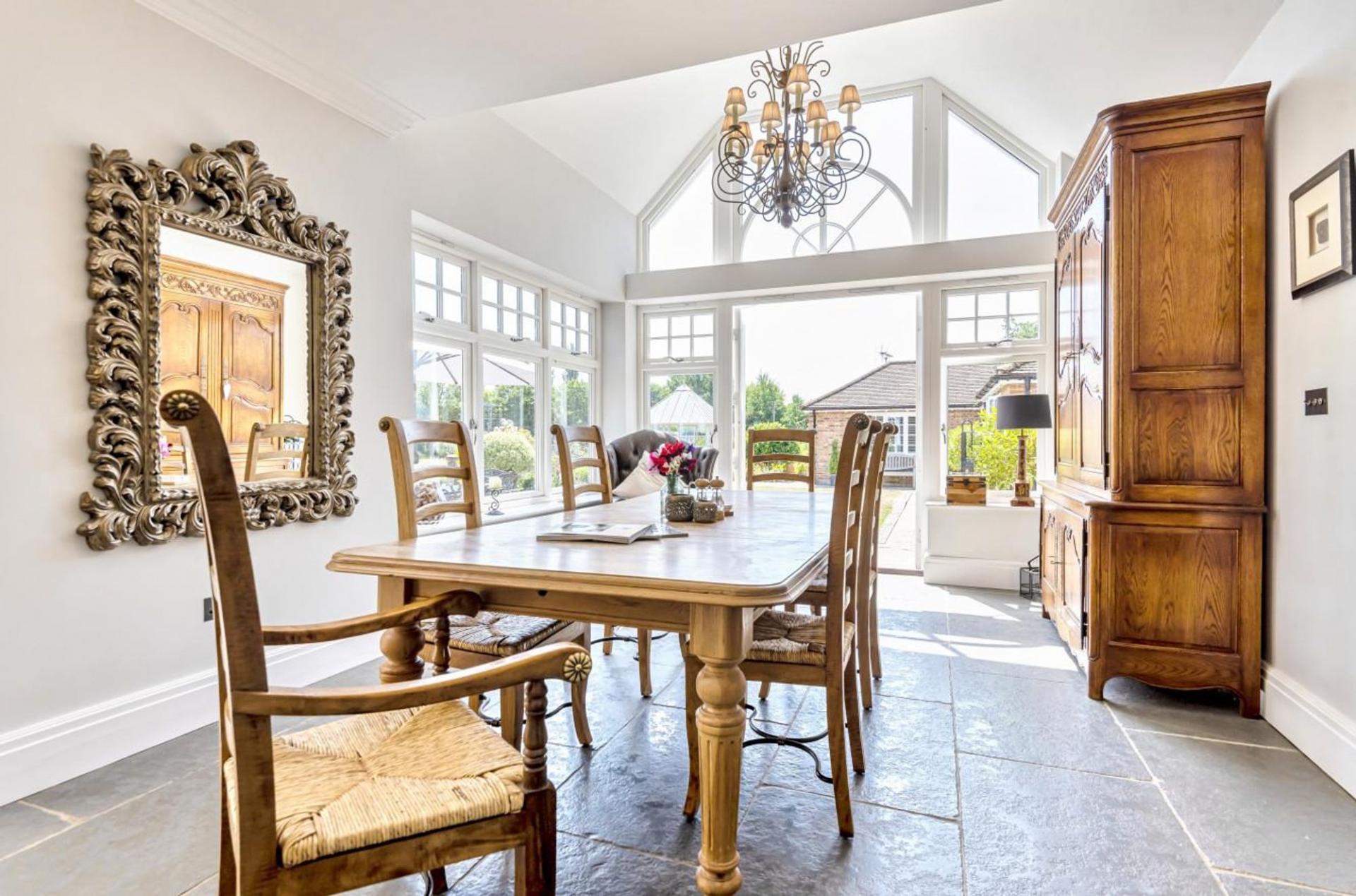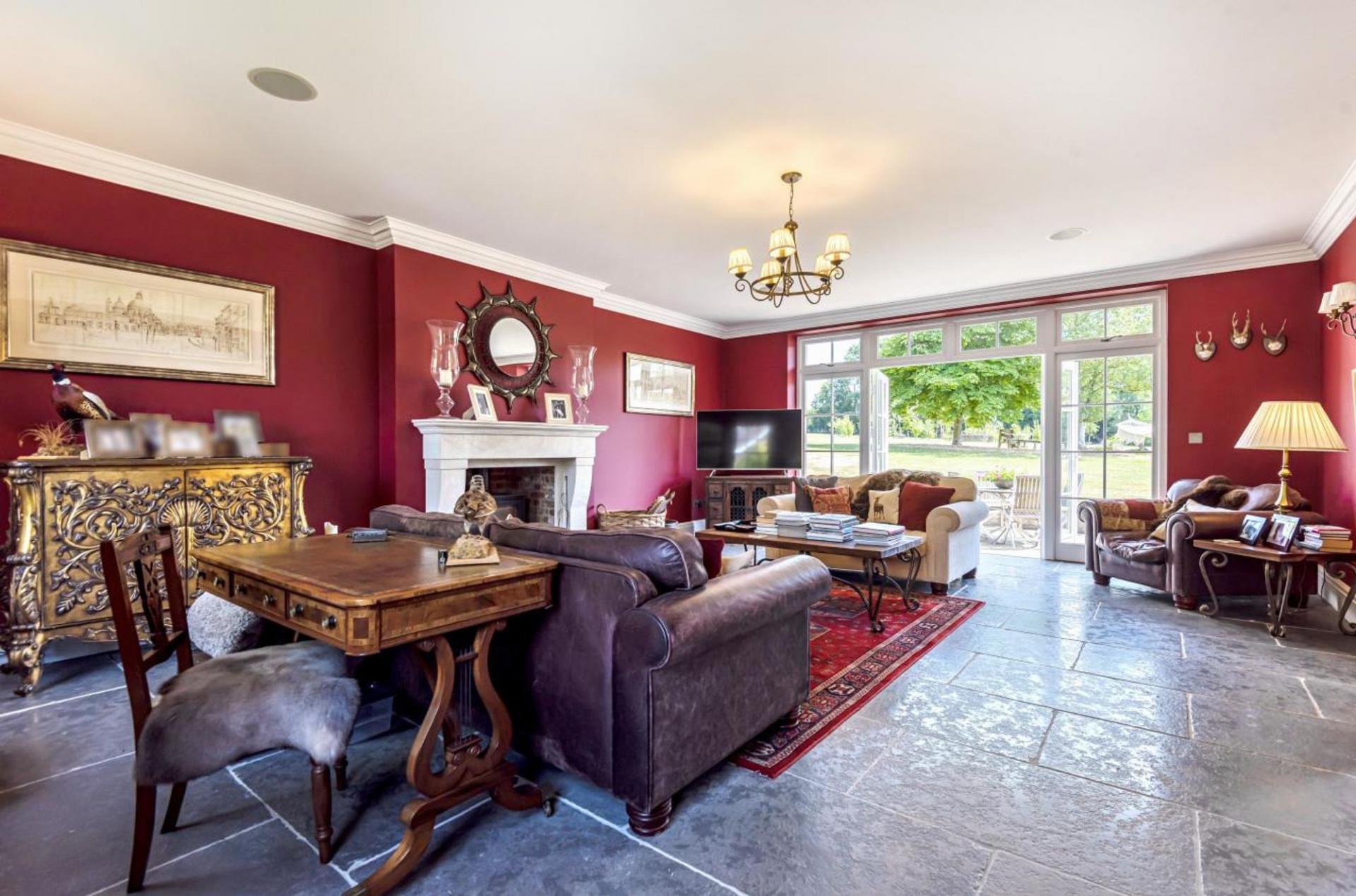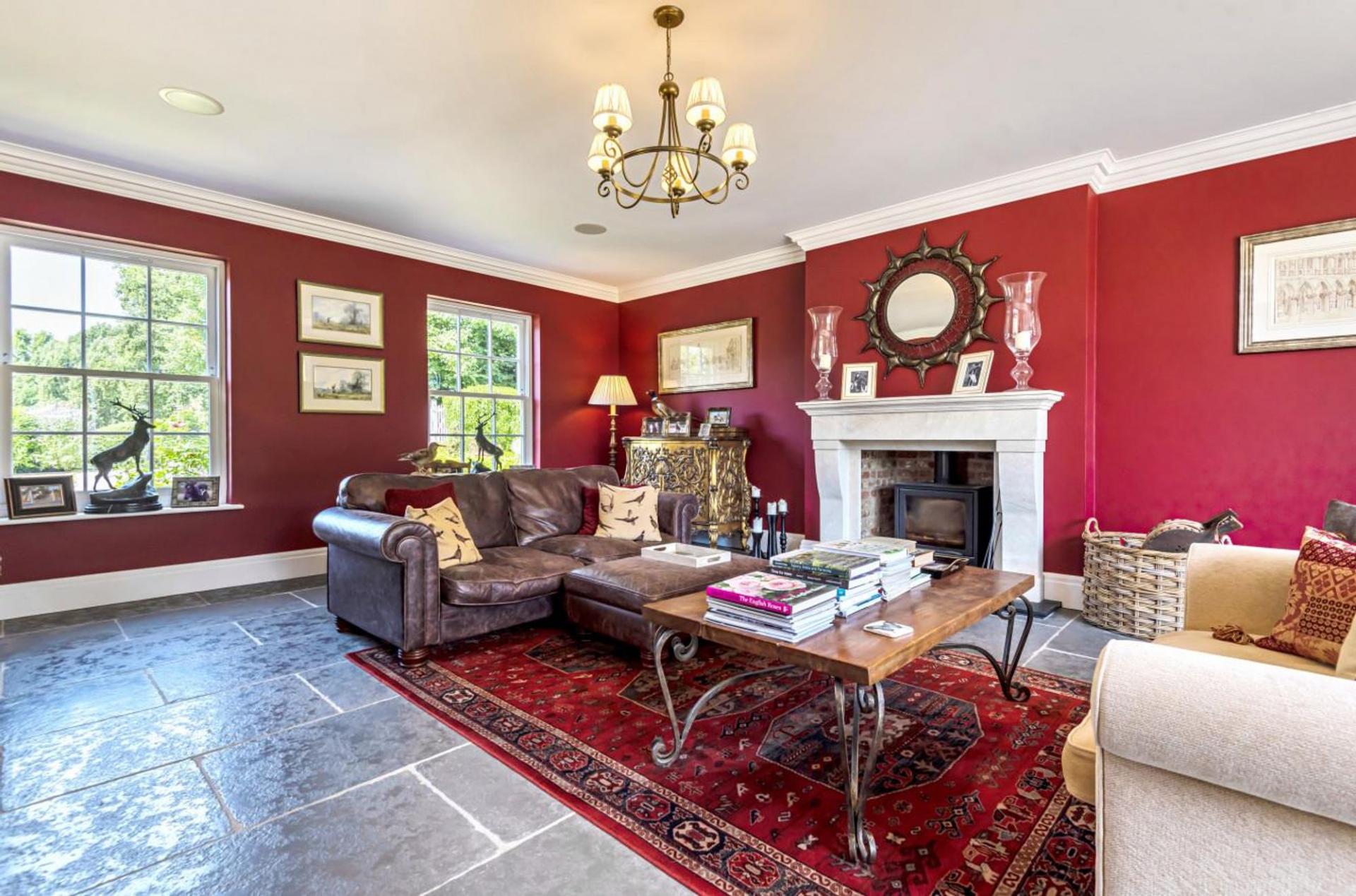 An elegant, spacious dual aspect sitting room with natural stone fireplace and log burning stove has French doors opening onto the patio and enticing gardens beyond.