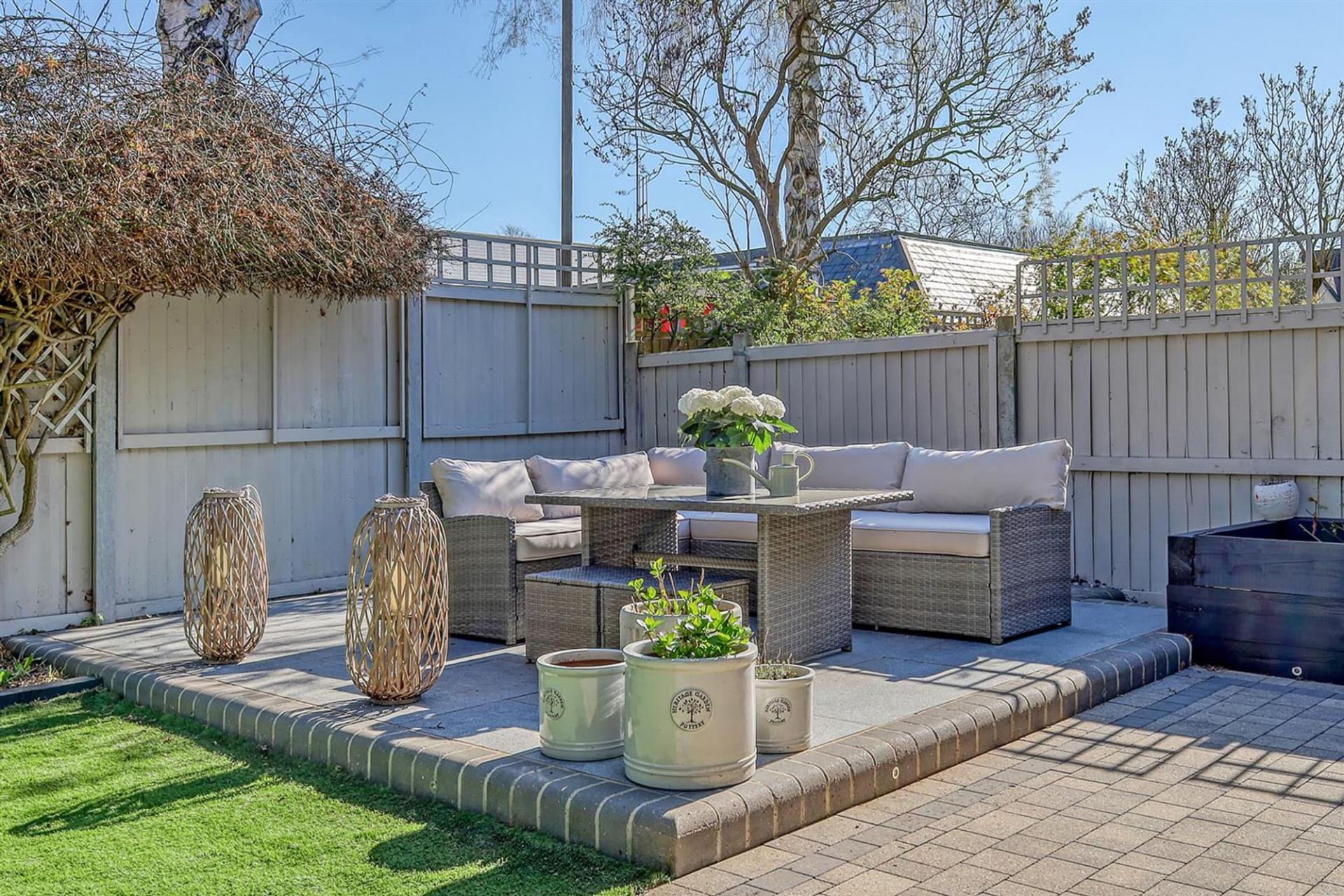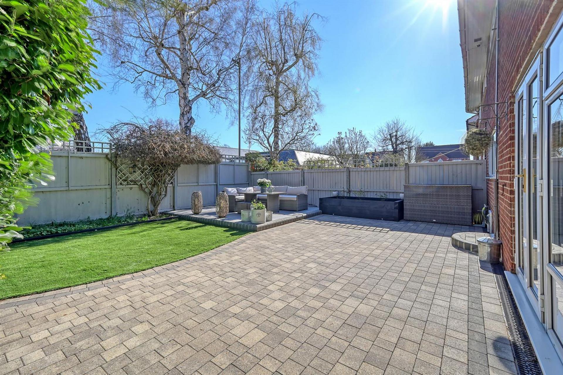 The rear garden is designed for both relaxation and entertaining, featuring a block-paved patio accessible directly from the house, as well as an additional paved seating area in the back corner, perfect for outdoor dining.