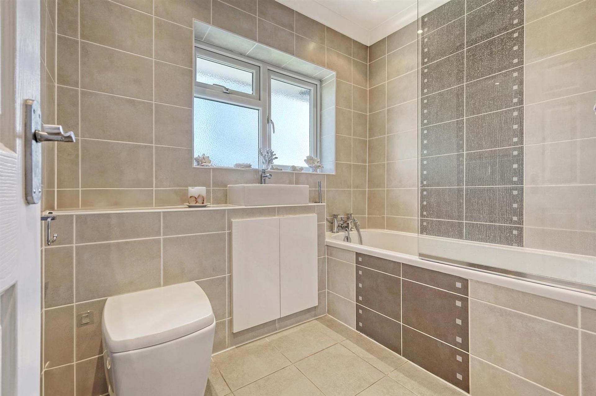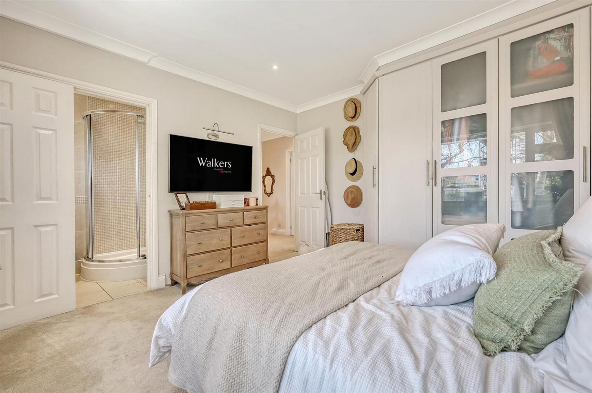 Upstairs, a spacious landing with a large storage/airing cupboard leads to three well-proportioned double bedrooms, all featuring fitted wardrobes. The principal bedroom enjoys the luxury of an en suite bathroom with a shower, while the remaining two bedrooms are served by a family bathroom with a shower over the bath.