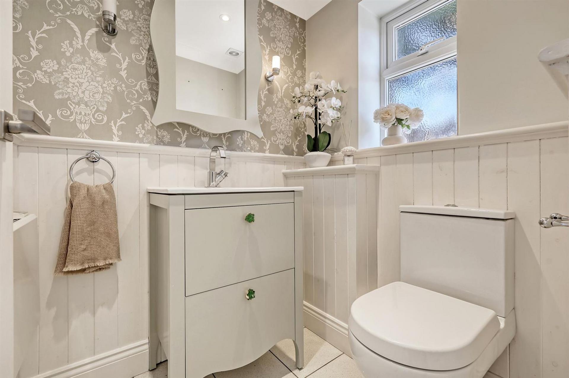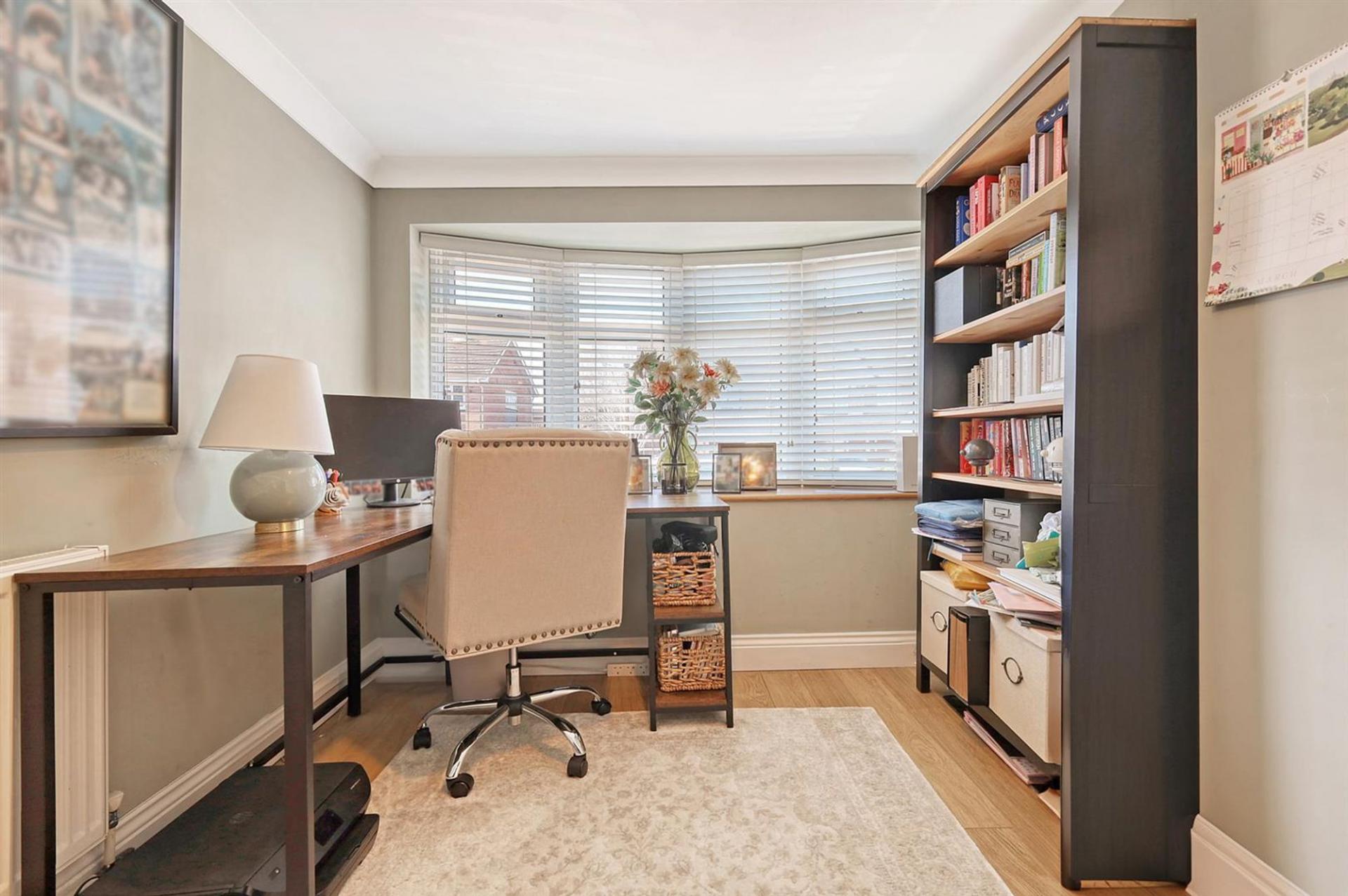 The property is approached via a paved driveway, providing ample off-street parking for multiple vehicles. Upon entering, a wide hallway leads to the well-planned ground floor accommodation, which includes a study, a utility room, a WC, and a kitchen. The spacious double reception room benefits from a dual aspect, offering an abundance of natural light, generous proportions, and double doors to the garden. Additionally, the property benefits from integral access to the garage, adding to its practicality and convenience.
