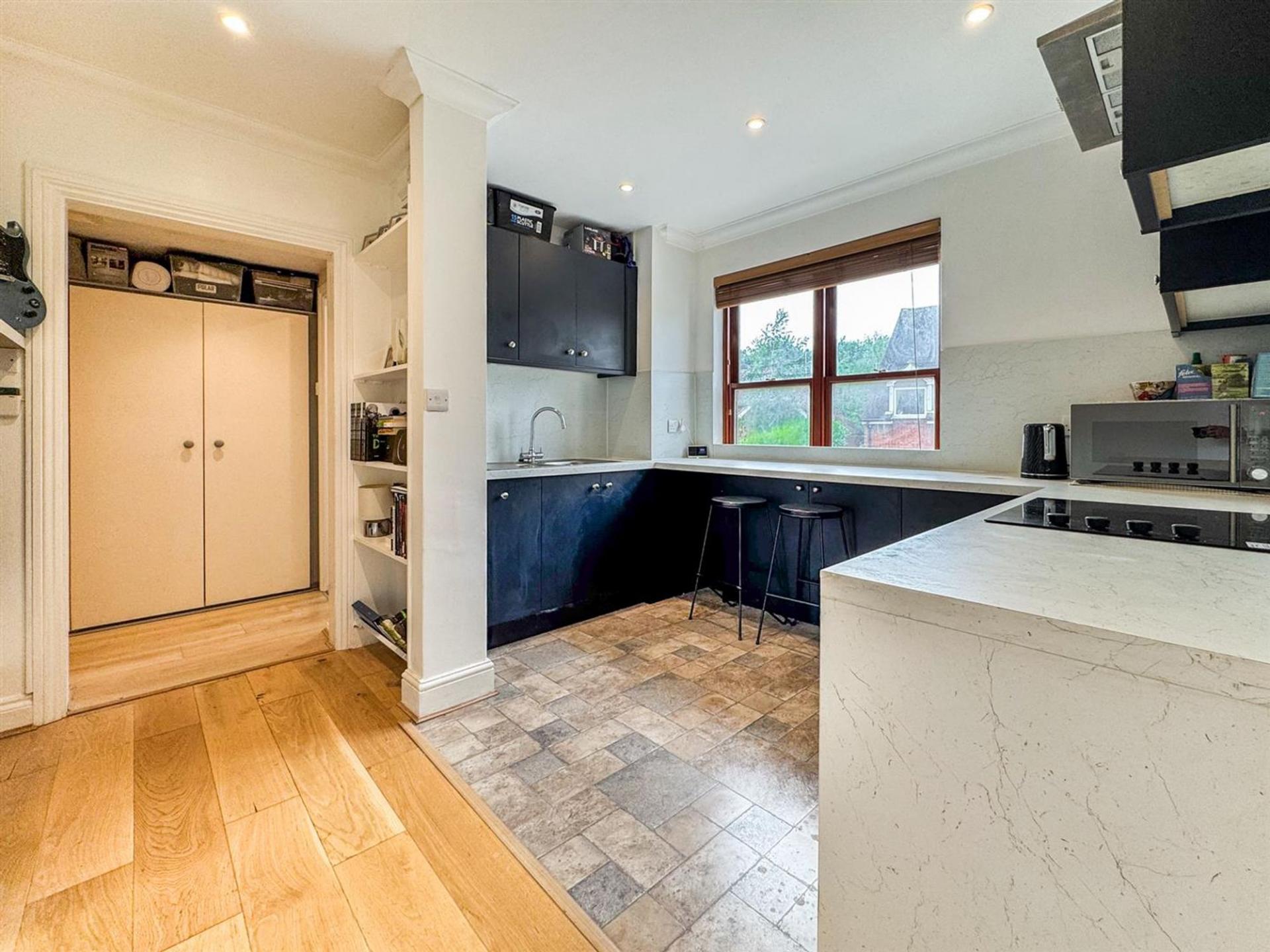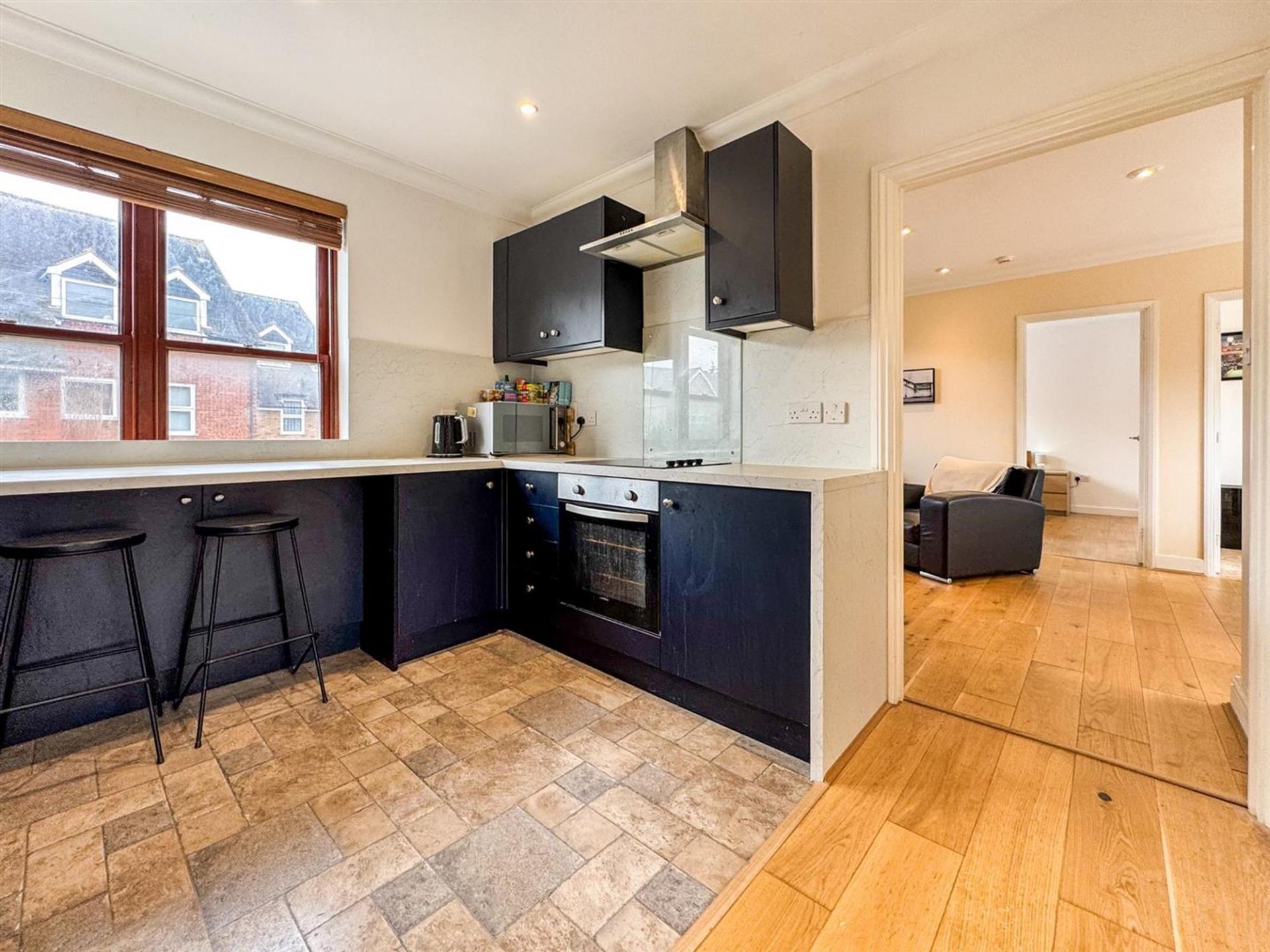 On entering the apartment you are greeted by the space and light of the property which continues throughout. The hallway provides fitted wardrobes for excellent storage and access to a good sized four-piece family bathroom which has recently been renovated. Leading from the hall is the modern fitted kitchen which includes an integrated oven, electric hob, fridge freezer and breakfast bar with lots of cabinetry for ample storage. Adjacent to the kitchen is the second double bedroom which is of good size and looks across views of the village.