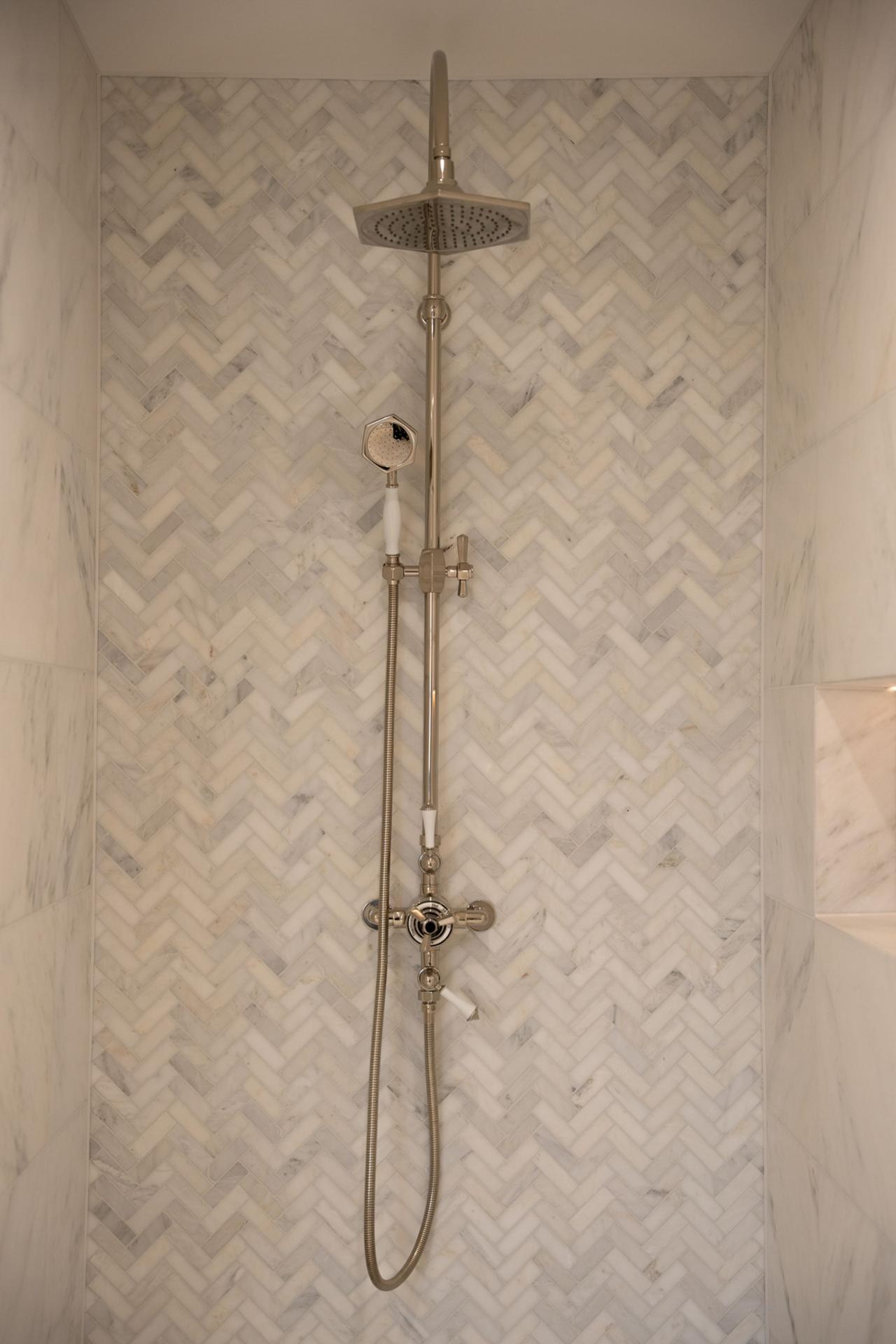 Bathrooms are refined, featuring Haddon sanitaryware and the sculptural Hampton freestanding stone bath. Master suites are finished with Savoy honed marble, laid in herringbone with marble skirting and detailed trim, whilst further en-suites benefit from large-format Italian Breccia porcelain, combining polished wall finishes with practical matte flooring. Corston lighting and bespoke black oak niches provide depth and contrast throughout.