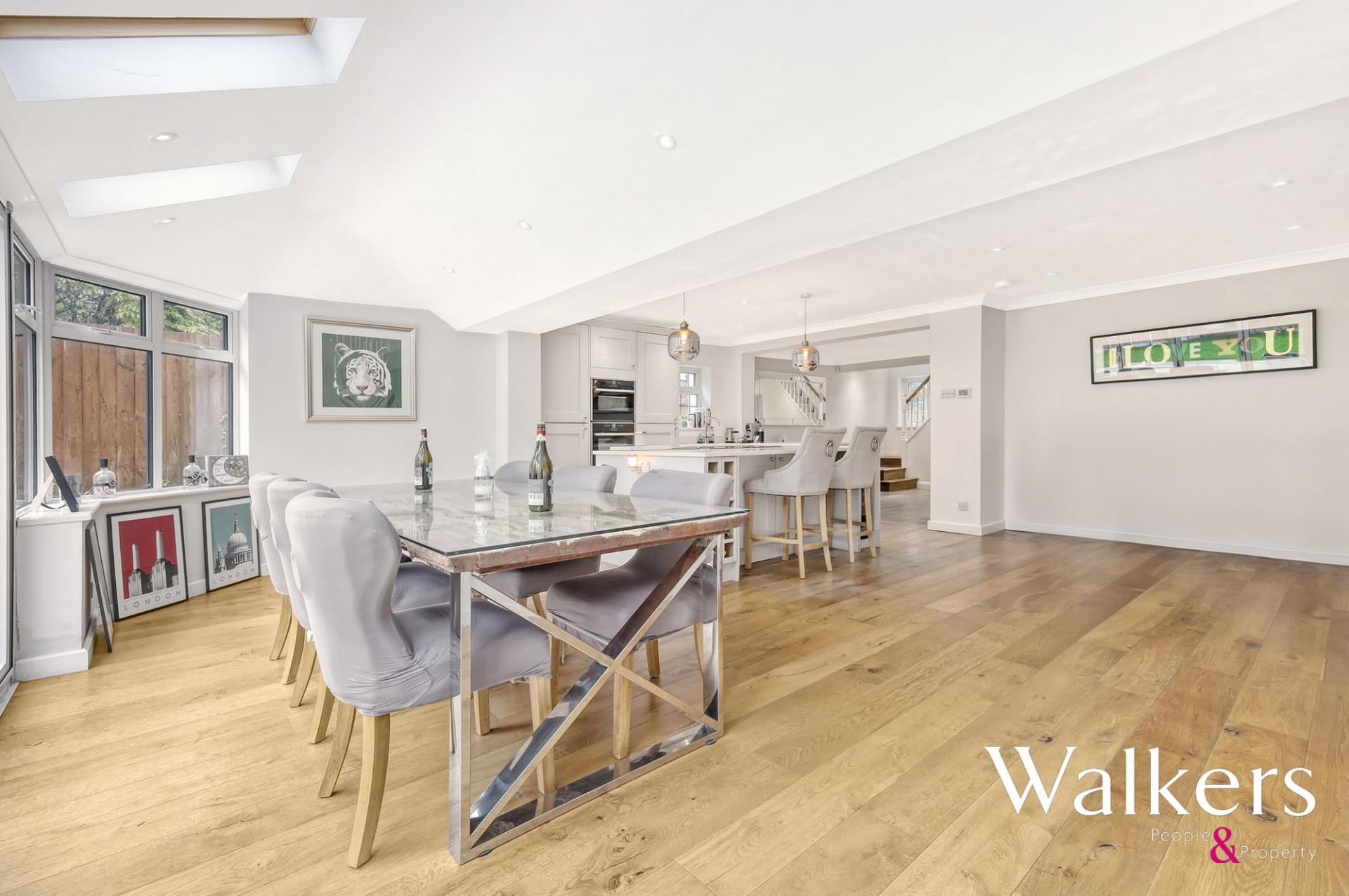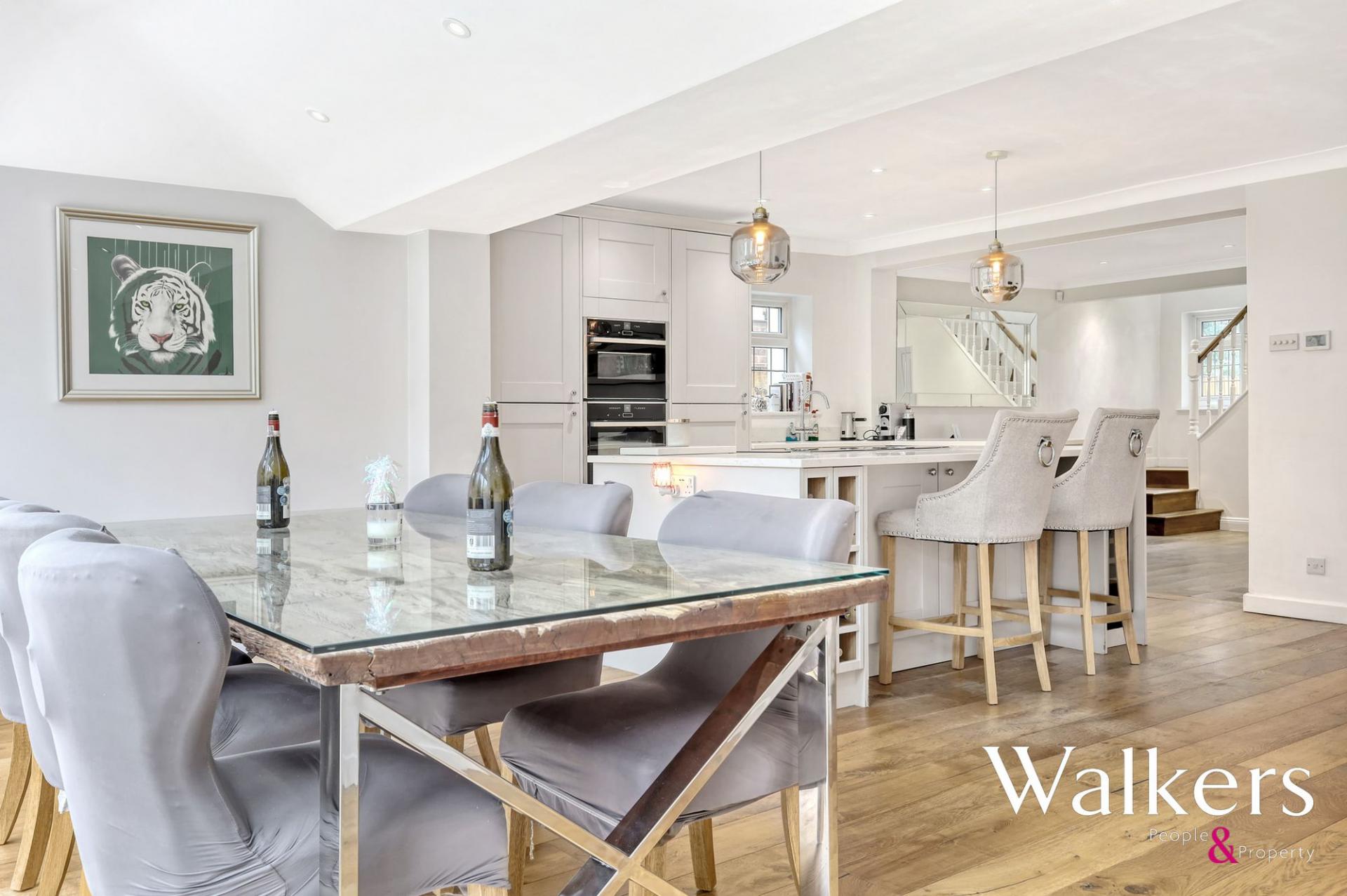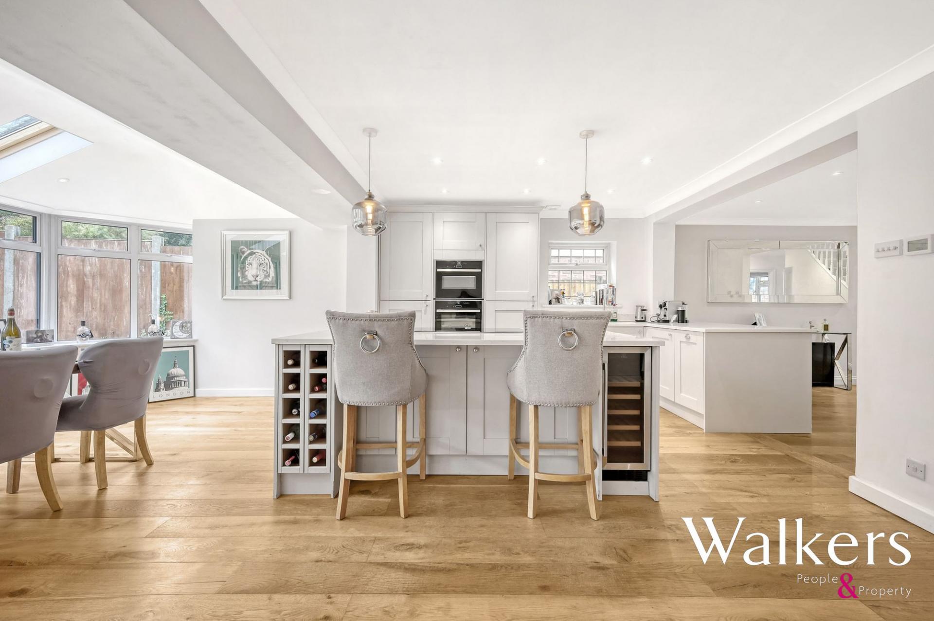 On entering the home, you are welcomed into a bright and inviting entrance hall fitted with engineered wood flooring which runs throughout the whole of the ground floor. There is also a convenient cloakroom/wc and storage cupboard. The home has a front reception/sitting room with marble fireplace and attractive bay window. From the central hallway is a spacious open plan family living space which could be ideal as an additional sitting room or child’s playroom, this leads to a large kitchen/dinner with a further area for seating. The newly renovated kitchen benefits from an extensive range of high-quality kitchen cabinetry complemented by quartz worksurfaces and a breakfast island with plenty of storage beneath. The kitchen includes a range of integrated appliances including a fitted oven, microwave, electric hob, extractor, and dishwasher. Bi-folding doors open onto the recently paved patio and lawned garden beyond.