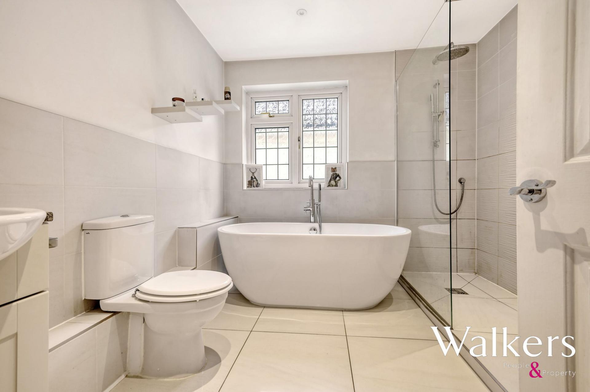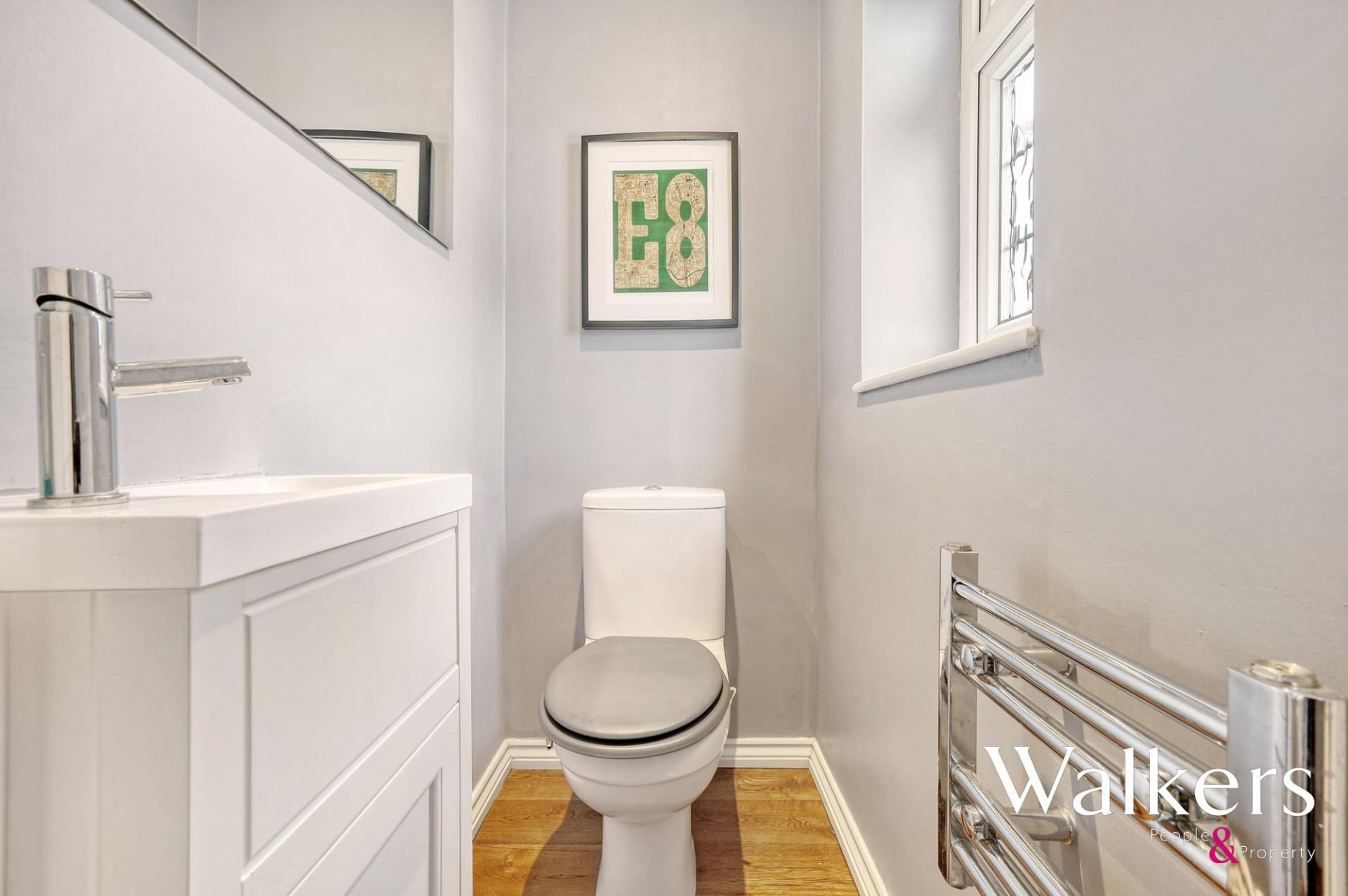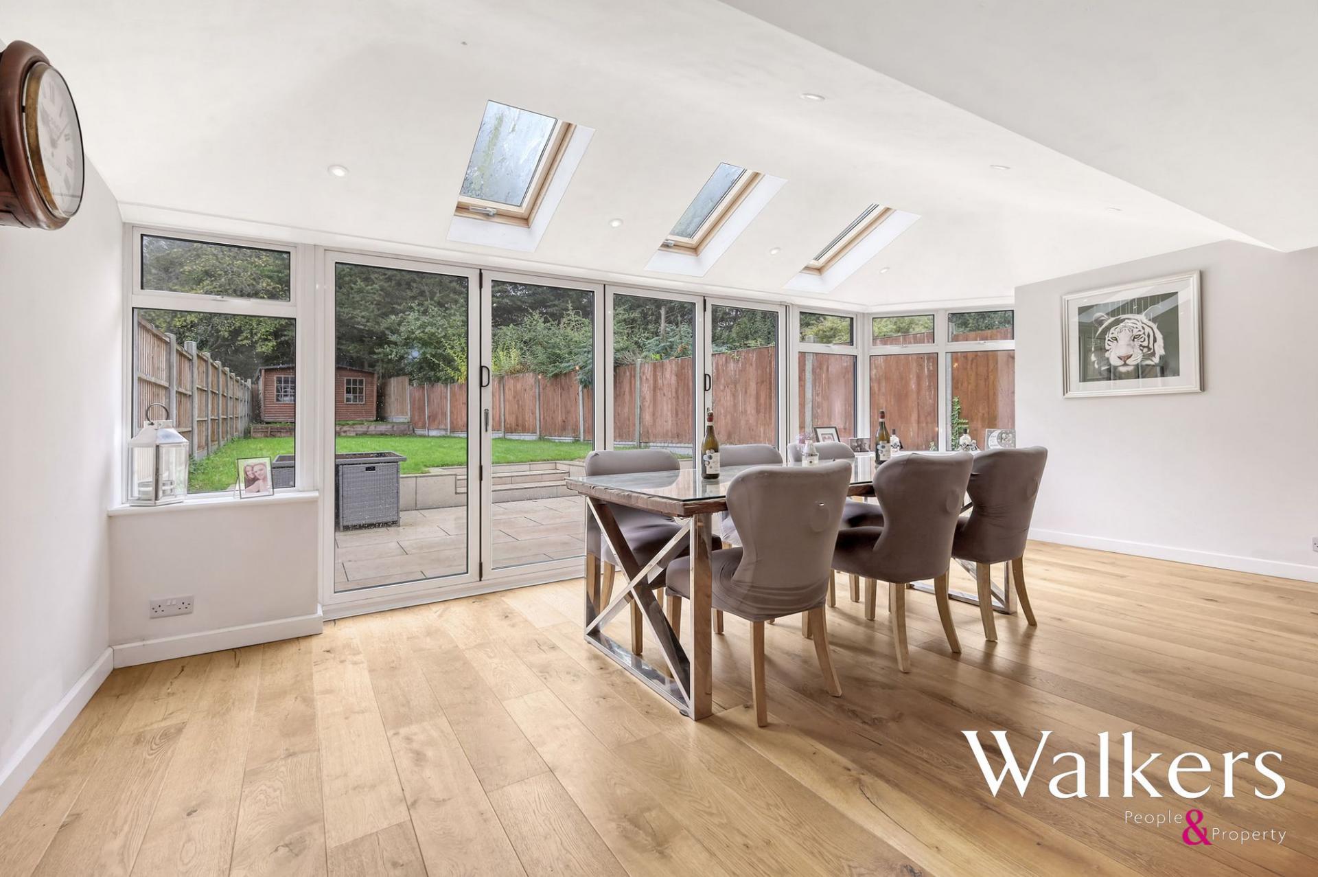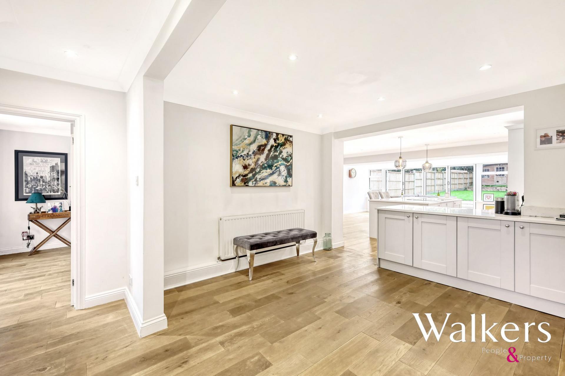 On entering the home, you are welcomed into a bright and inviting entrance hall fitted with engineered wood flooring which runs throughout the whole of the ground floor. There is also a convenient cloakroom/wc and storage cupboard. The home has a front reception/sitting room with marble fireplace and attractive bay window. From the central hallway is a spacious open plan family living space which could be ideal as an additional sitting room or child’s playroom, this leads to a large kitchen/dinner with a further area for seating. The newly renovated kitchen benefits from an extensive range of high-quality kitchen cabinetry complemented by quartz worksurfaces and a breakfast island with plenty of storage beneath. The kitchen includes a range of integrated appliances including a fitted oven, microwave, electric hob, extractor, and dishwasher. Bi-folding doors open onto the recently paved patio and lawned garden beyond.