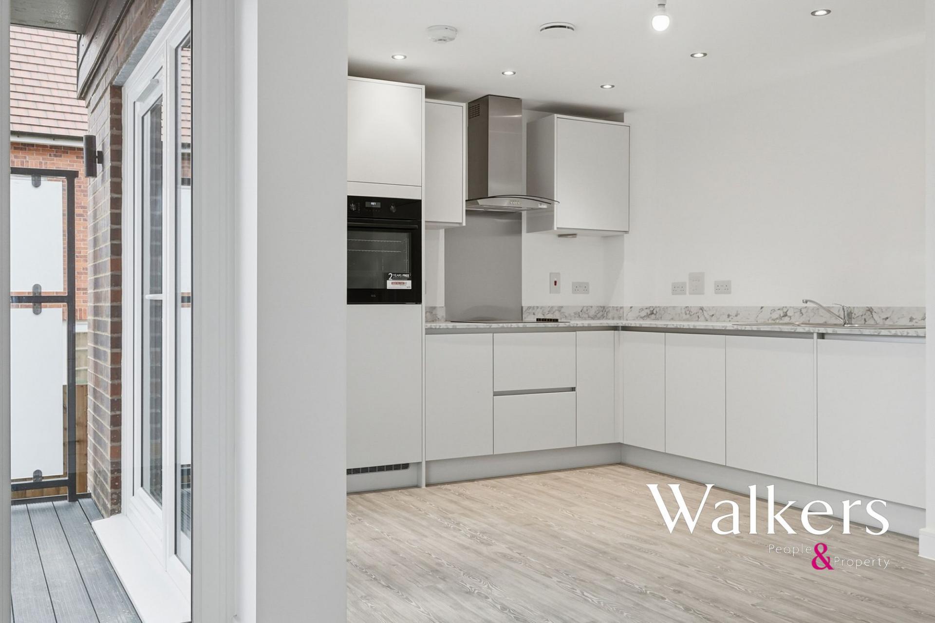 The apartment features a generous open-plan kitchen, dining and living area, thoughtfully arranged to create a bright and sociable space, ideal for both everyday living and entertaining. Fitted storage within the living area adds practicality, while doors open onto a private balcony, providing the perfect setting for outdoor dining or relaxing in warmer months.