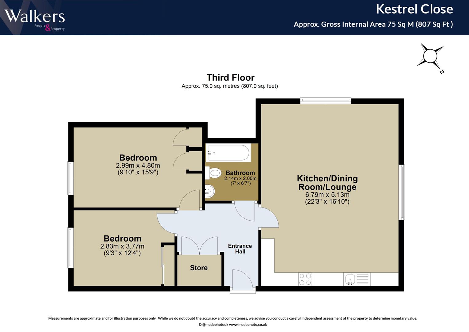 The apartment offers approximately 807 sq. ft. (75 sq. m) of well-proportioned living space. The heart of the home is a stunning open-plan kitchen, dining, and lounge area measuring over 22 feet in length, designed to create a bright and welcoming environment perfect for relaxing or entertaining. Large windows allow natural light to flood the space, highlighting the stylish, neutral décor and high-quality finishes throughout.