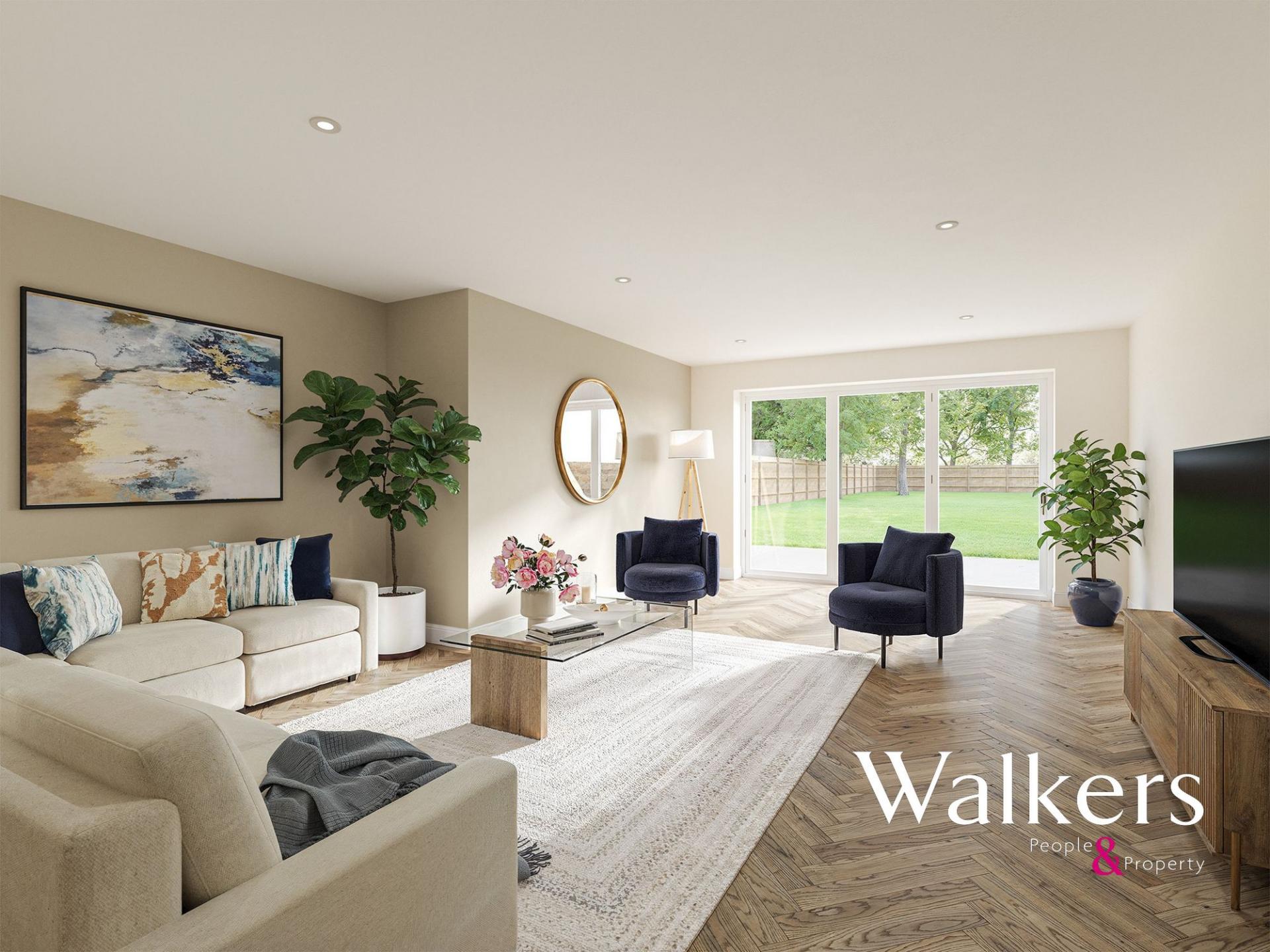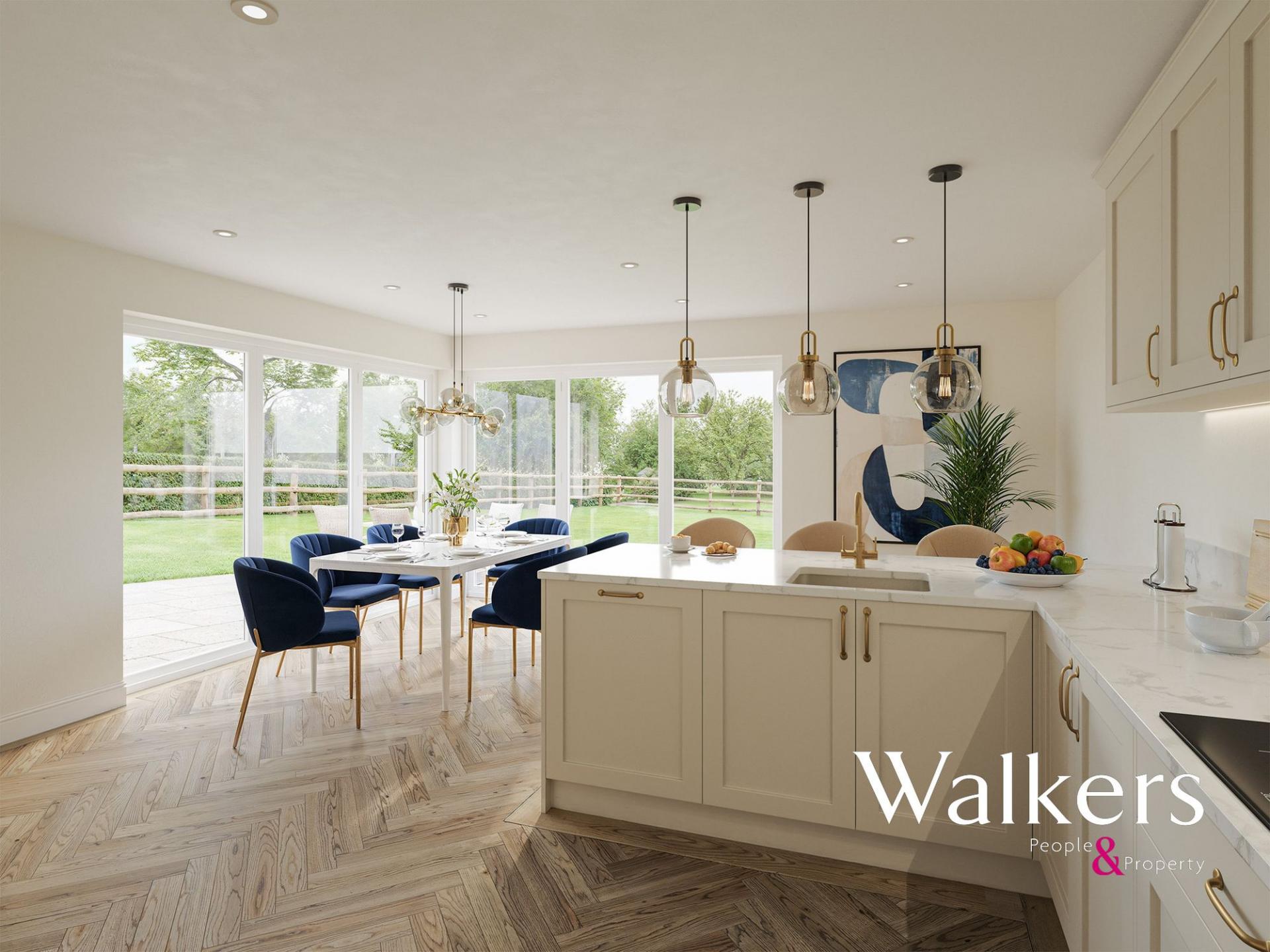 Designed with modern family living in mind, the property provides spacious and well-balanced accommodation, combining contemporary finishes with high-quality materials throughout. The ground floor is centred around a superb open-plan kitchen and dining space, fitted with a stylish Symphony kitchen, quartz worktops, and a full range of AEG integrated appliances, creating the perfect space for both everyday living and entertaining. Generous living areas benefit from excellent natural light and views across the rear garden and countryside beyond.